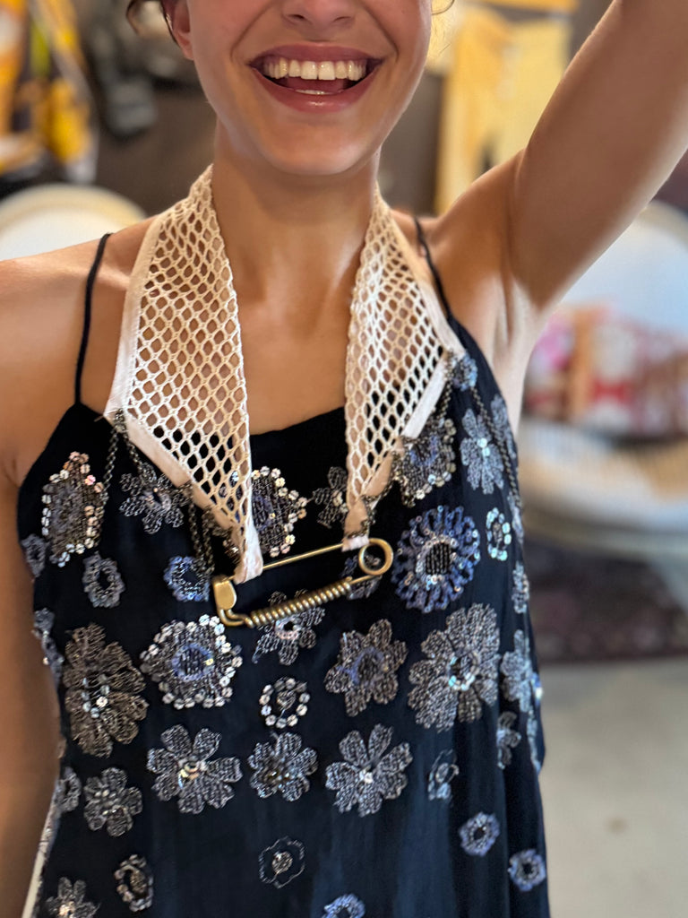 One-of-one in-studio creation. Mesh collar circa 1930’s fashioned with bronzed chain and large safety pin as front closure. Somewhere between a collar and a necklace. A piece of artwork. Mixed materials, hand sewn.
