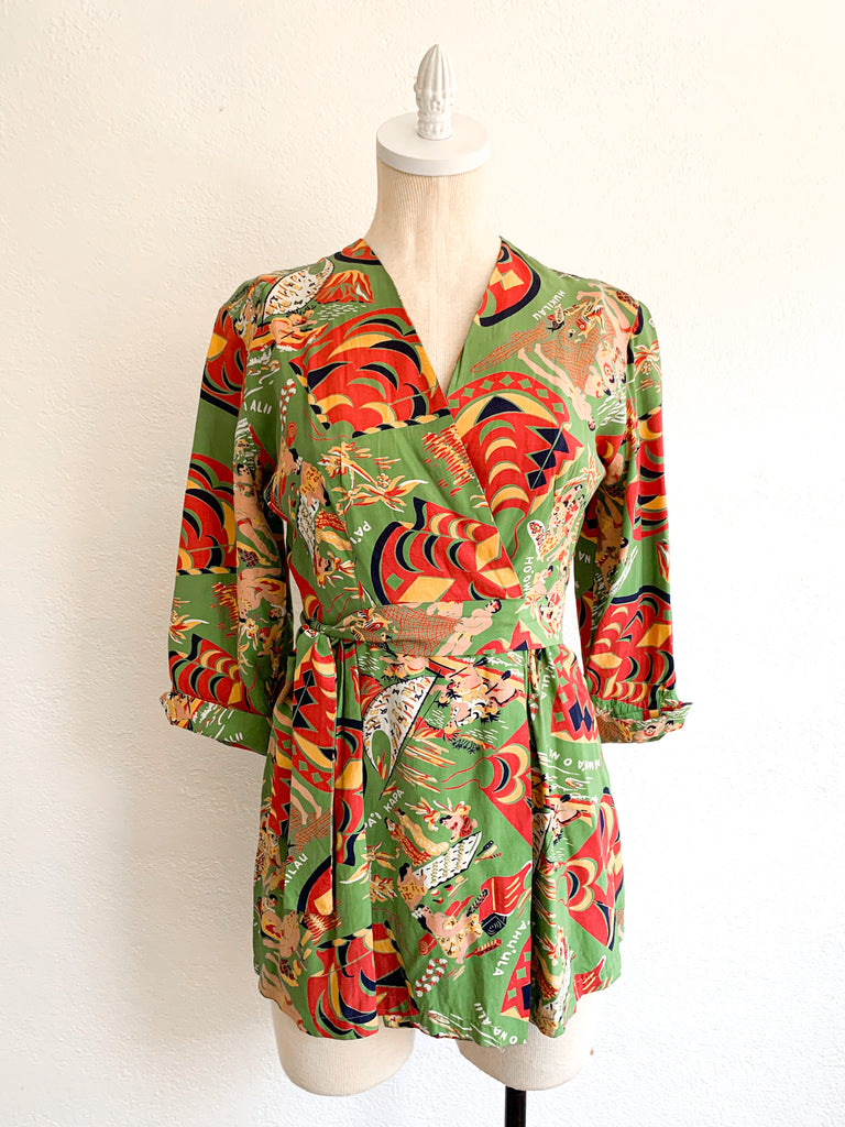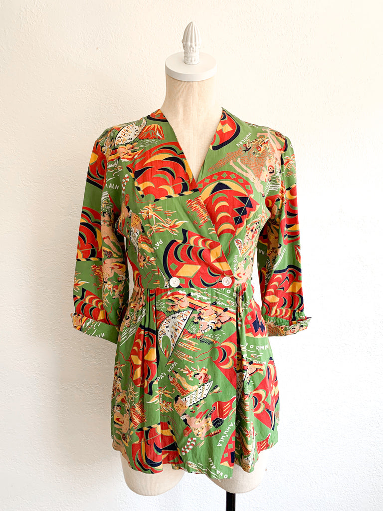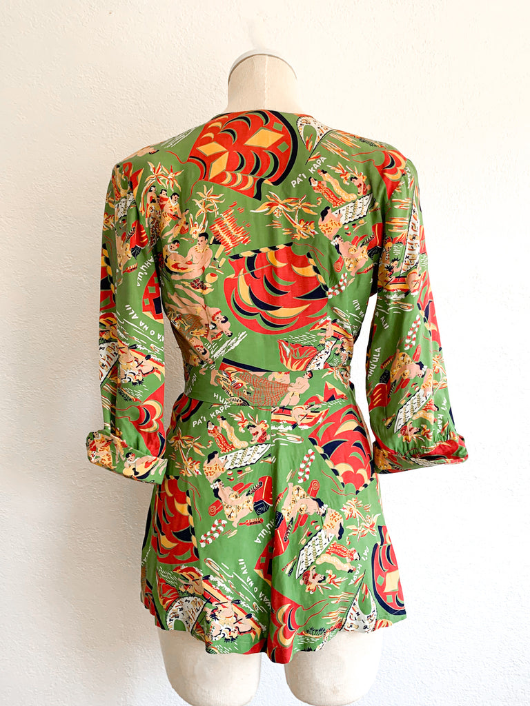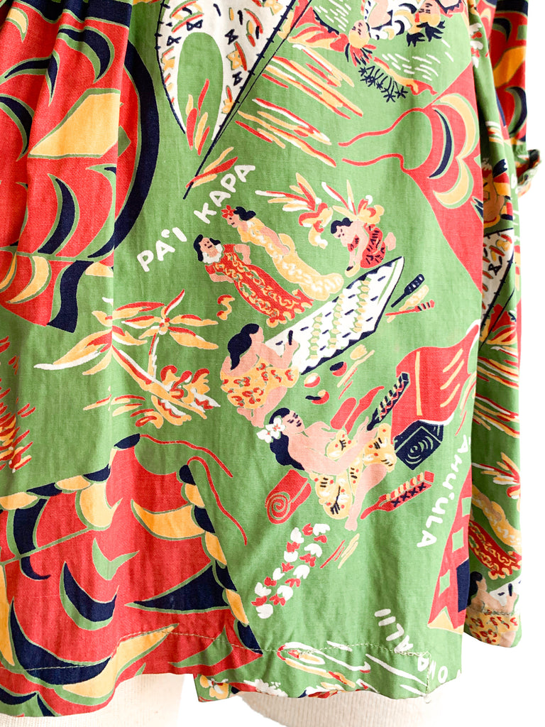 When ohana (family) gather to celebrate with one another they prepare meals, have luau, dance the hula, make lei…this is the Hawaiian way and is depicted on the print in this 1940’s cold rayon dress or jacket. Some of the terms in this dress like Pa'i Kapa is the process of printing native designs on kapa cloth and hukilau is when the community comes together to fish with a net made from ti leaves. As a native Hawaiian I am particularly attracted to the print as it is nostalgic of the sense of community, Hawaiian spirit and Aloha (love and fellowship) that is shared when people come together to create!