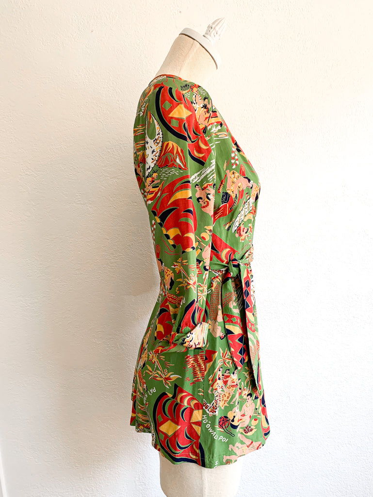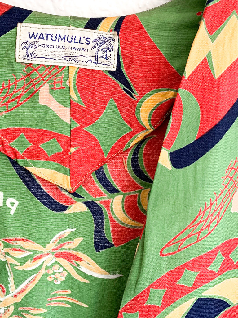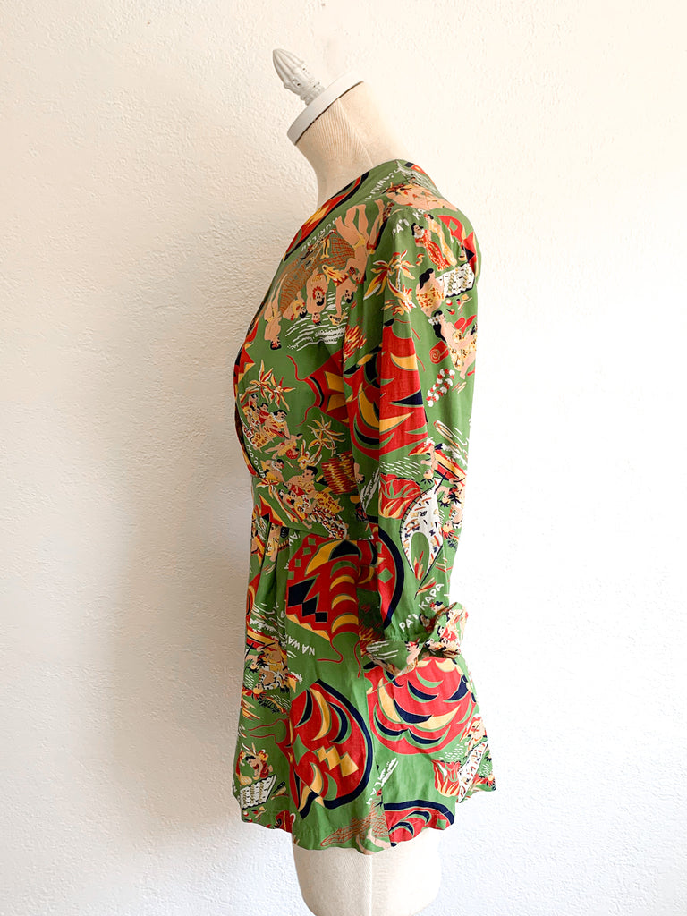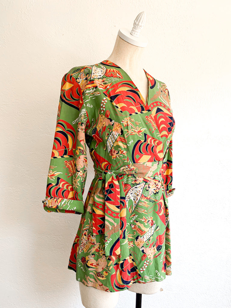 When ohana (family) gather to celebrate with one another they prepare meals, have luau, dance the hula, make lei…this is the Hawaiian way and is depicted on the print in this 1940’s cold rayon dress or jacket. Some of the terms in this dress like Pa'i Kapa is the process of printing native designs on kapa cloth and hukilau is when the community comes together to fish with a net made from ti leaves. As a native Hawaiian I am particularly attracted to the print as it is nostalgic of the sense of community, Hawaiian spirit and Aloha (love and fellowship) that is shared when people come together to create!