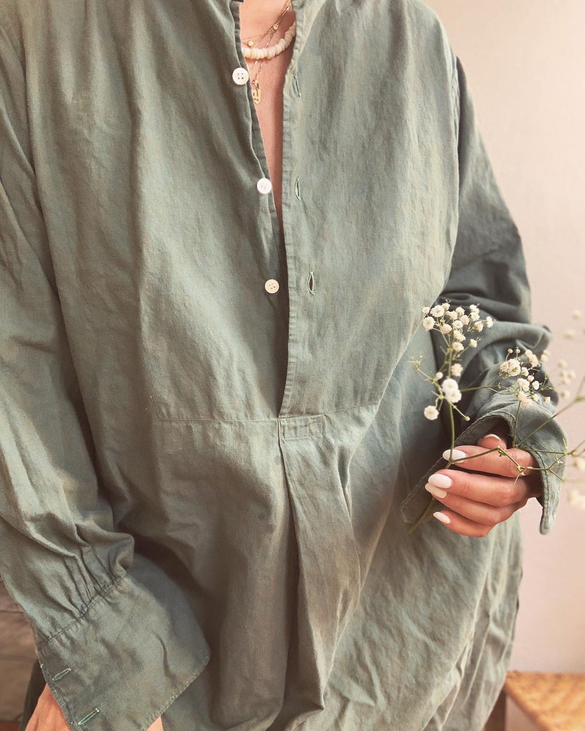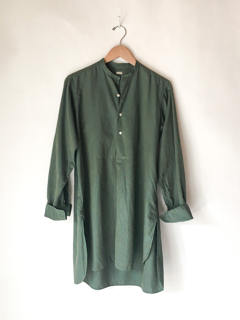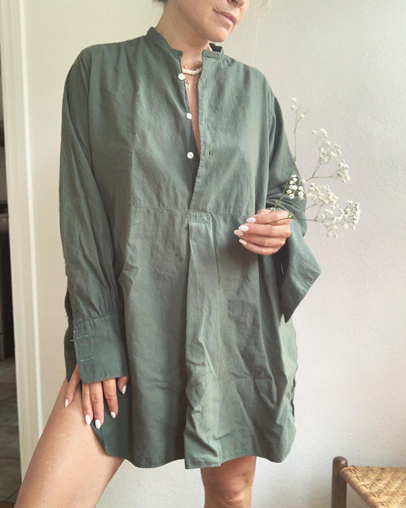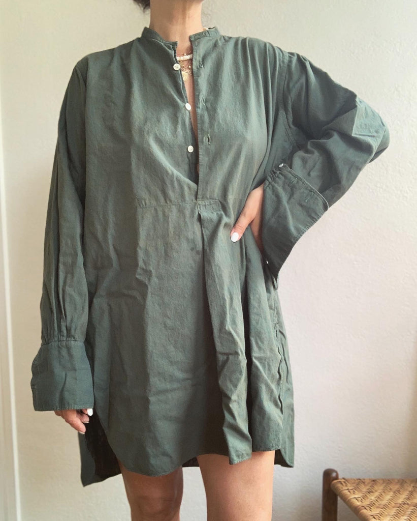 Soft European cotton tunic shirt circa 1930/40’s made for men, but equally fabulous as a dress or layering piece for women. We especially gravitate toward garments that can be worn by everyone. French cuffs, recommend cuff links or rolling sleeves.