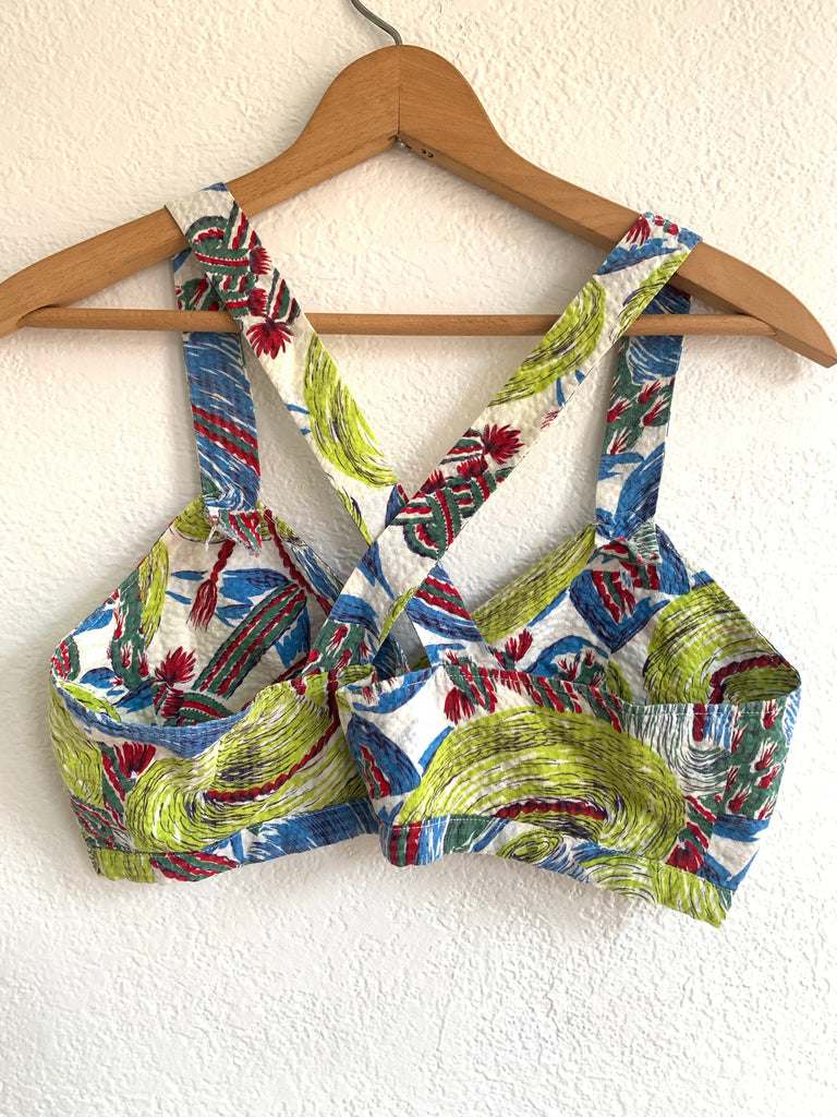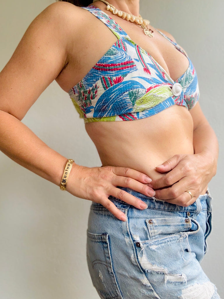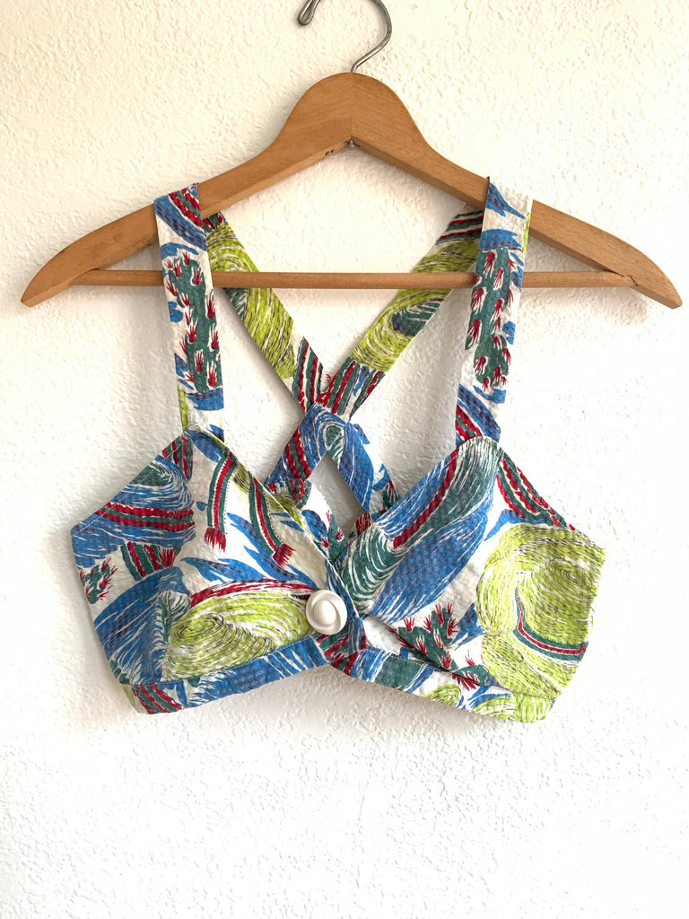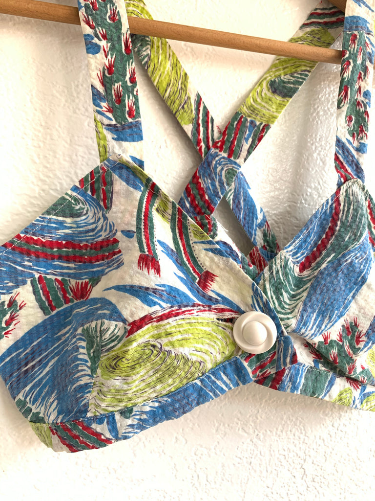 Bralette halter top with a tropical or desert leaf print in green, blue and magenta on white made in 1940’s/50’s. Fastens at front with single plastic button, cross crosses at back.