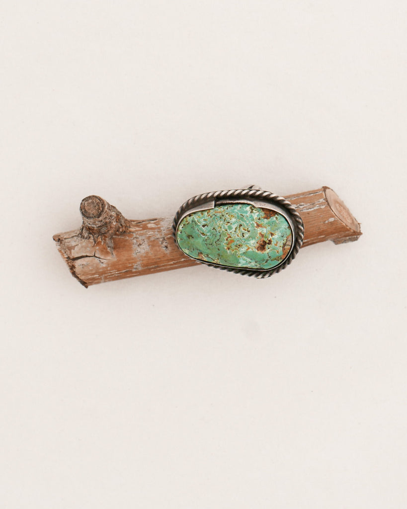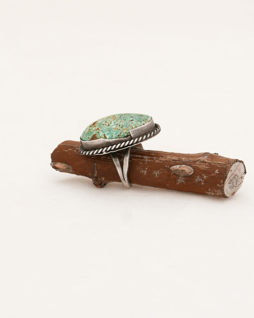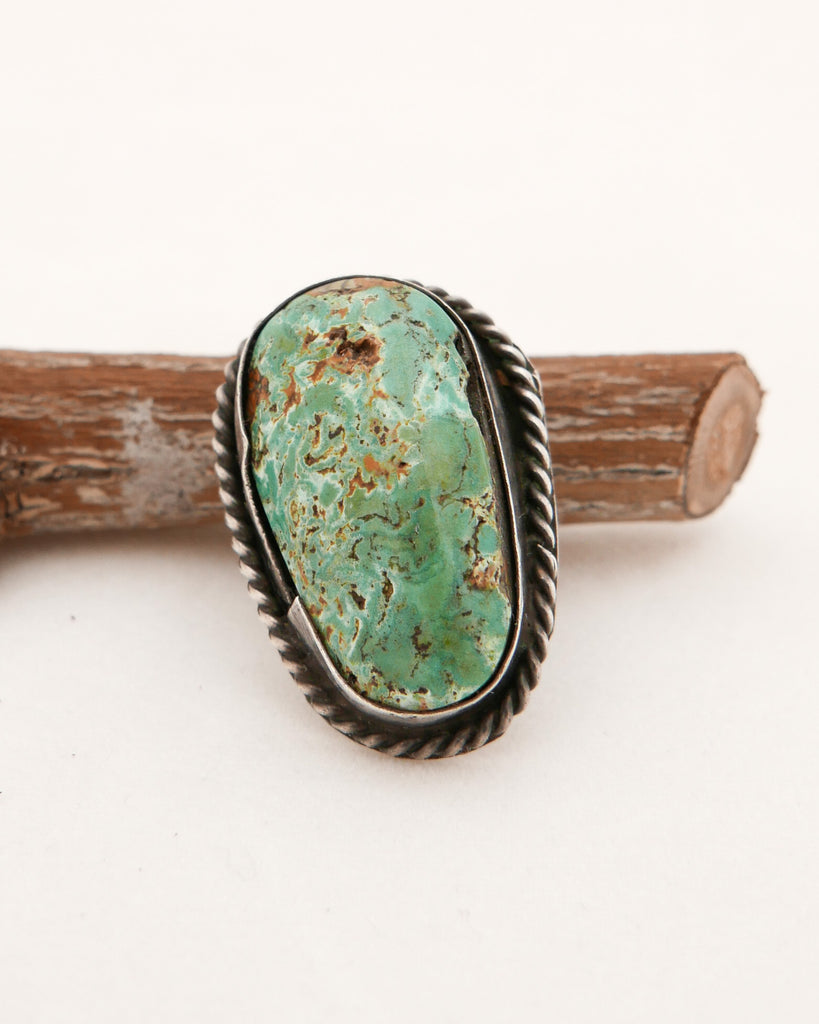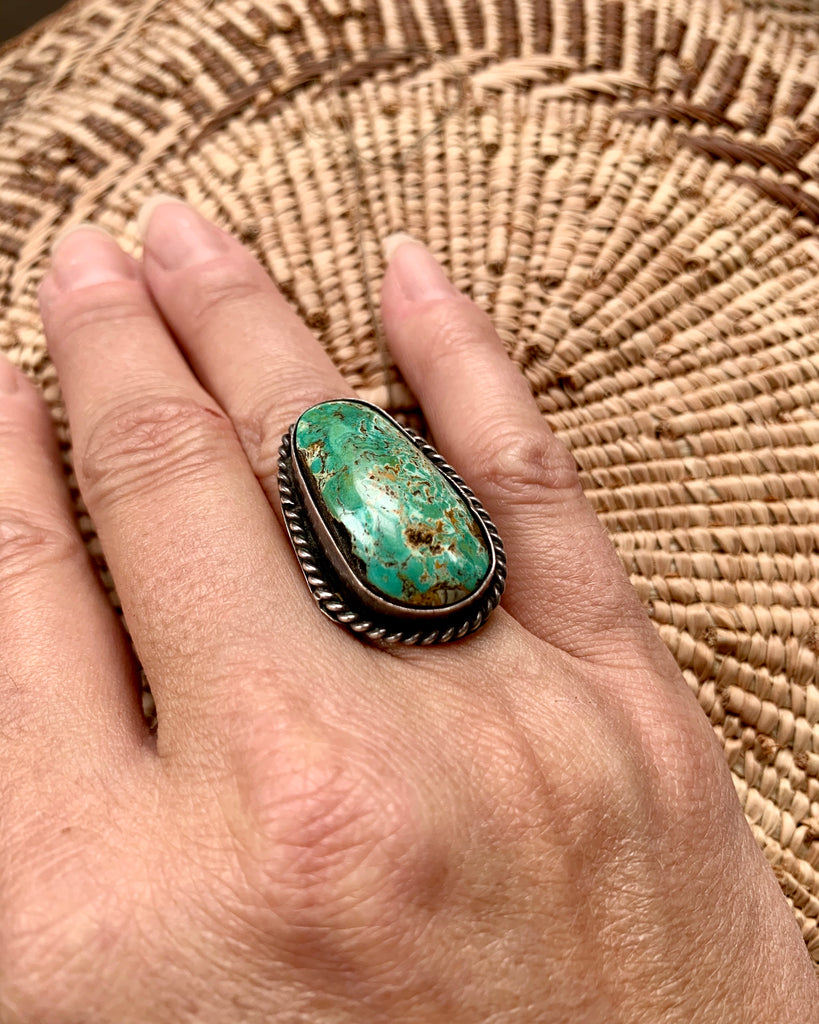 Statement turquoise sterling silver ring circa 1950/60’s. Green with bronze and cream colored matrix visible this large impressive stone. Cabochon is encircled with the twisted sterling wire and set on a split shank band.