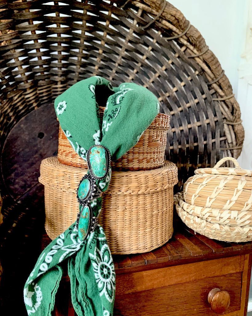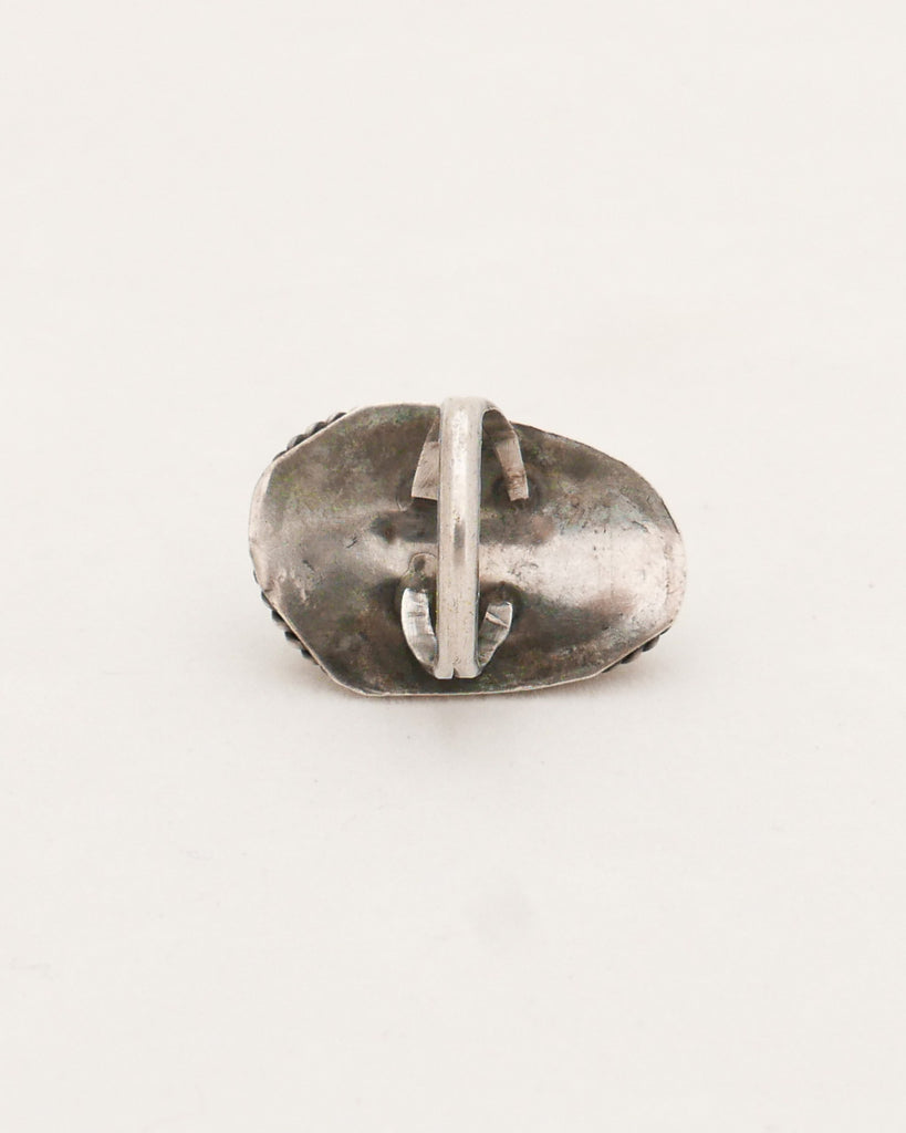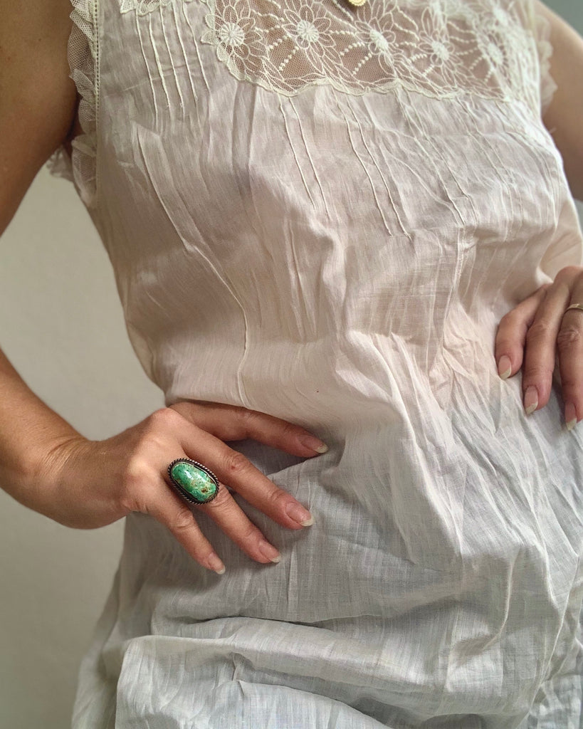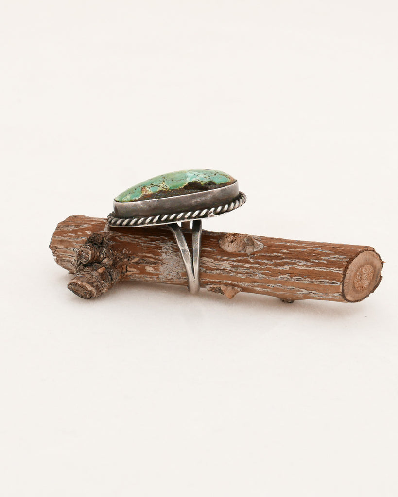 Statement turquoise sterling silver ring circa 1950/60’s. Green with bronze and cream colored matrix visible this large impressive stone. Cabochon is encircled with the twisted sterling wire and set on a split shank band.