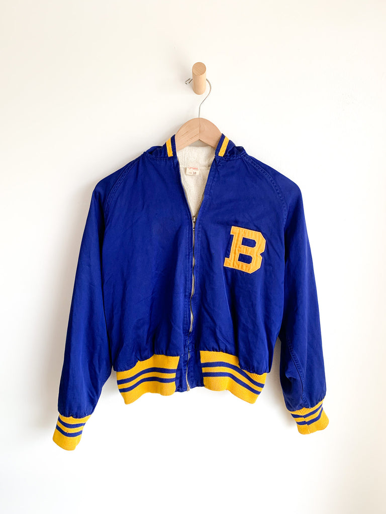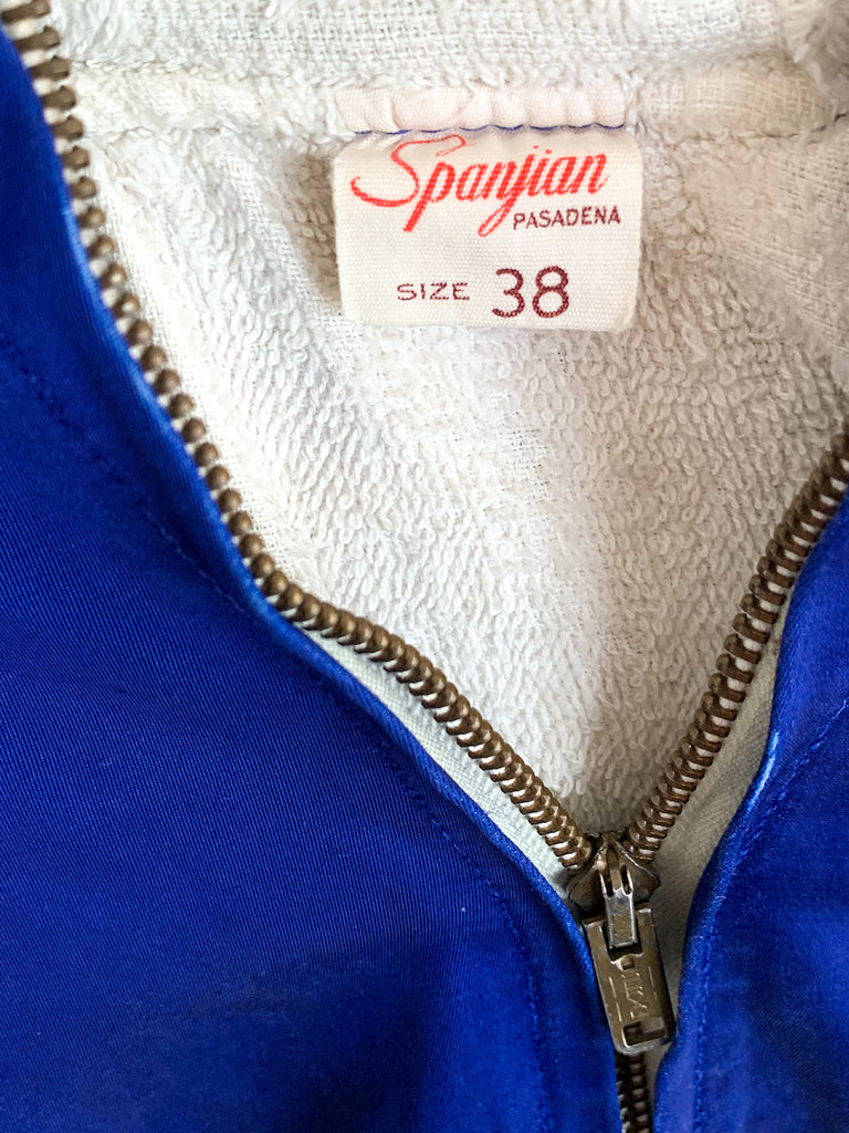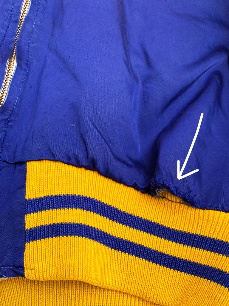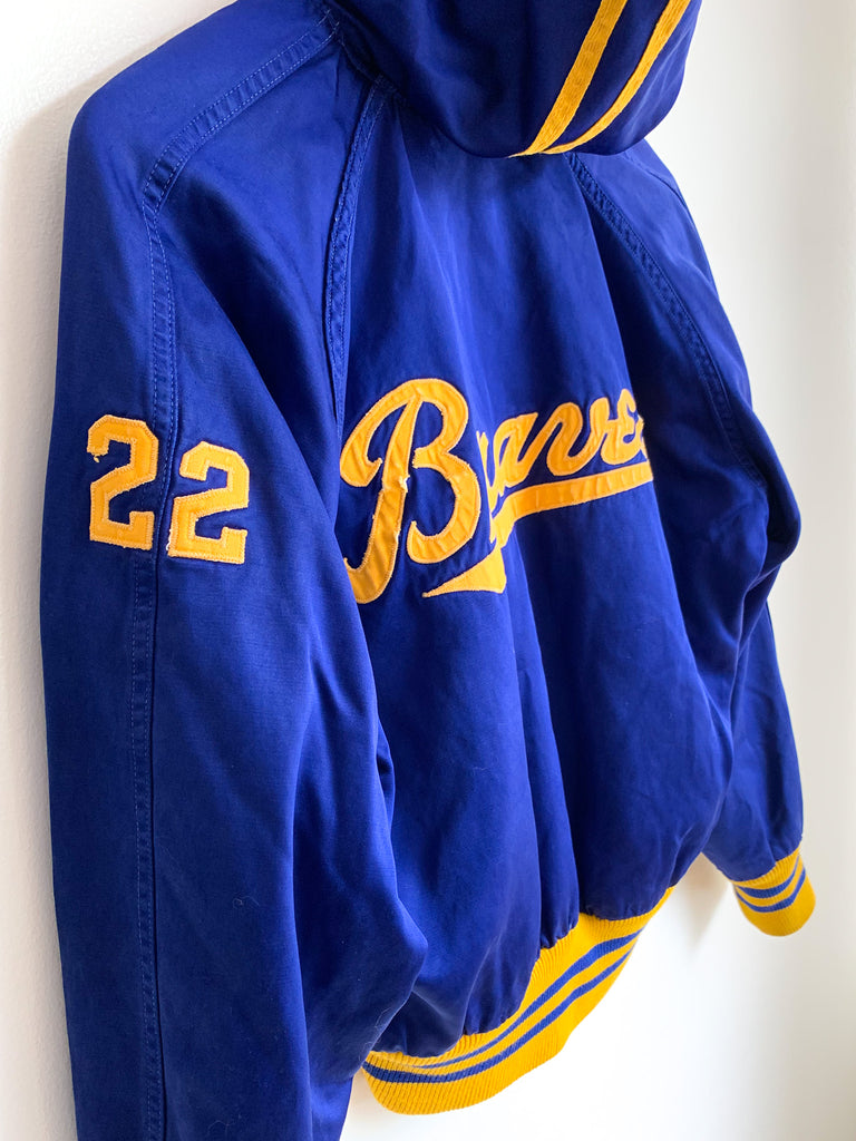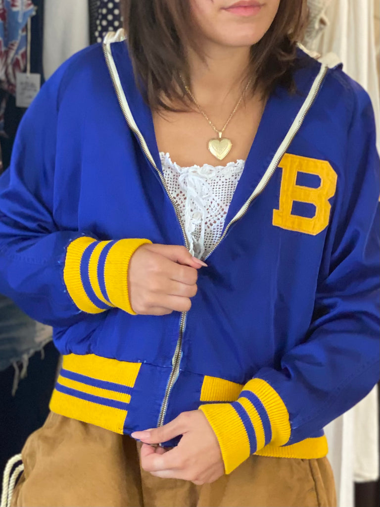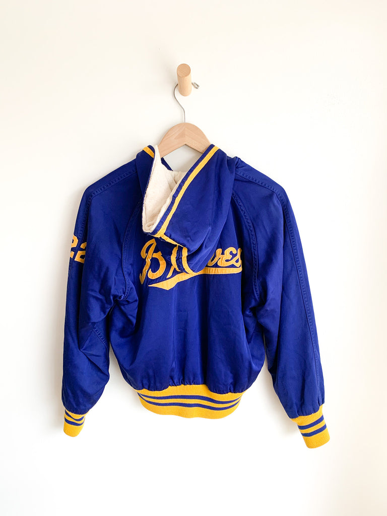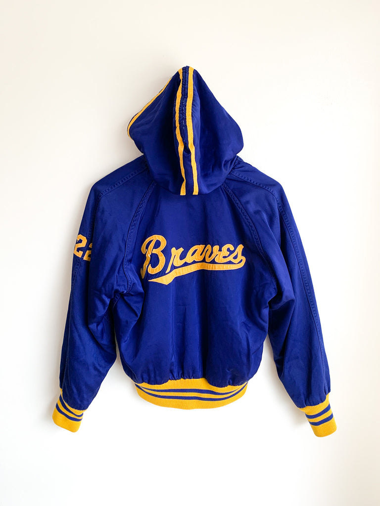 Satin blue and gold Braves jacket with hood. Terry cloth lined.