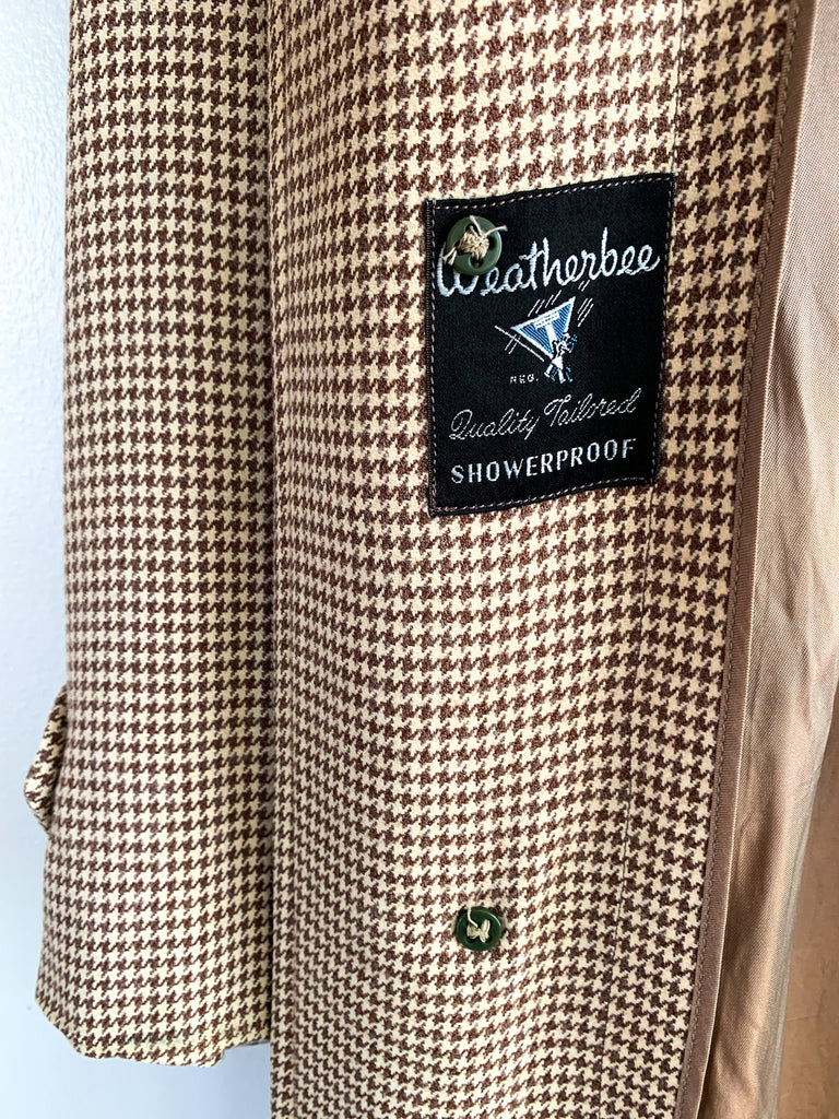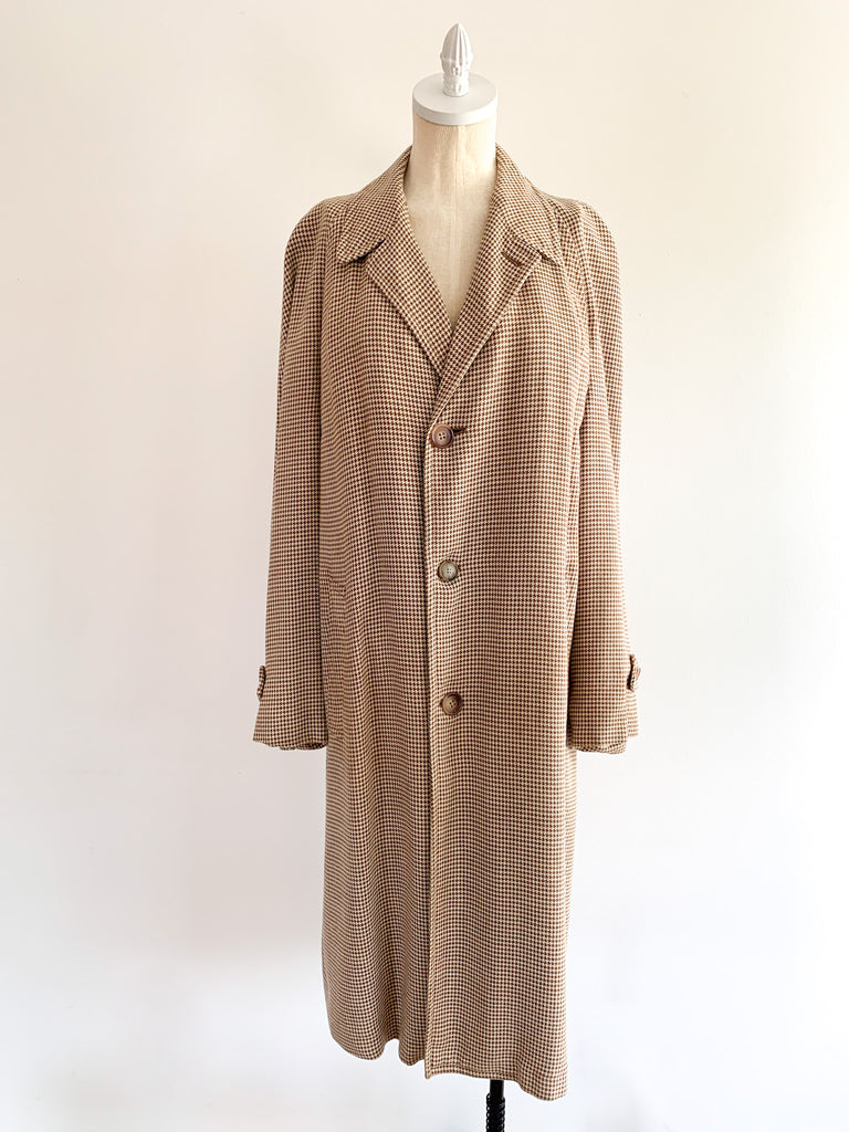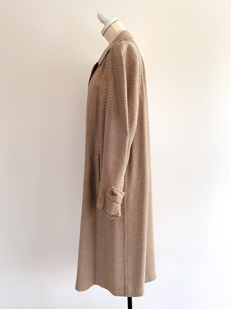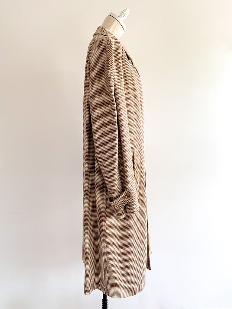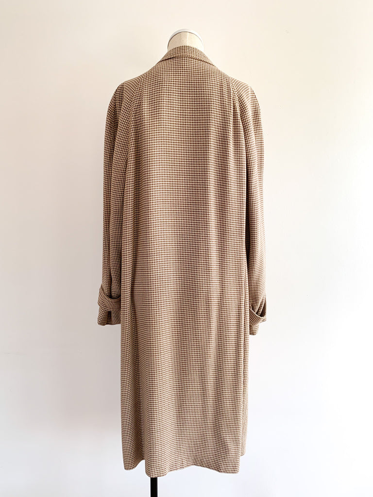 Brown and cream houndstooth overcoat notched collar, three button, side pockets. Duster/trench style always in style, classic. Fully lined and amazing graceful drape. Bonus “showerproof” raincoat capabilities.