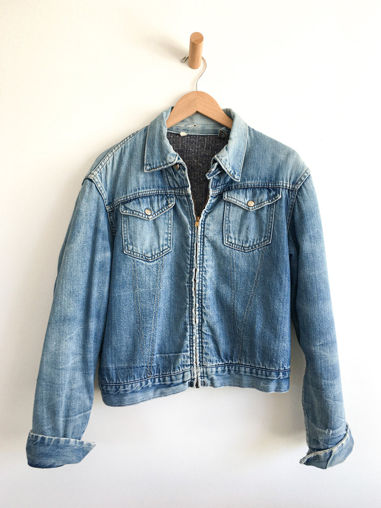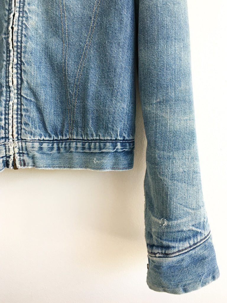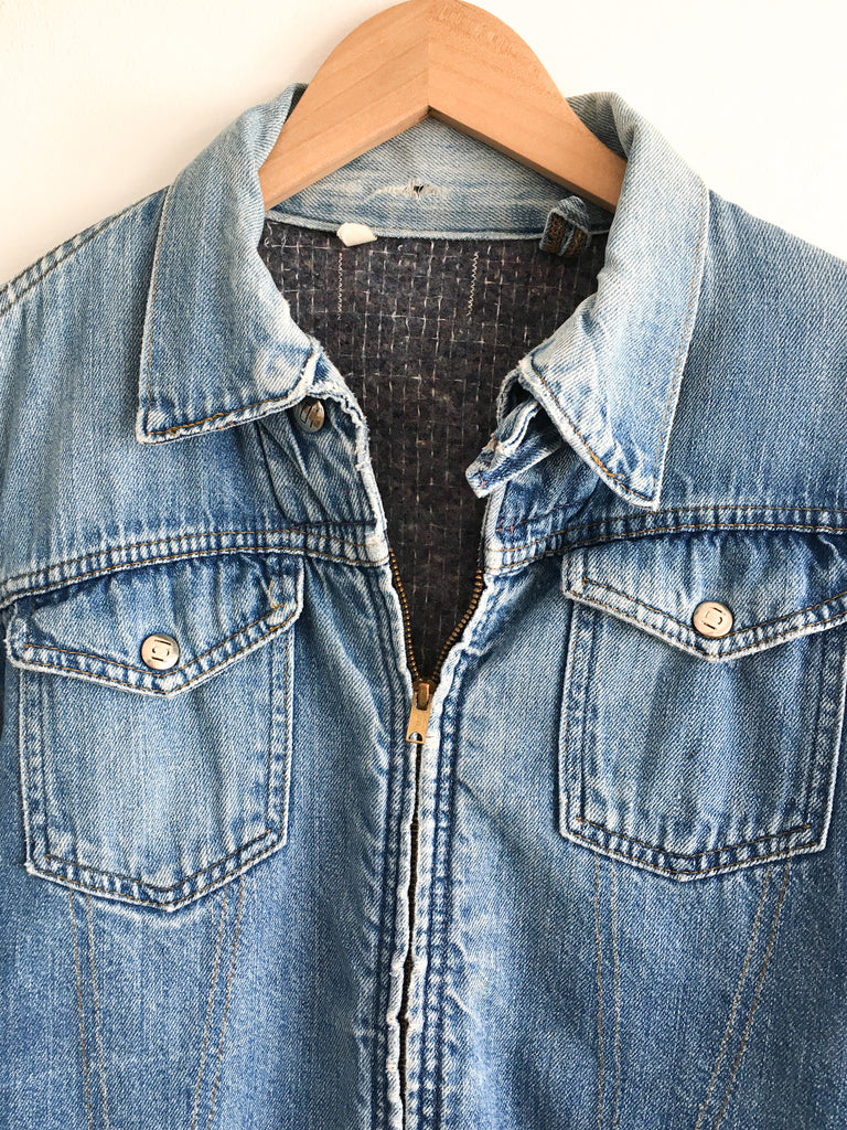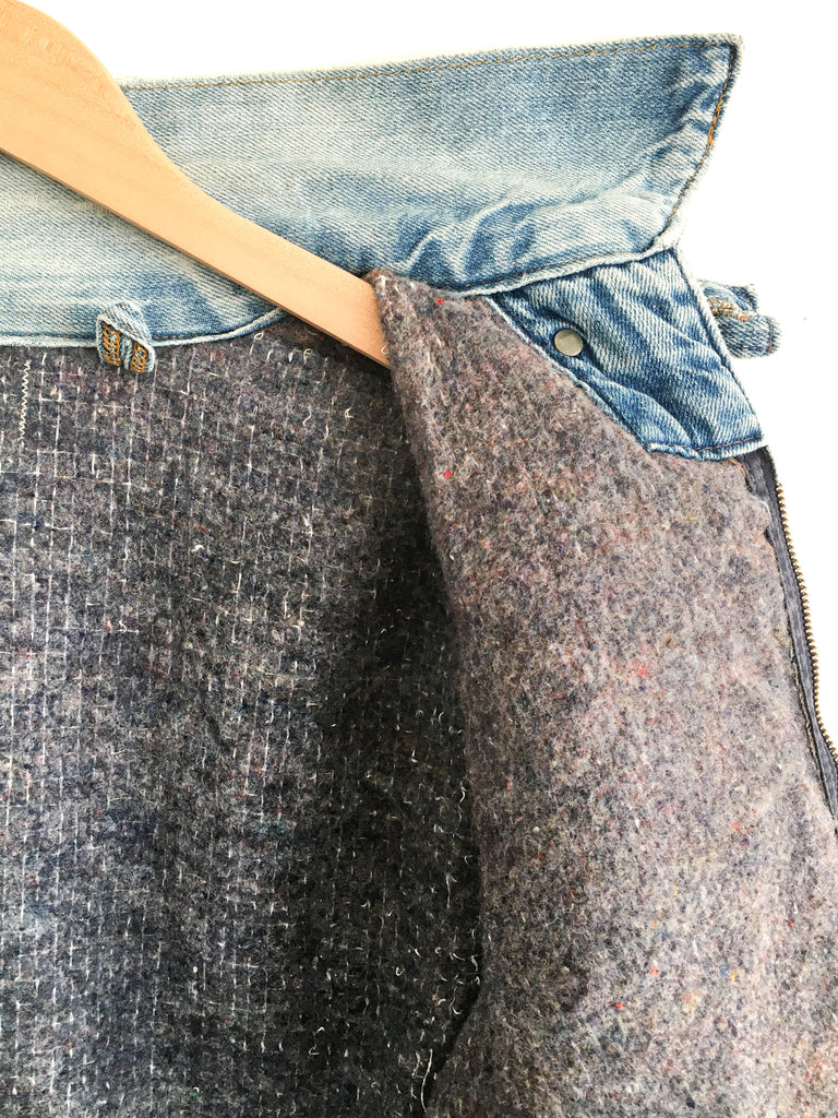 The most perfectly faded rugged denim jacket. Super soft washed blanket-lined. Scovill zipper dates this to the early 1960’s. Front patch pockets with snap buttons. Cuffs also feature snap buttons. No side pockets.