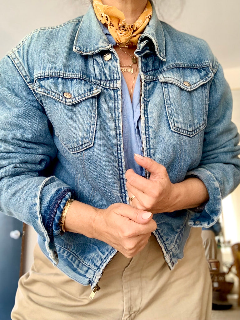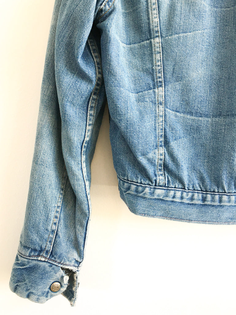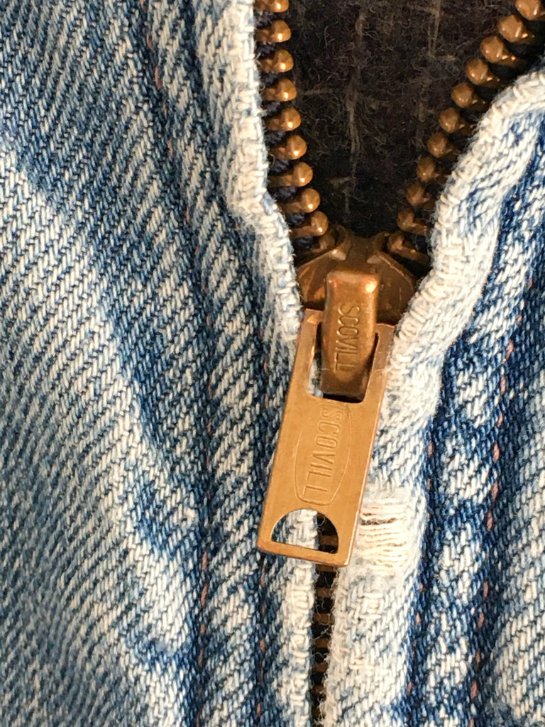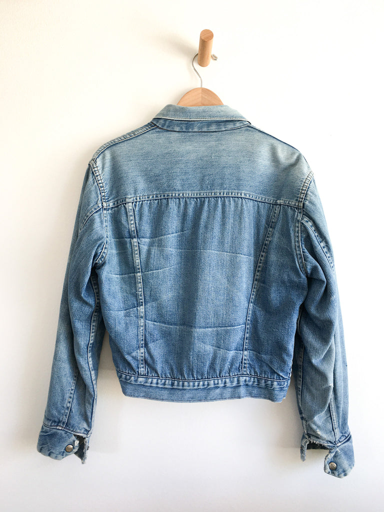 The most perfectly faded rugged denim jacket. Super soft washed blanket-lined. Scovill zipper dates this to the early 1960’s. Front patch pockets with snap buttons. Cuffs also feature snap buttons. No side pockets.