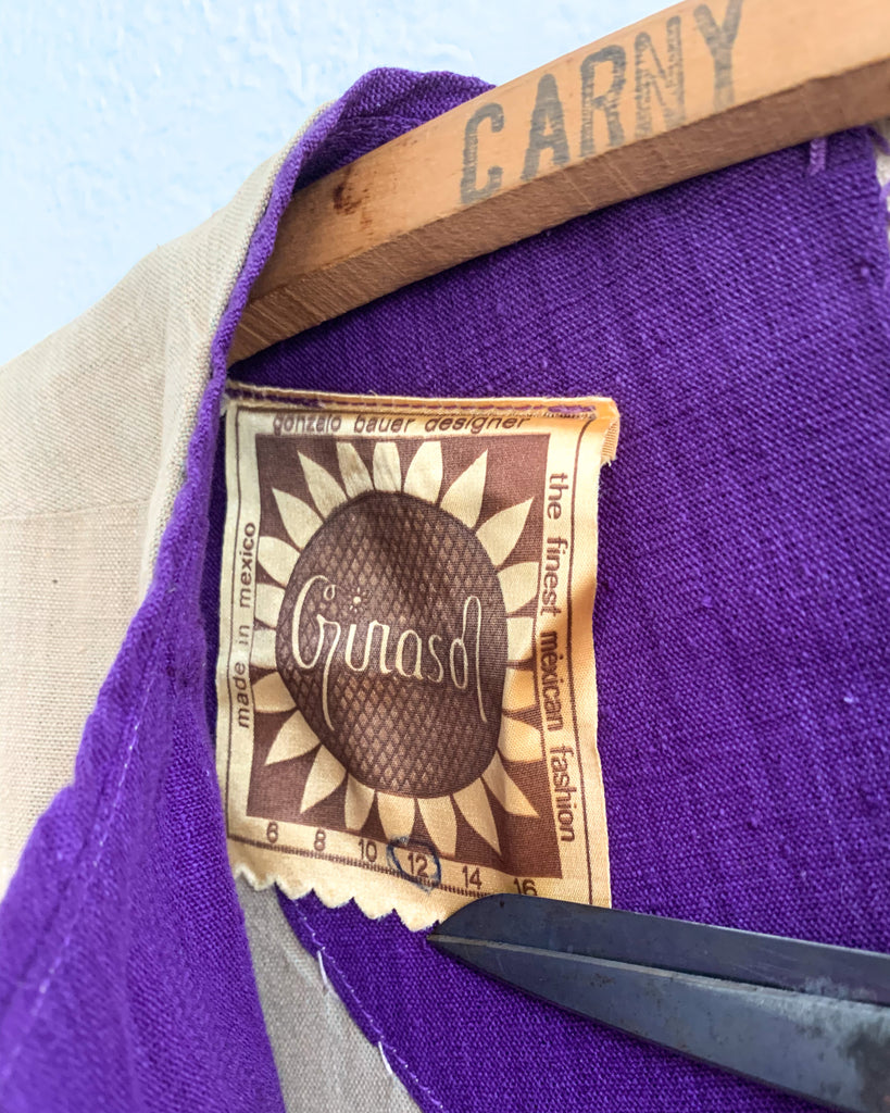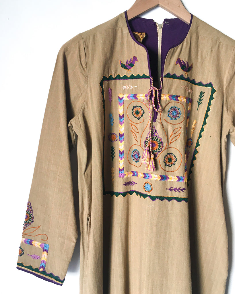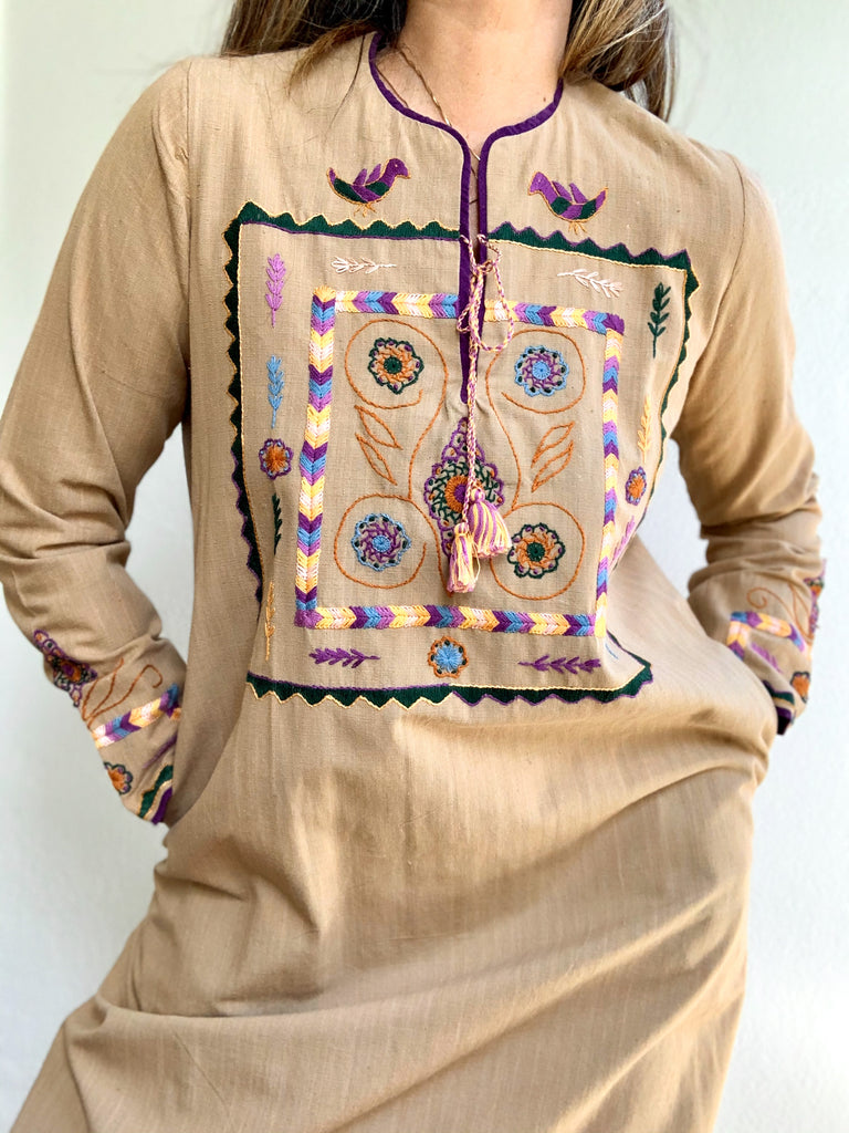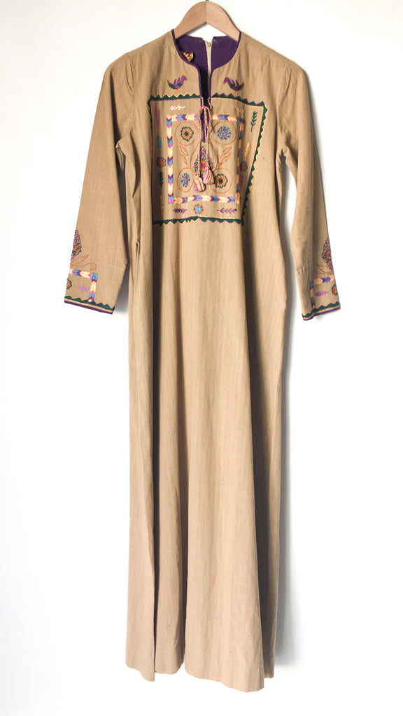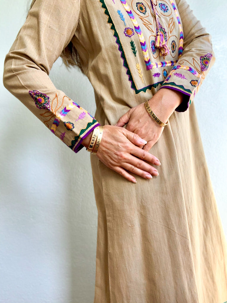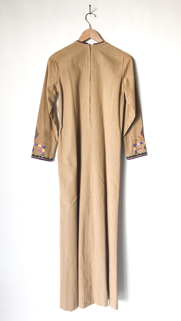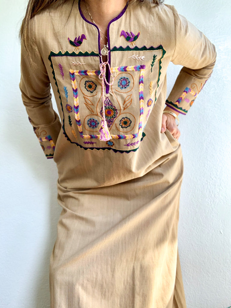 1960's Girasol tan cotton tunic or kaftan dress with pockets in excellent vintage condition. Colorful embroidery on the chest and sleeves. Made in Mexico.