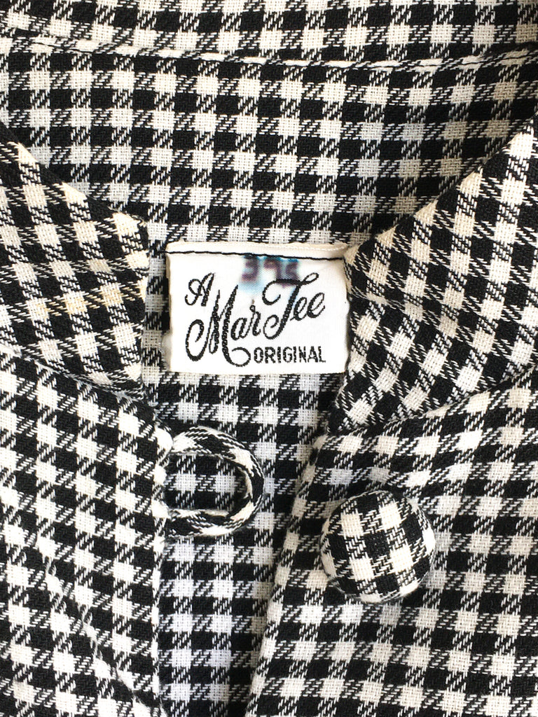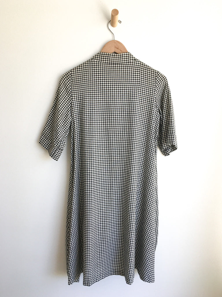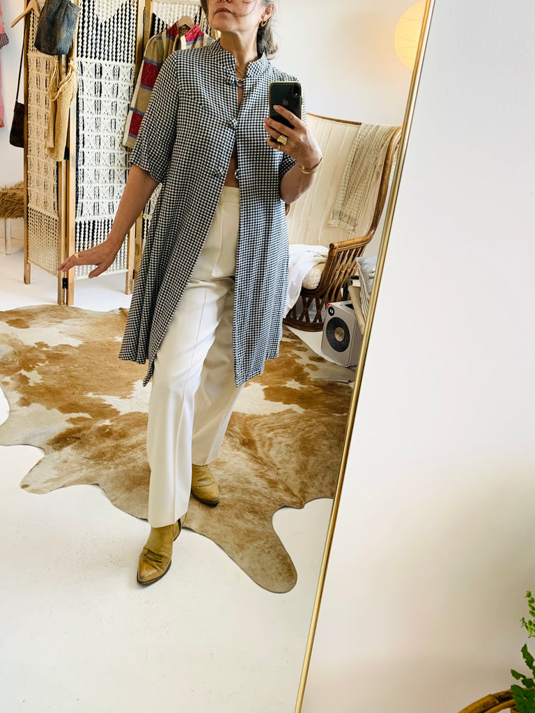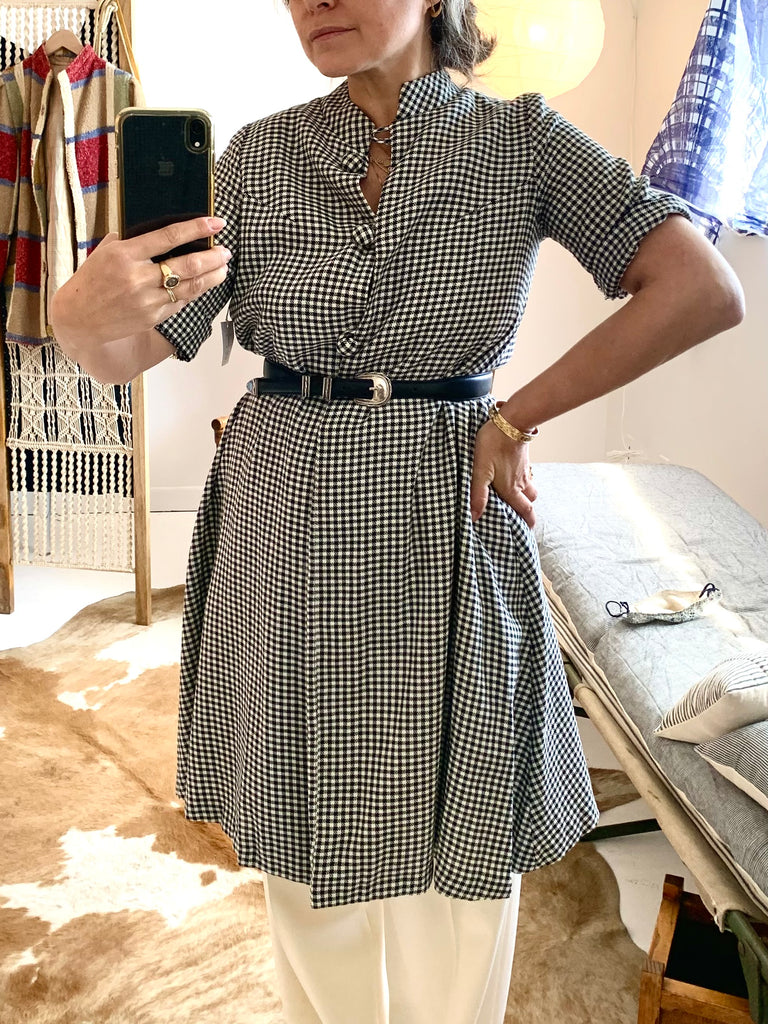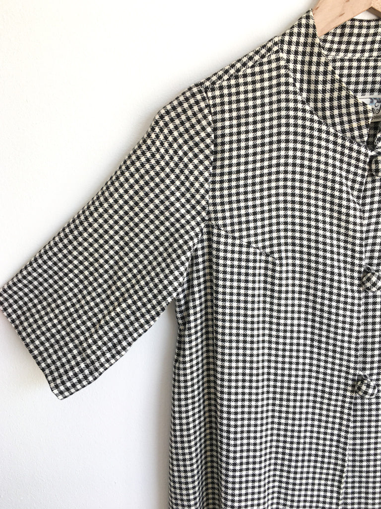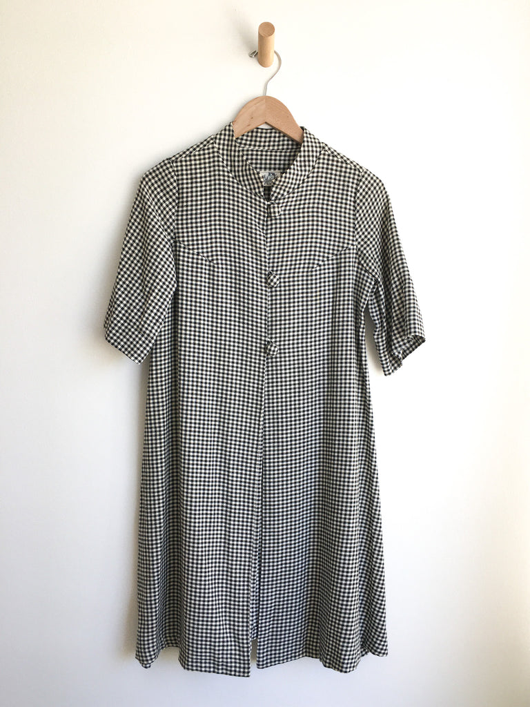 A-line shaped body & short sleeve houndstooth lightweight duster. Can also be belted and styled as a dress. Has three covered buttons, a mandarin collar, darts for shape and is open to hem.