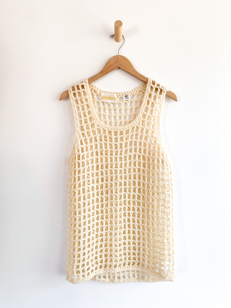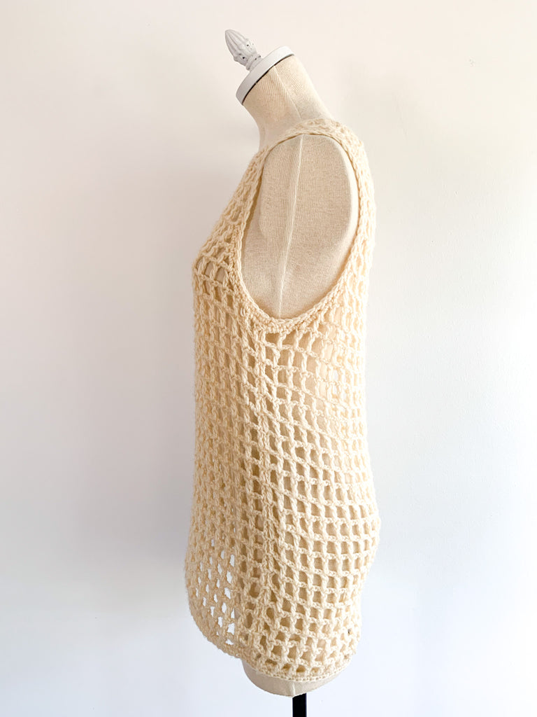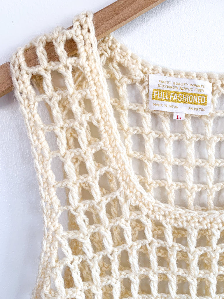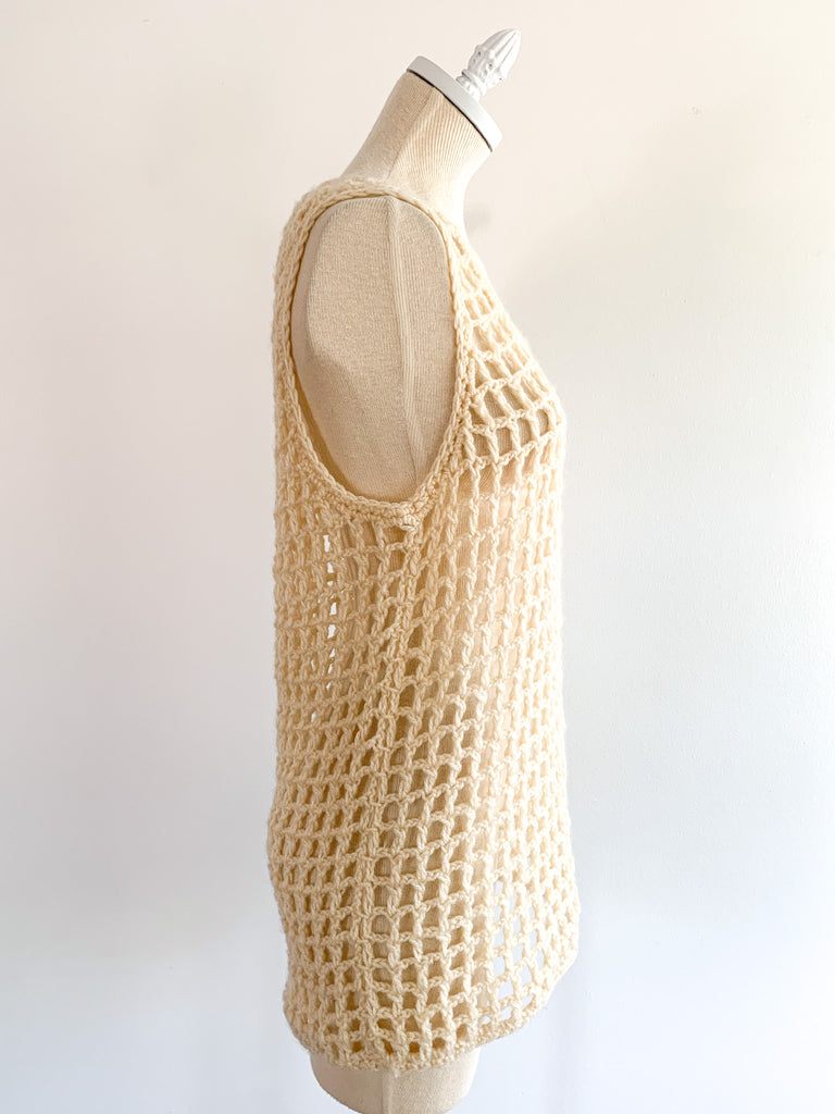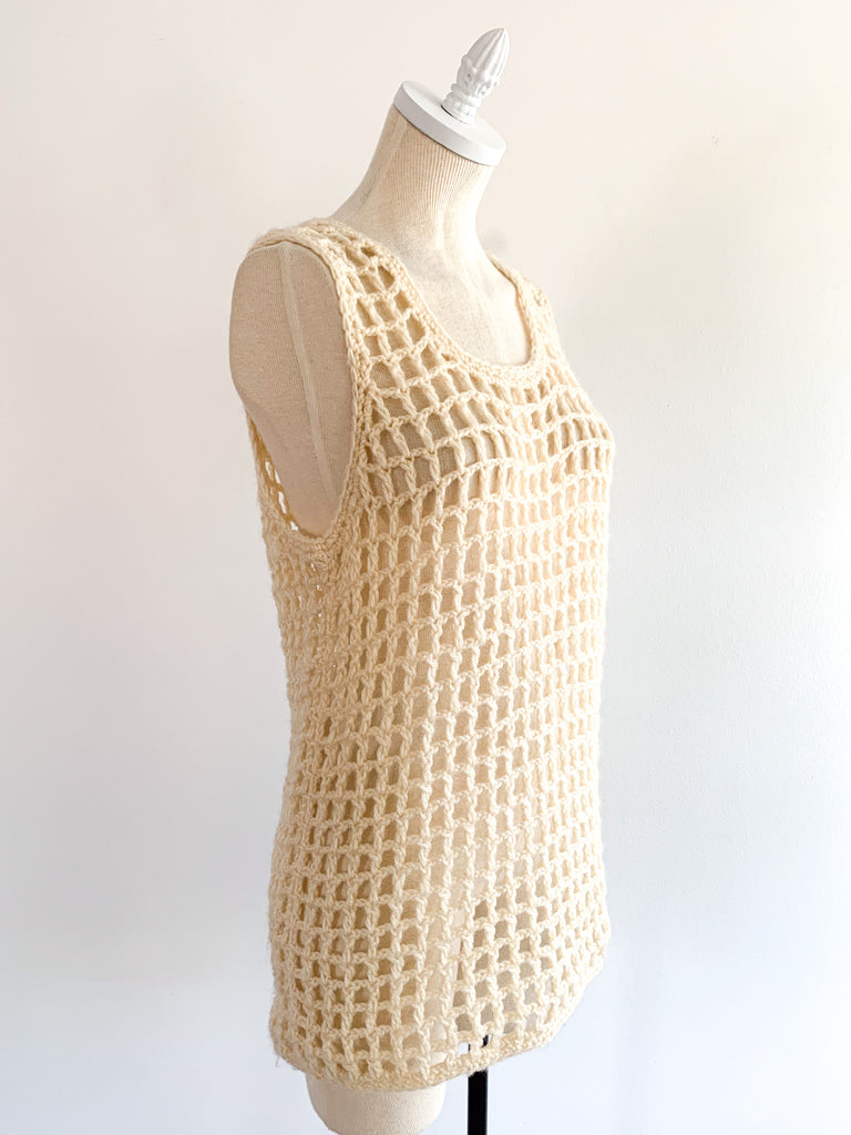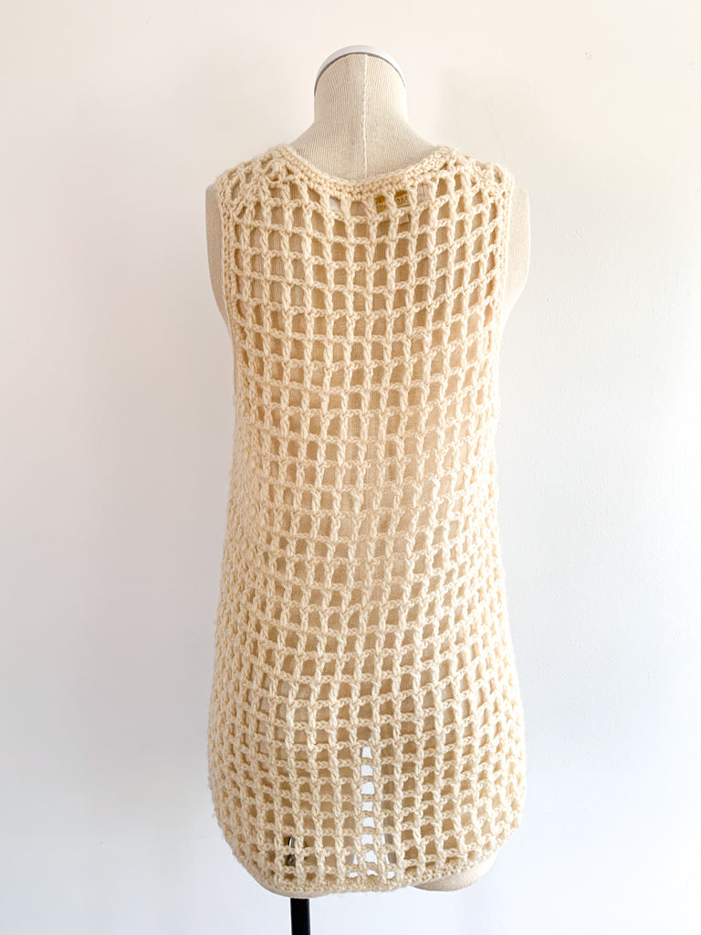 Open knit/ crochet tunic in neutral ivory. Excellent styling and layering piece. Not wool and not itchy.