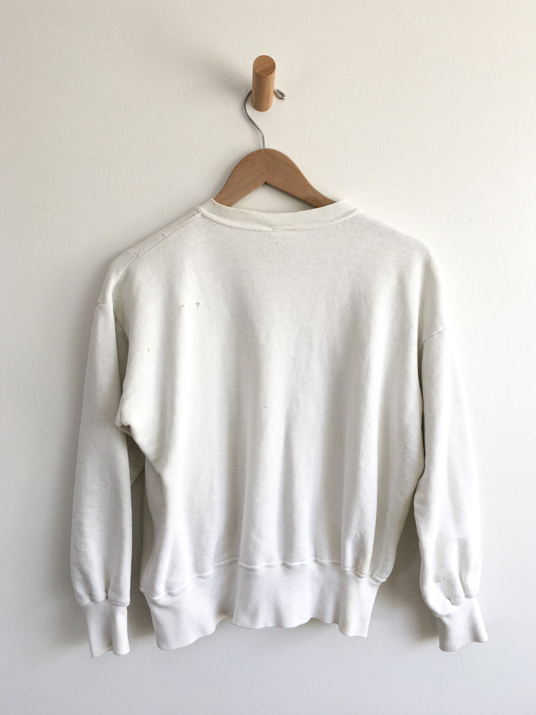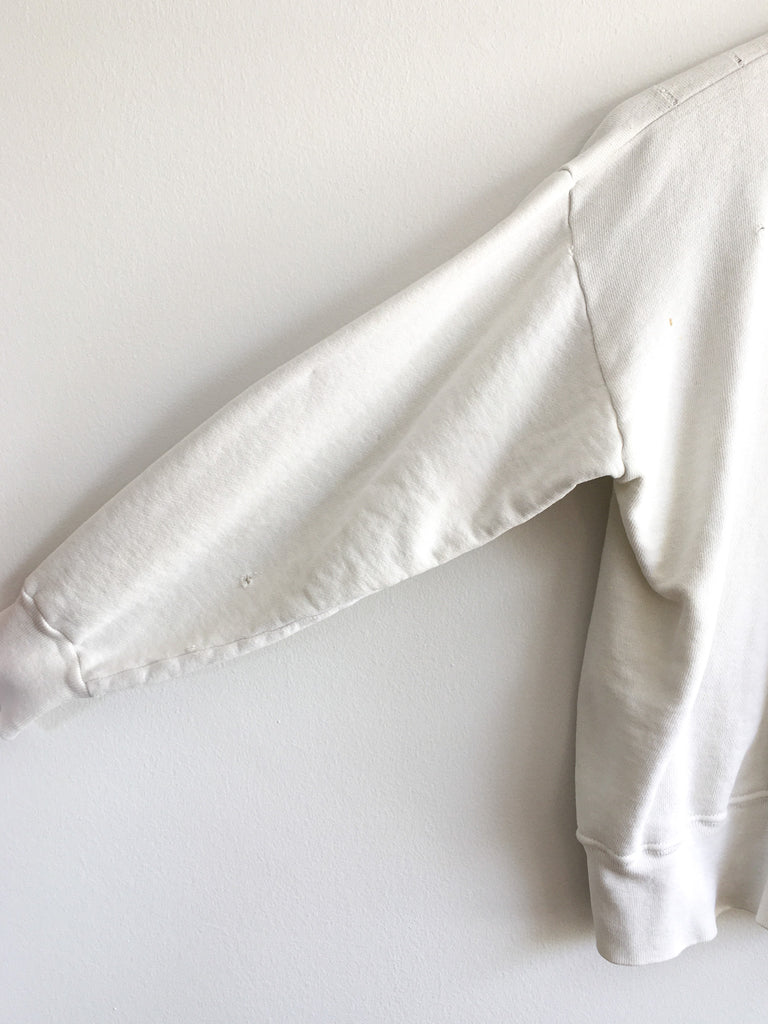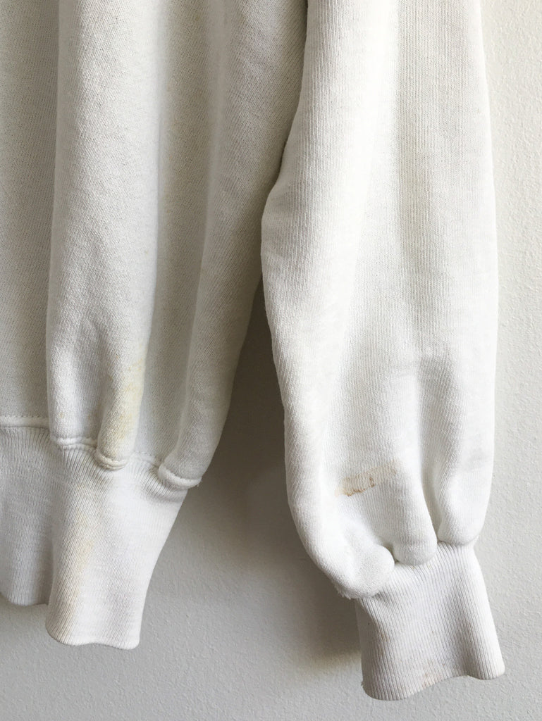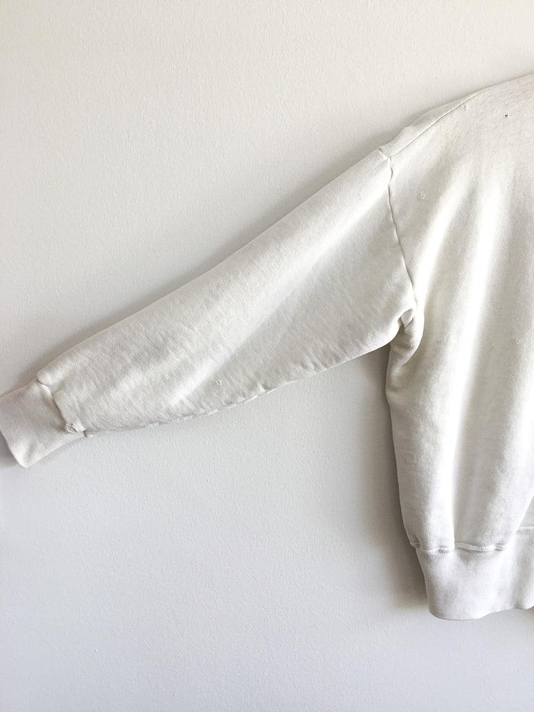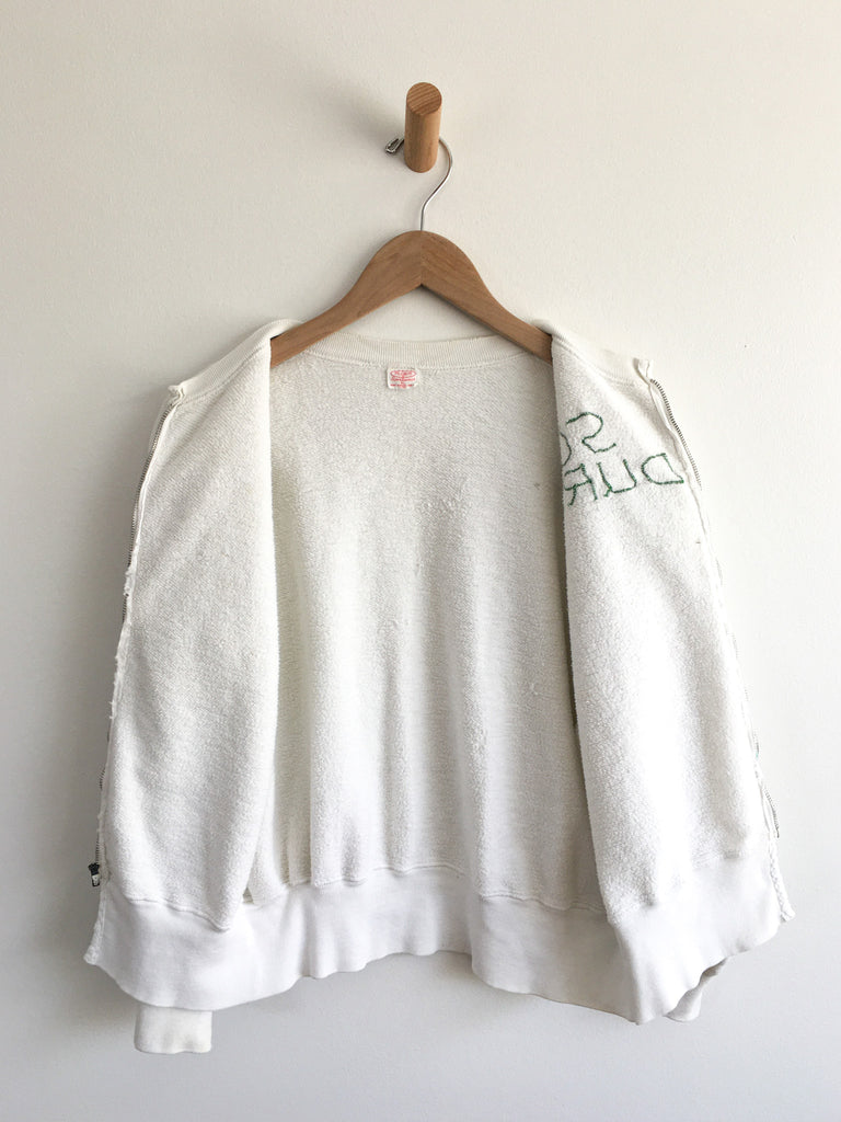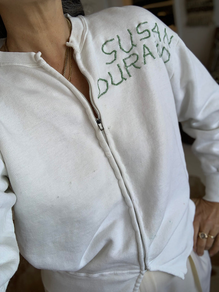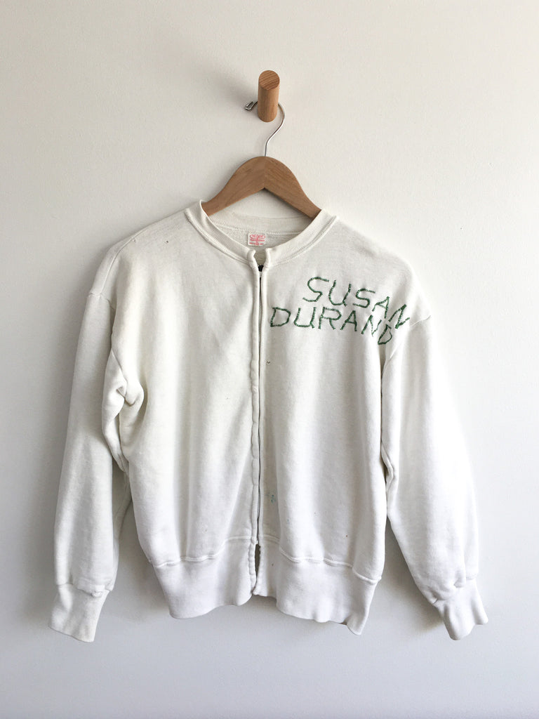 USA made white zip front sweatshirt. Heavily worn with age appropriate wear. Apparently the owner of this vintage 1960's sweatshirt, Susan Durand, got some excellent use out of this!