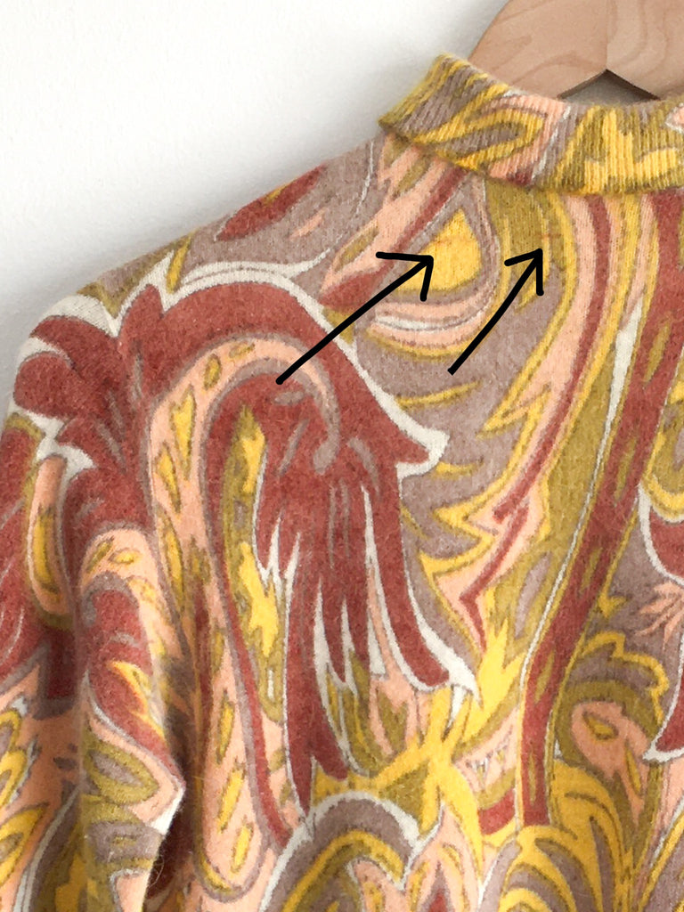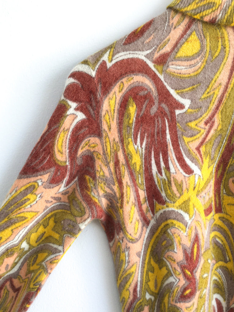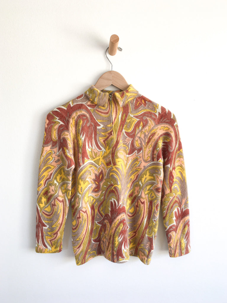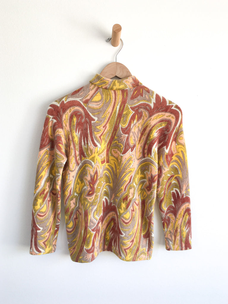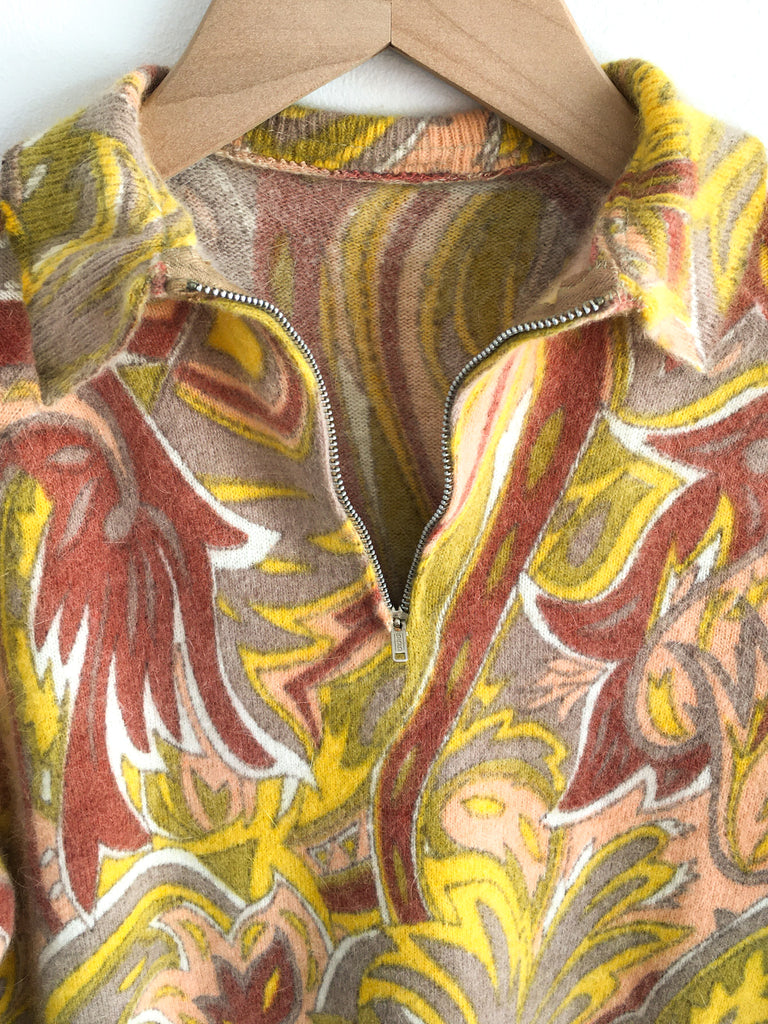 Sweetest pastel printed wool and angora sweater. Fitted style from the 50/60’s. Such a pretty combo of acid yellow, pink, putty and rose, we love the organic print! Ribbed at neck, zip up back and ribbing at waist.
