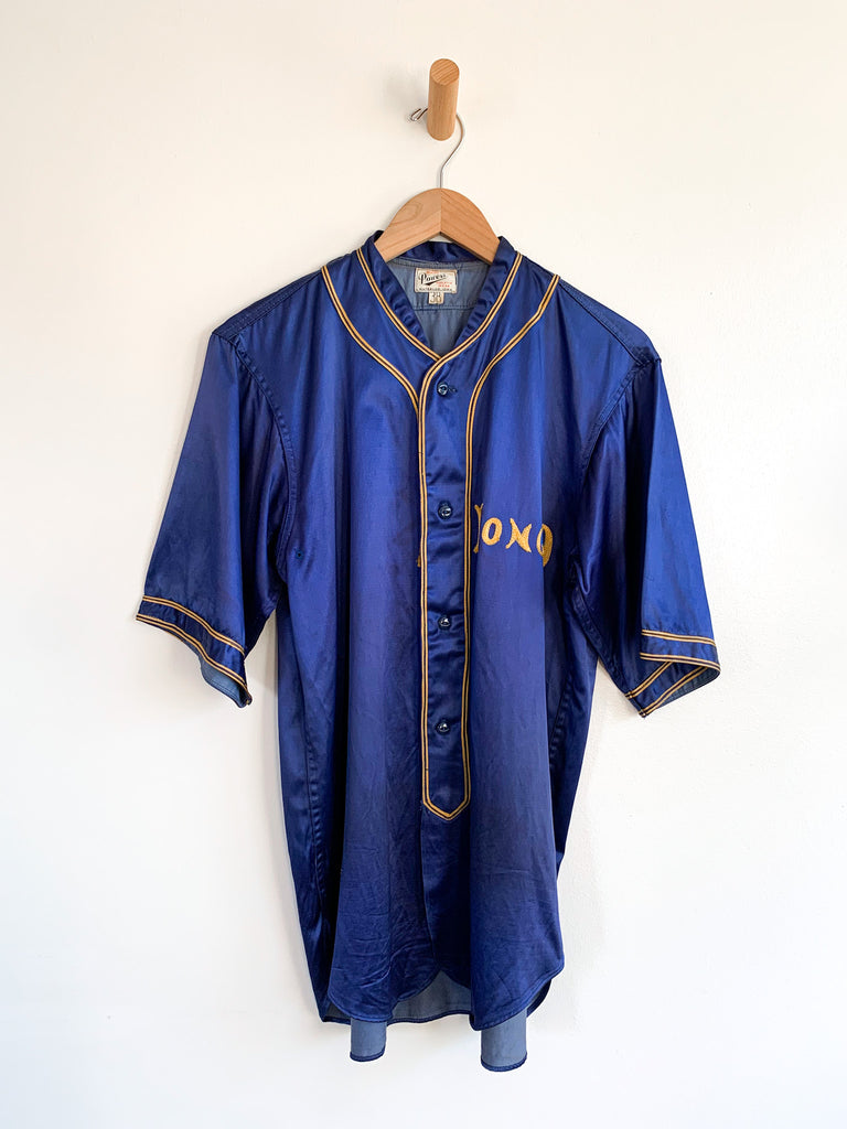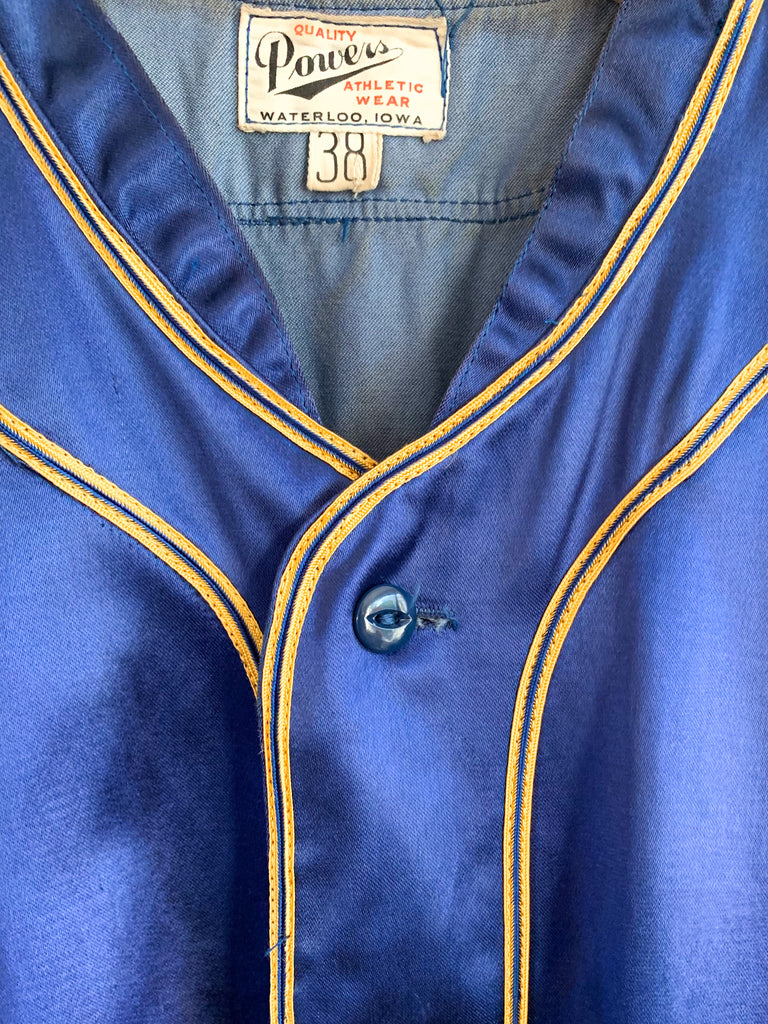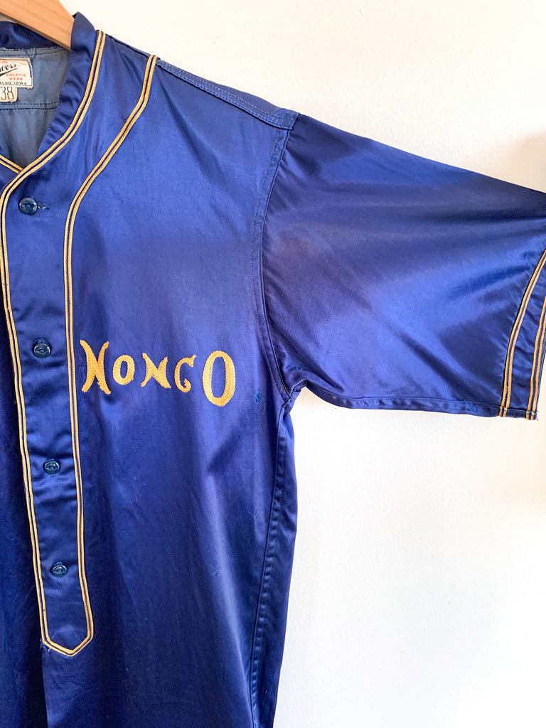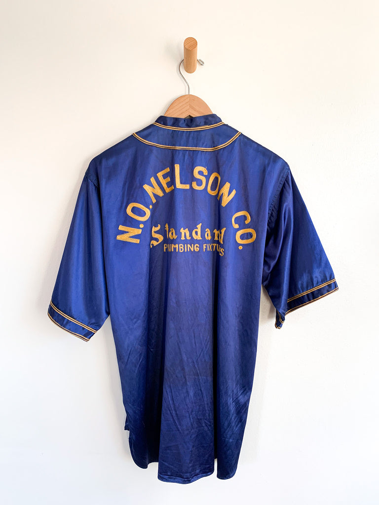 Shiny royal blue satin shirt with buttons at front featuring golden hued chain stitching that reads “NONCO” on front and N.O. Nelson Co Standard Plumbing Fixtures on the back. Trimmed all around with more gold chain stitching.
