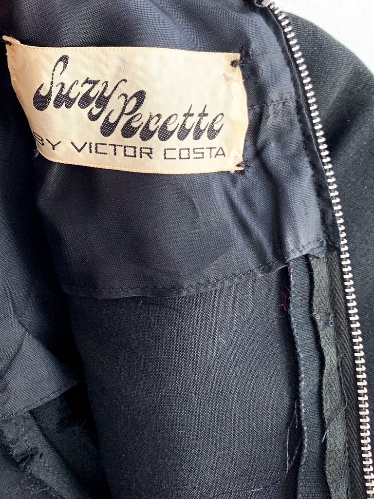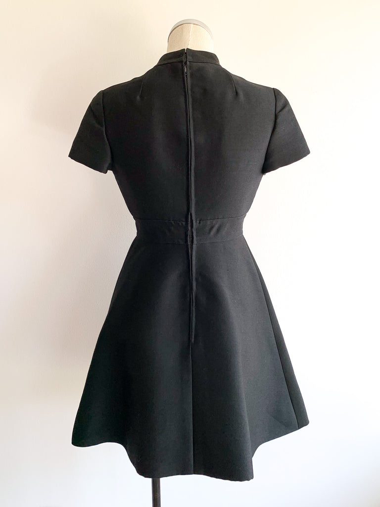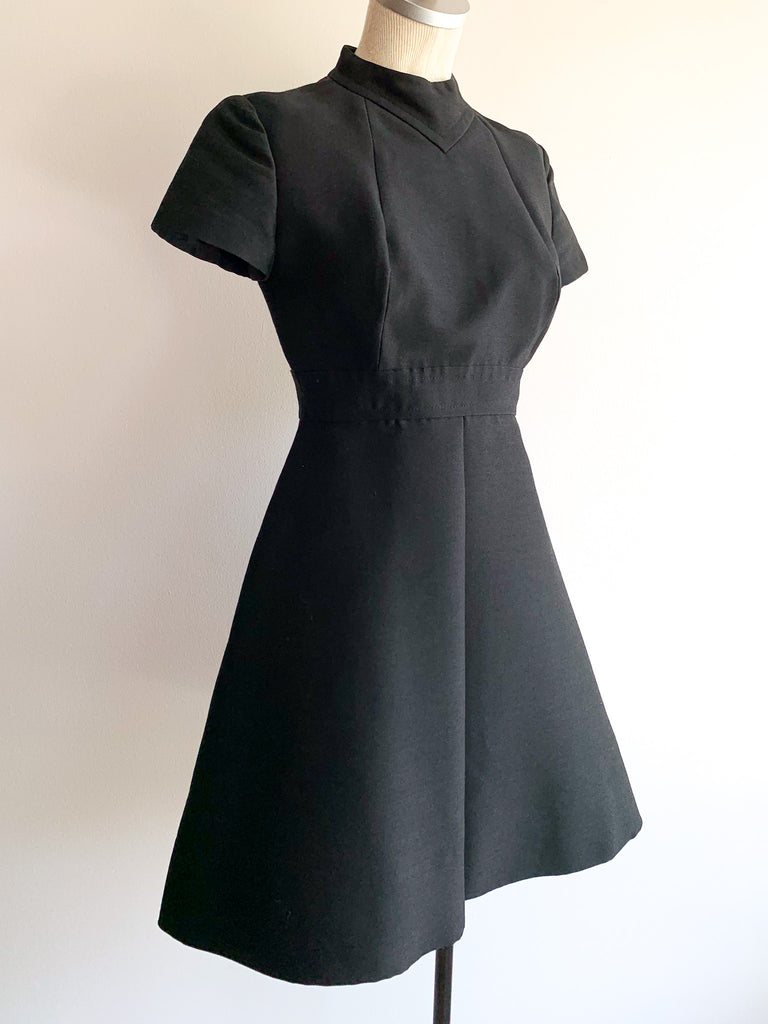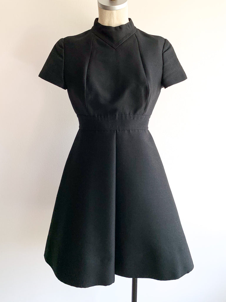 Futuristic mod black silk structured mini dress. Short sleeve, high neck, nipped waist and back zip.