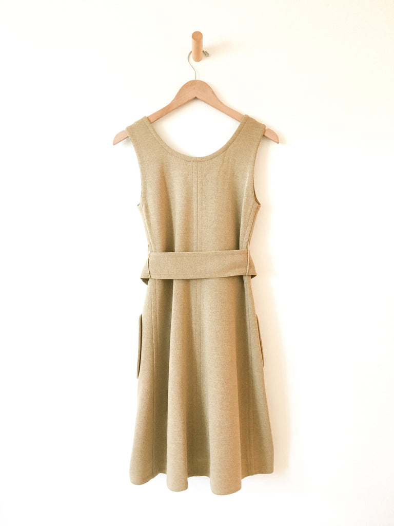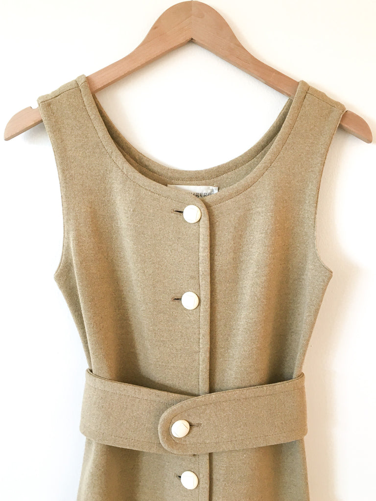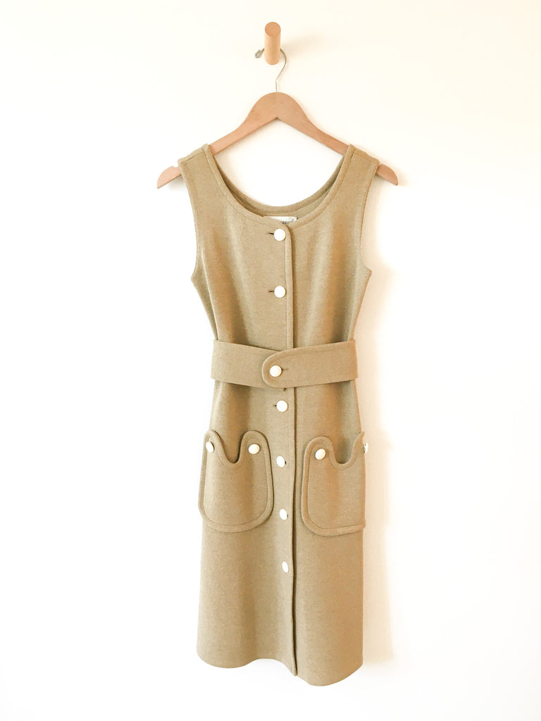 Pinafore button front jumpsuit dress. Classic 60’s style with belt and great front pockets.
