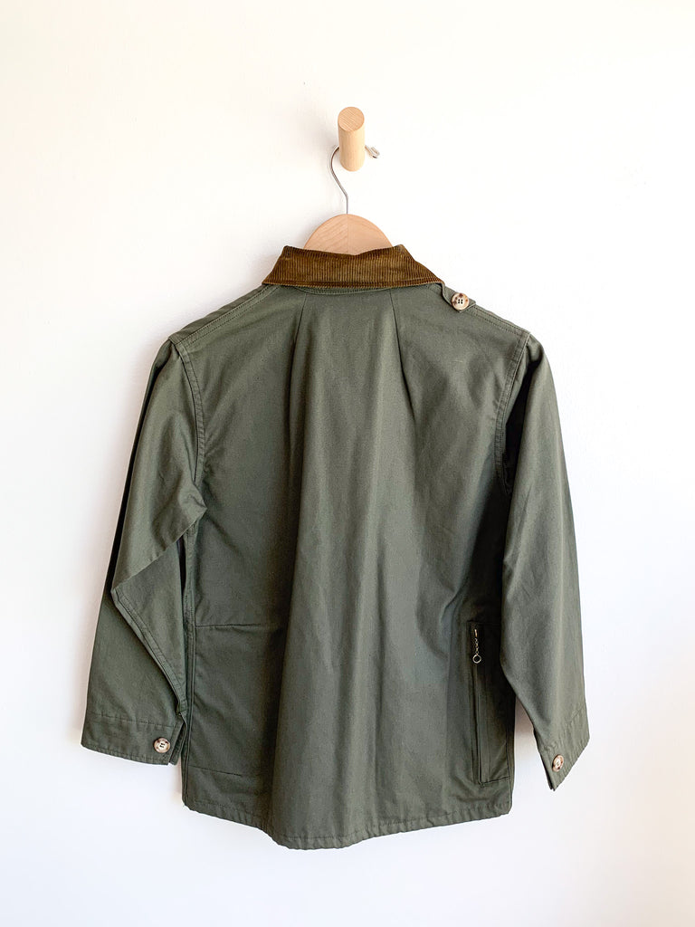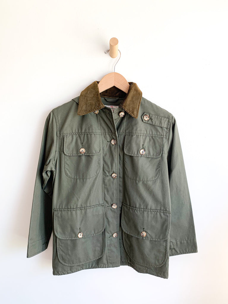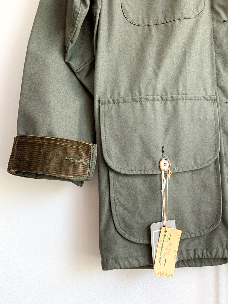 Rare find, original tags, unworn forest green safari styled hunters/ explorers jacket. Cotton with corduroy trim at collar and cuffs. Fabulous design, timeless and classic.