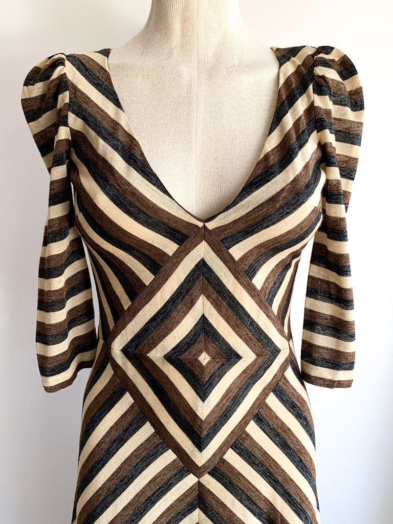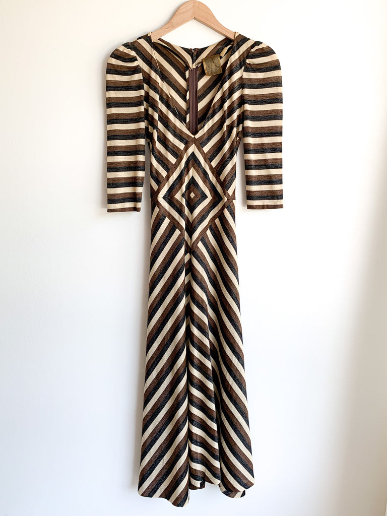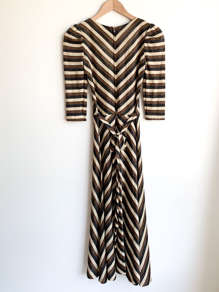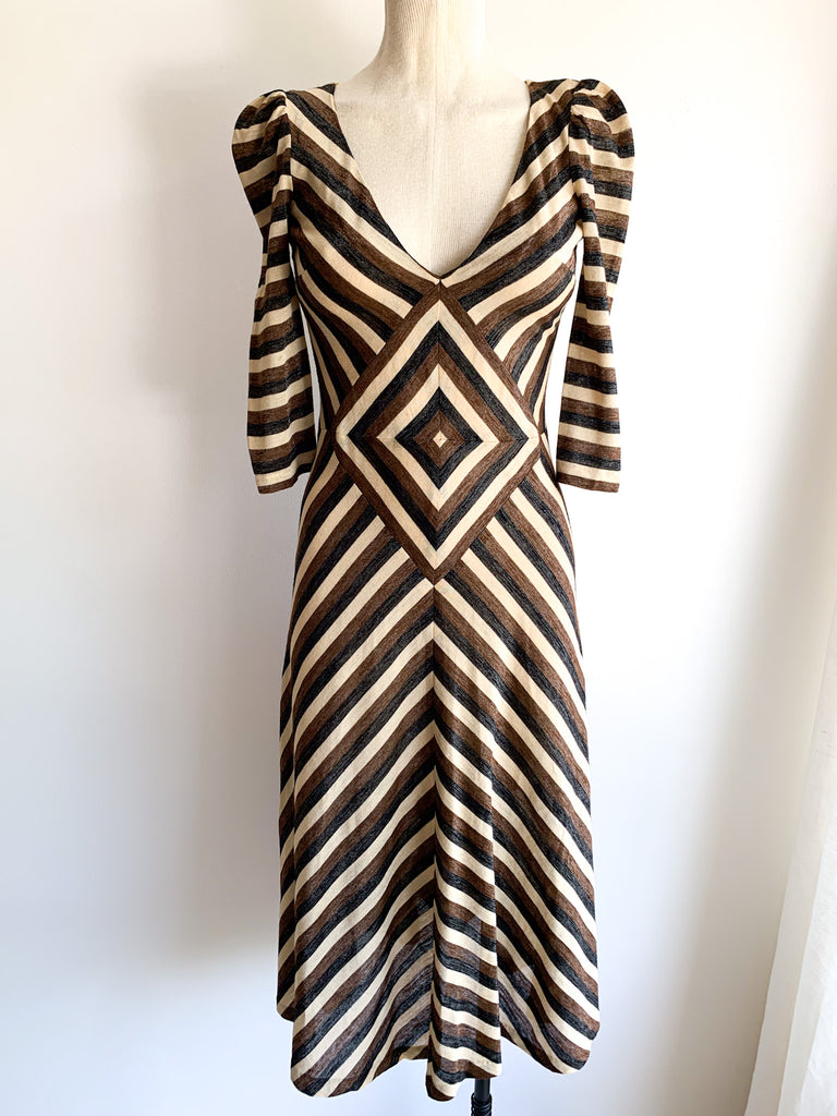 Highly collectible and rare neutral striped dress from the Studio 54 era. Fitted bodice, tie waist puffed shoulder sleeves and deep v front. Such a special and flattering dress.