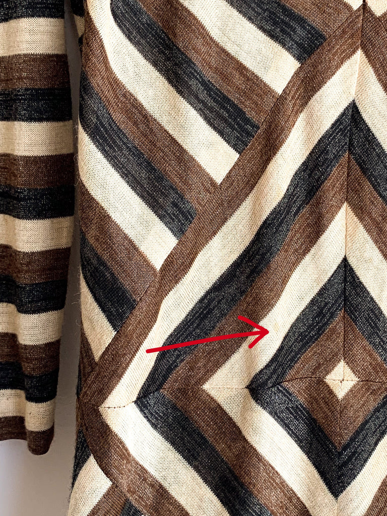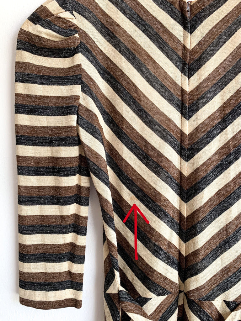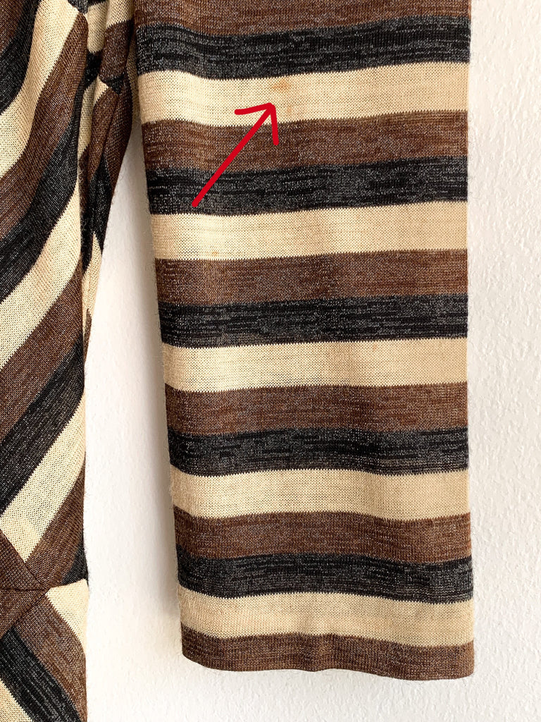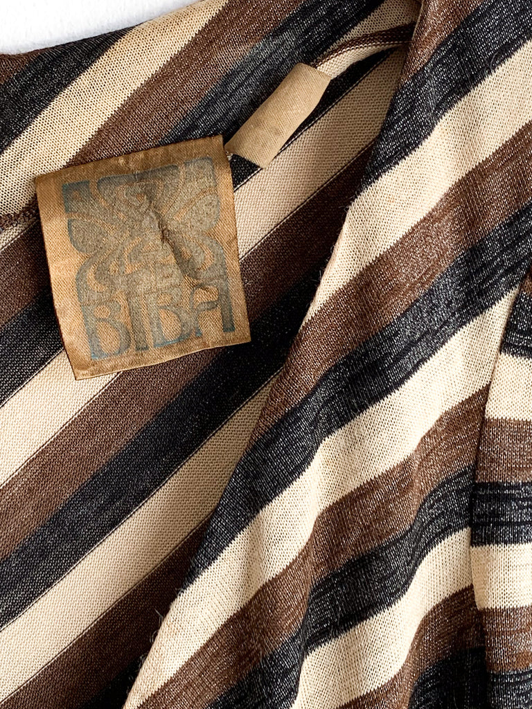 Highly collectible and rare neutral striped dress from the Studio 54 era. Fitted bodice, tie waist puffed shoulder sleeves and deep v front. Such a special and flattering dress.