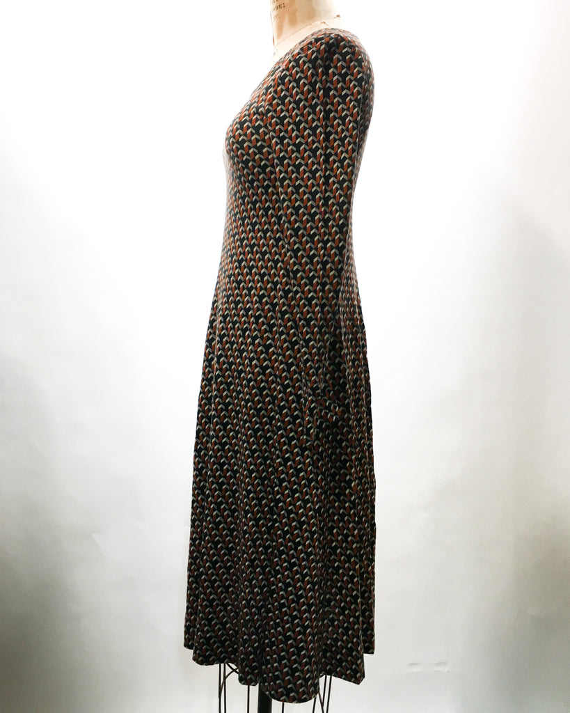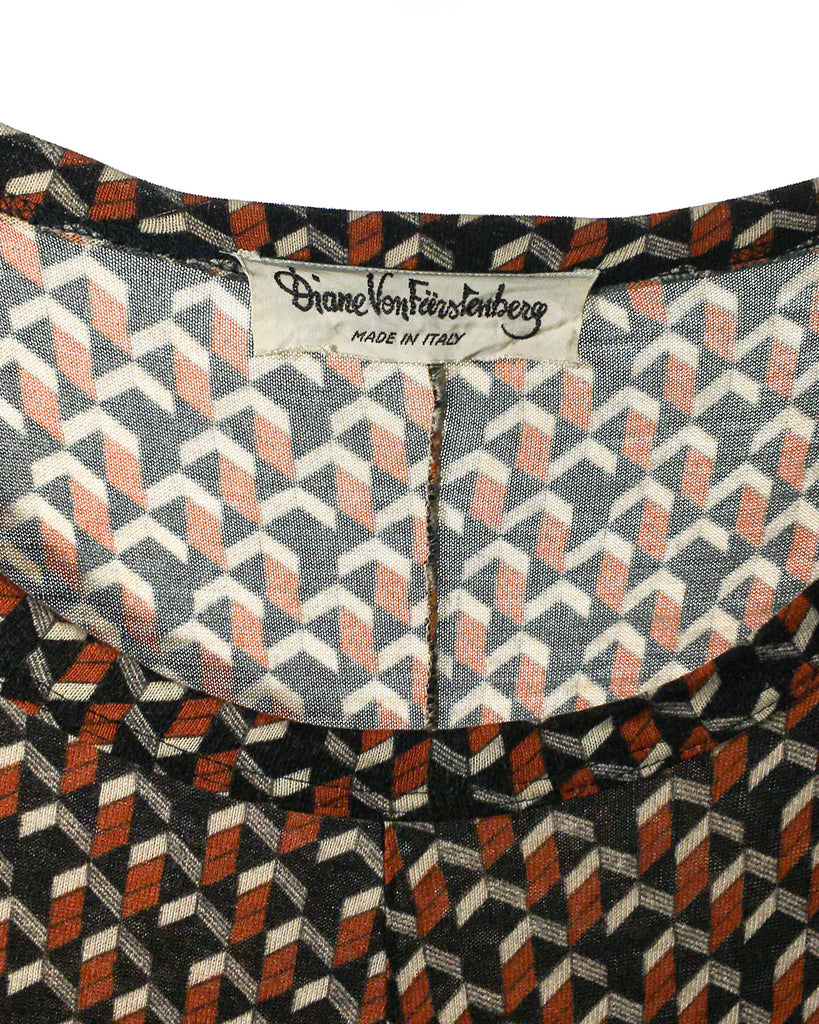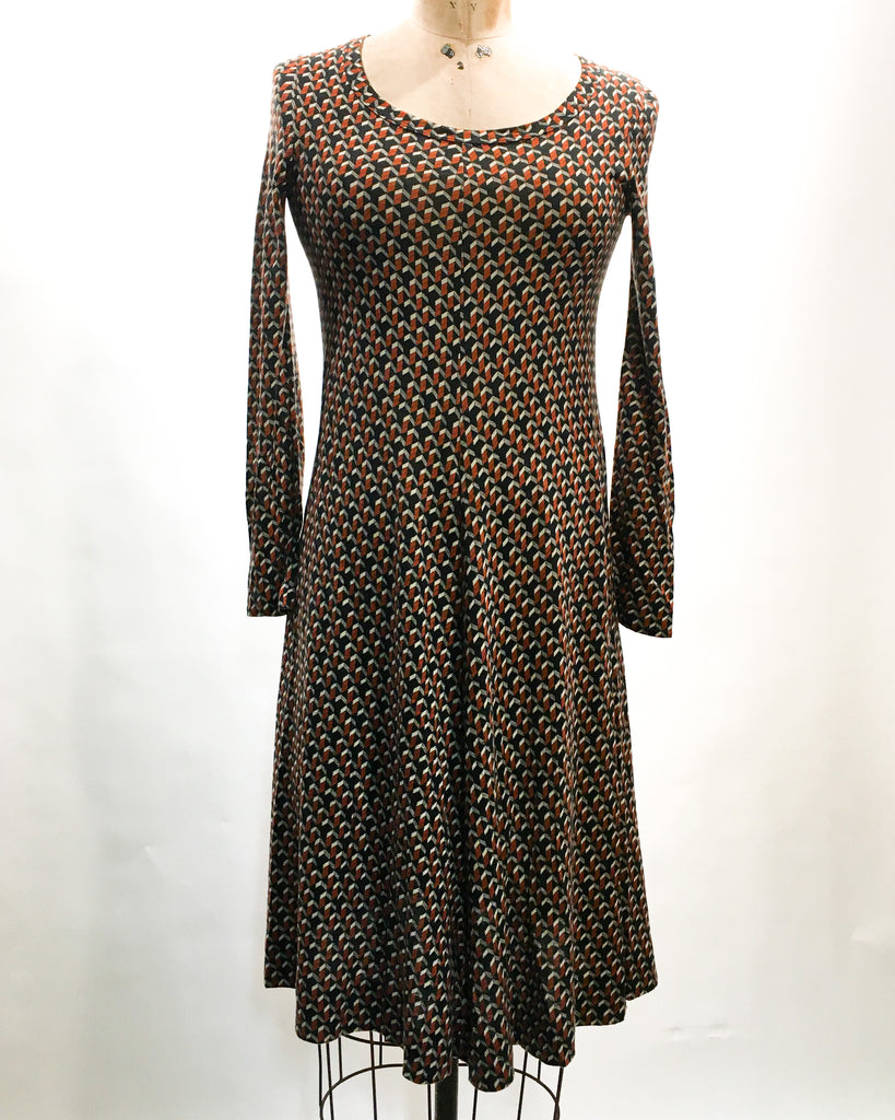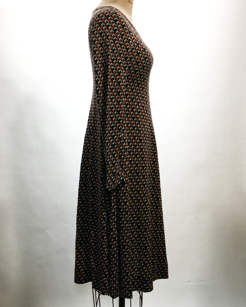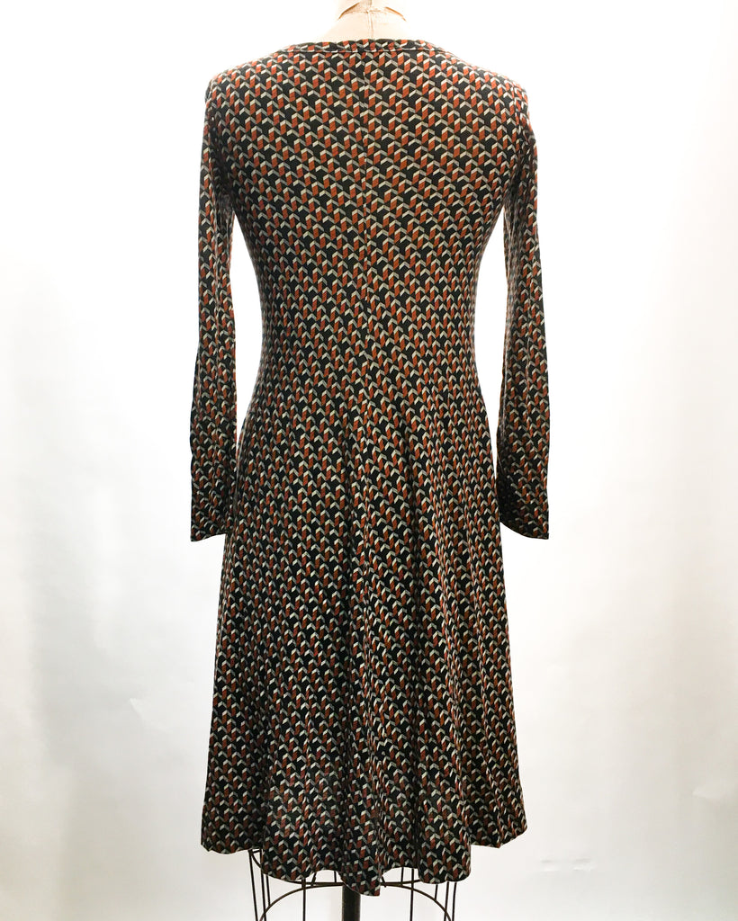 1970’s Diane von Furstenberg burnt orange & black pattern dress in excellent vintage condition. Cotton blend with a bit of stretch. Fits S/XS. Made in Italy.
