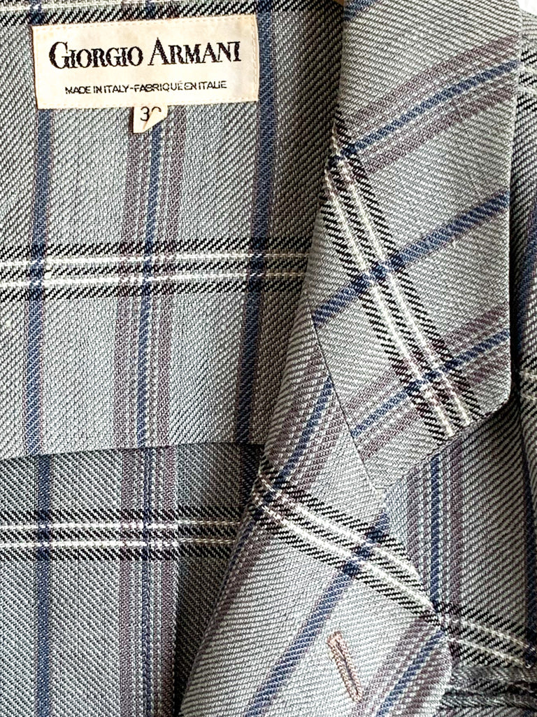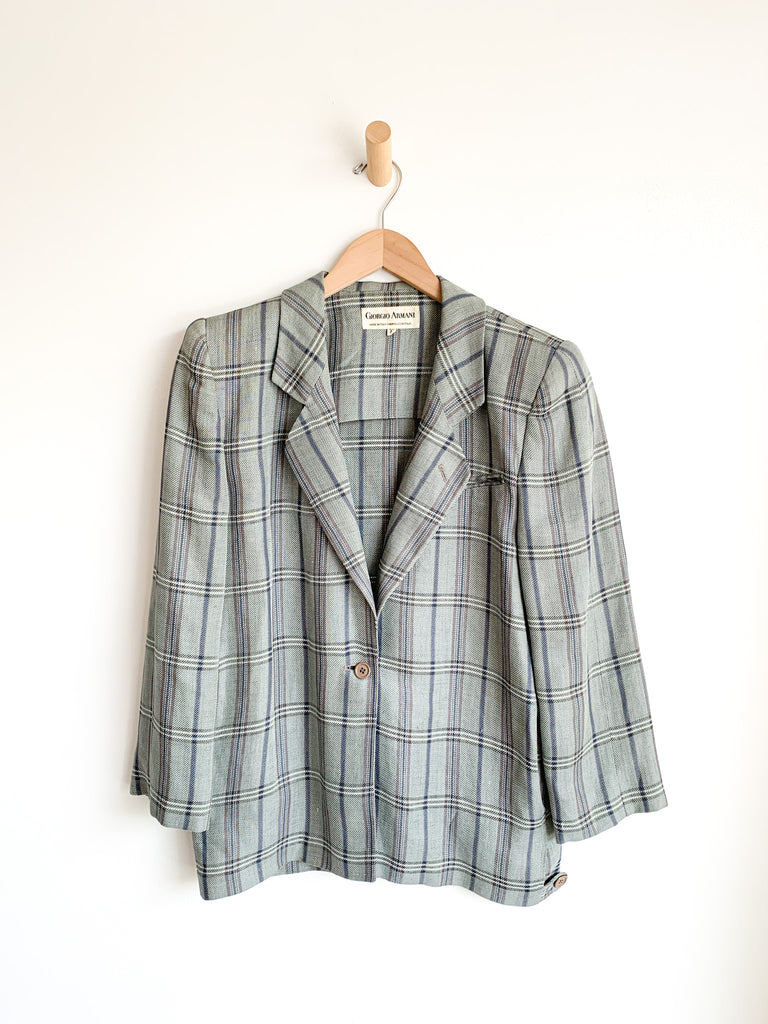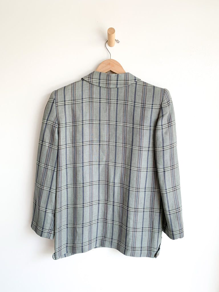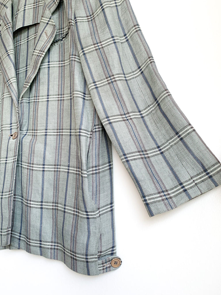 Blue toned plaid boxy blazer. Oversized fit in a heavy linen, perfect for Spring wardrobe. Wear with denim or a long skirt. Single button closure, notched lapel, side pockets and side buttons.