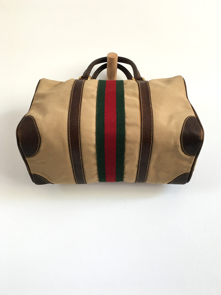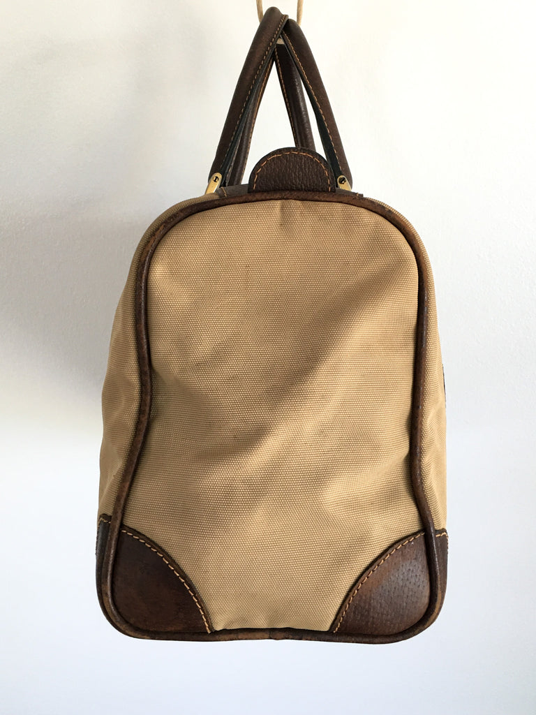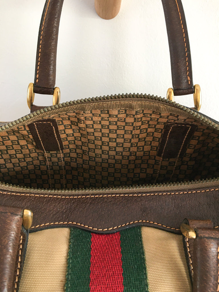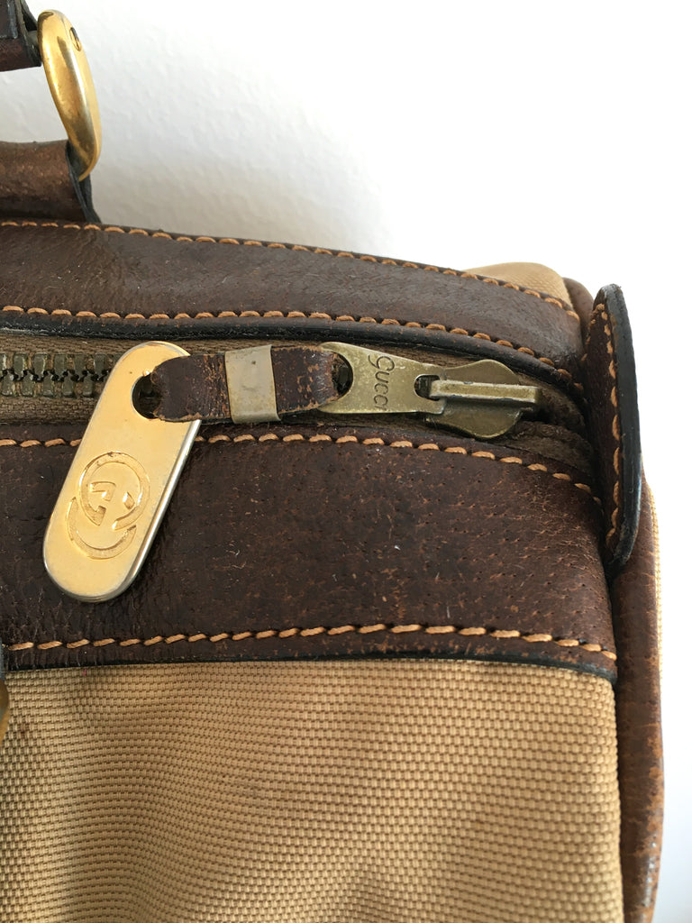 Canvas Gucci bag circa 1970’s with the best interior and classic exterior. Great worn patina, dark brown leather & gold tone hardware accents. Classic Boston, speedy, mini-duffle style.
