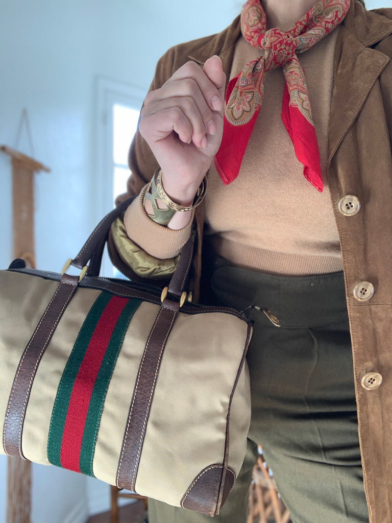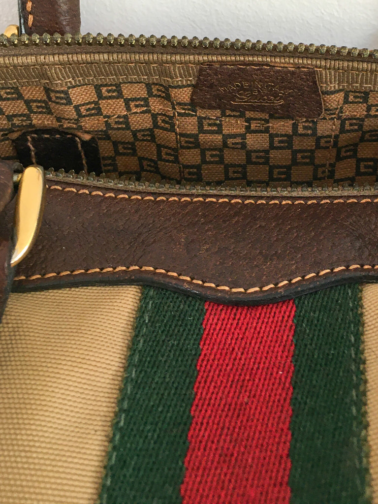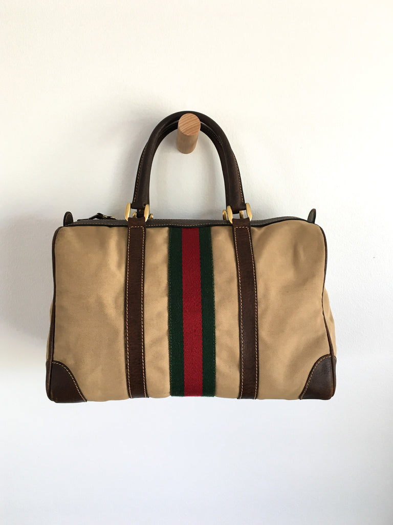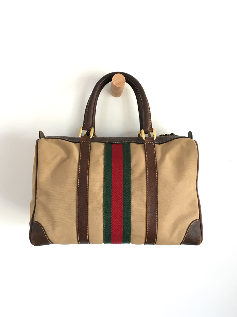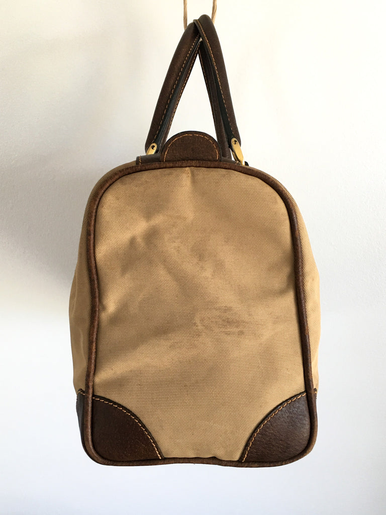 Canvas Gucci bag circa 1970’s with the best interior and classic exterior. Great worn patina, dark brown leather & gold tone hardware accents. Classic Boston, speedy, mini-duffle style.