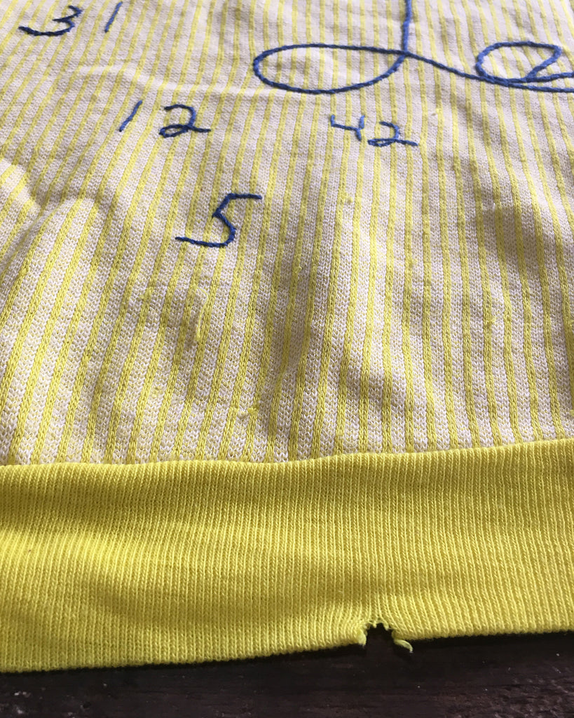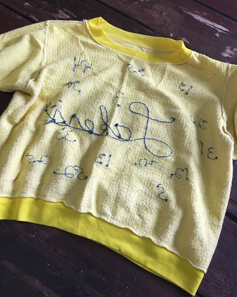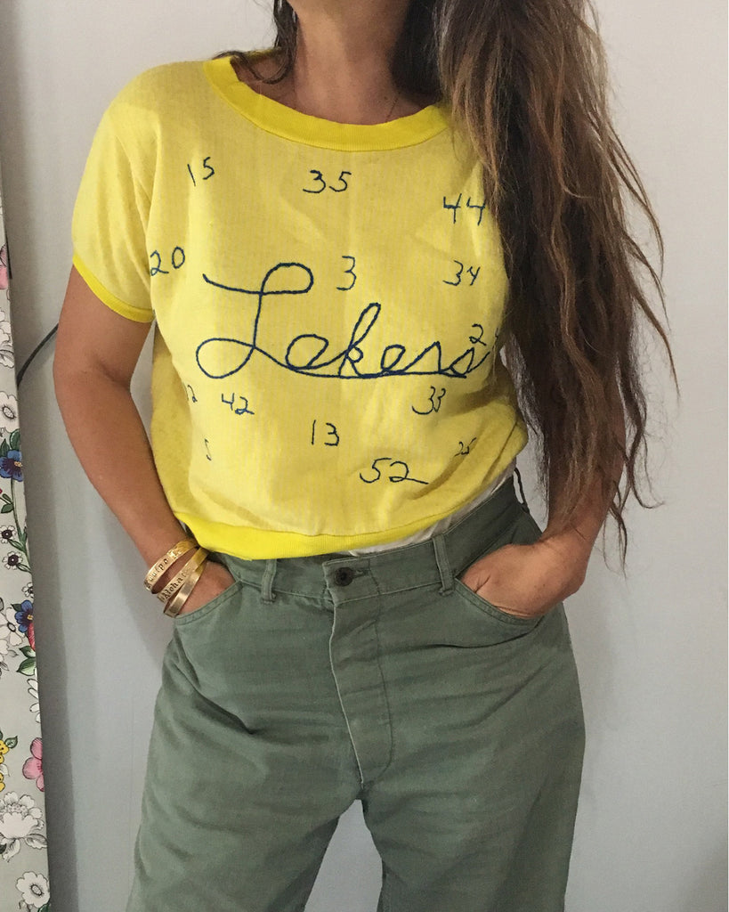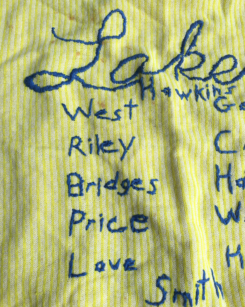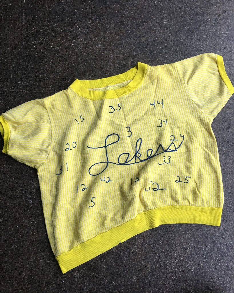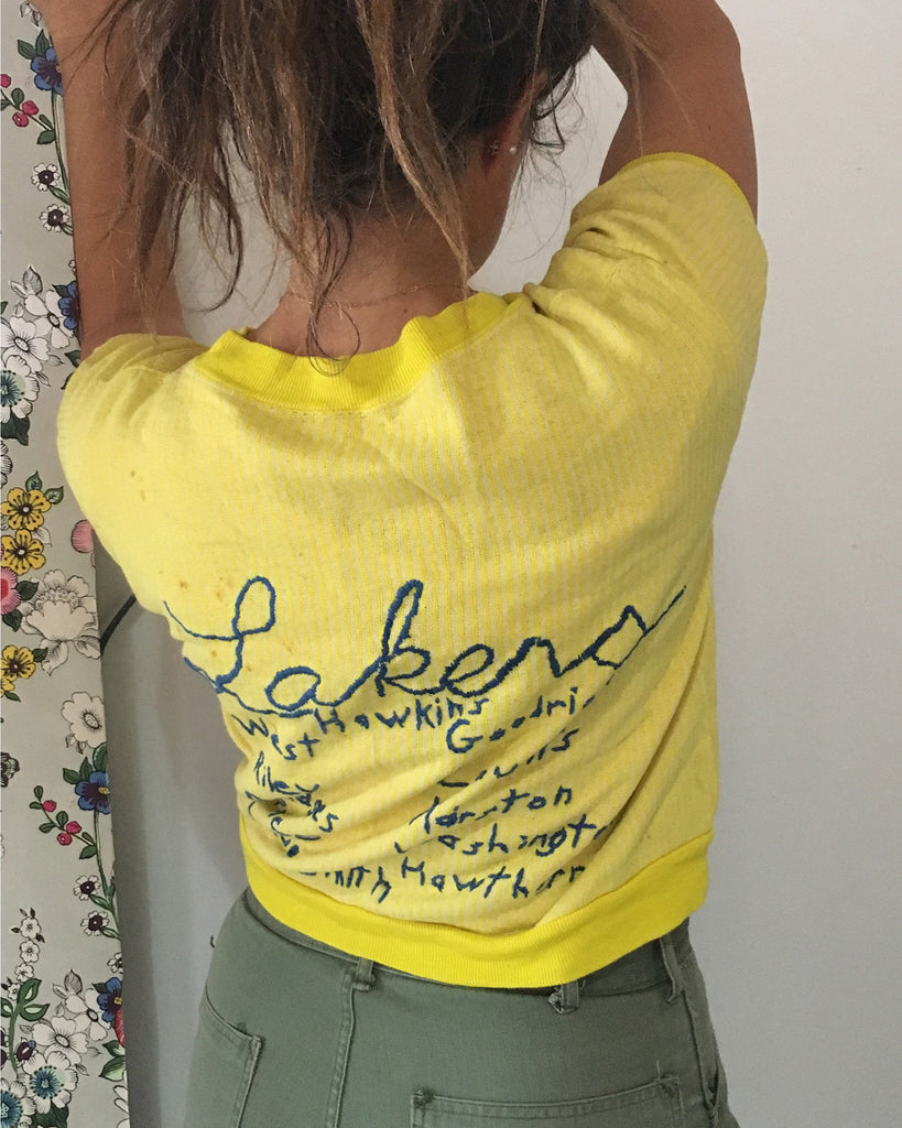 This is a one-of-a-kind short sleeve collectors sweatshirt, most likely embroidered by a Los Angeles Lakers super-fan. It comes from an affluent area of Los Angeles where NBA players have resided over the years.