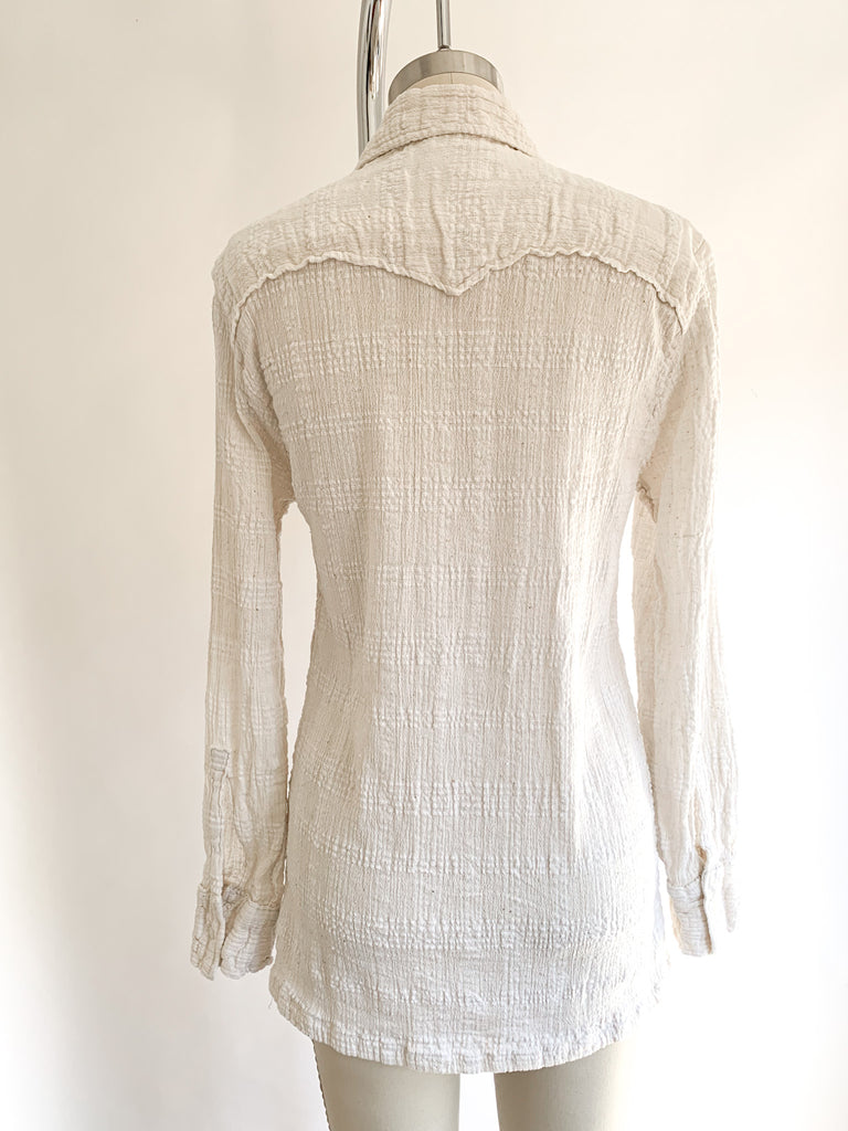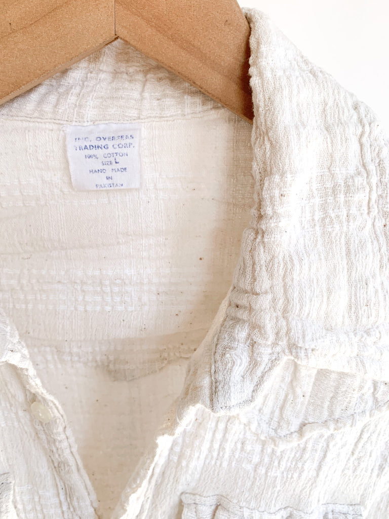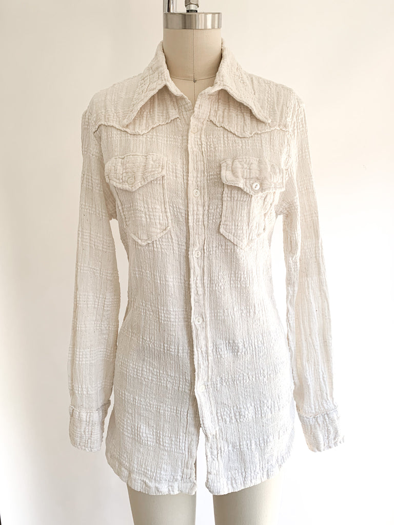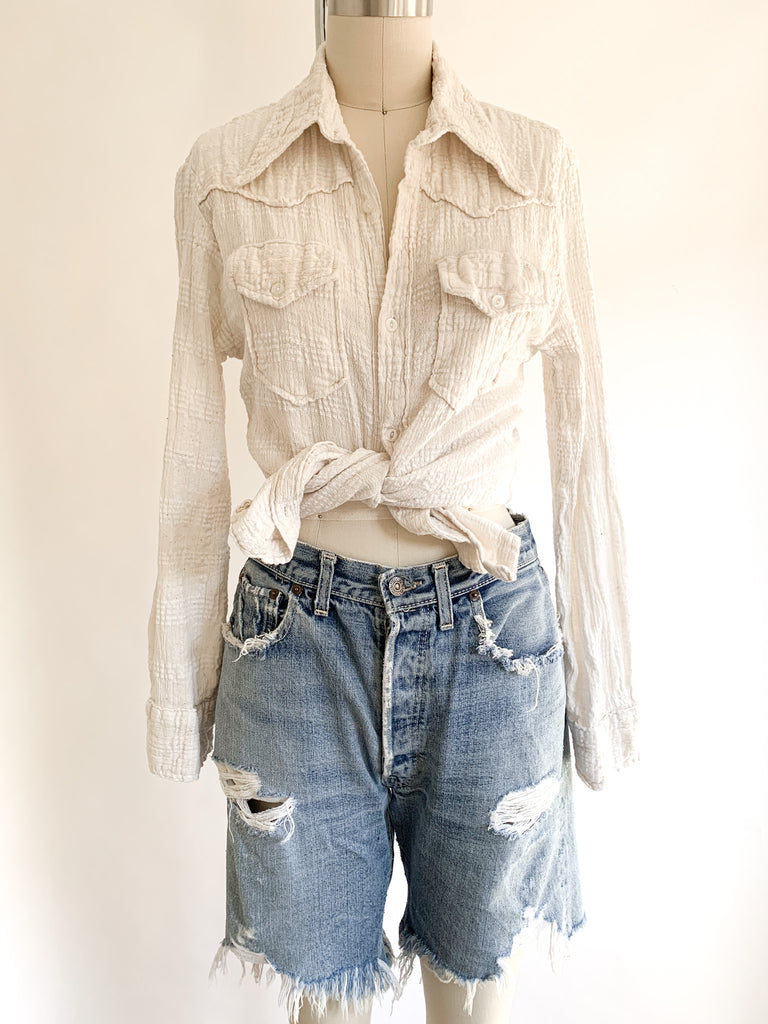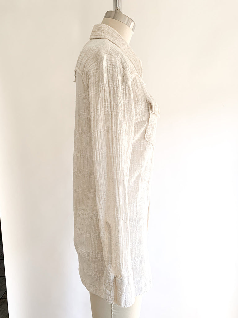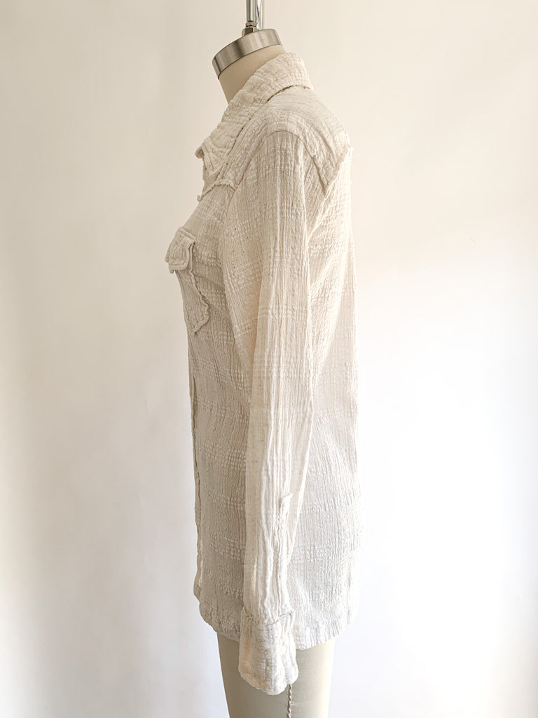Flattering fitted button front loose weave cotton gauze long sleeve shirt. Has a bit of fiber stretch.