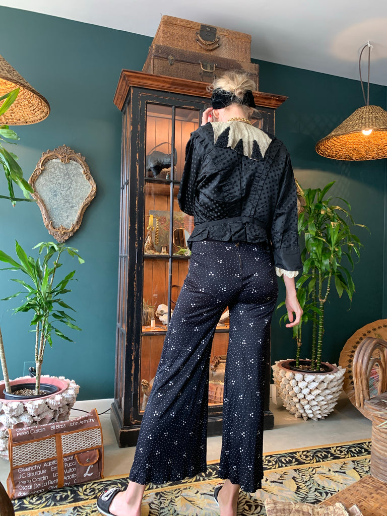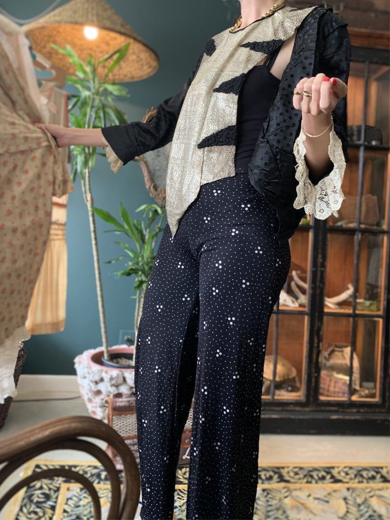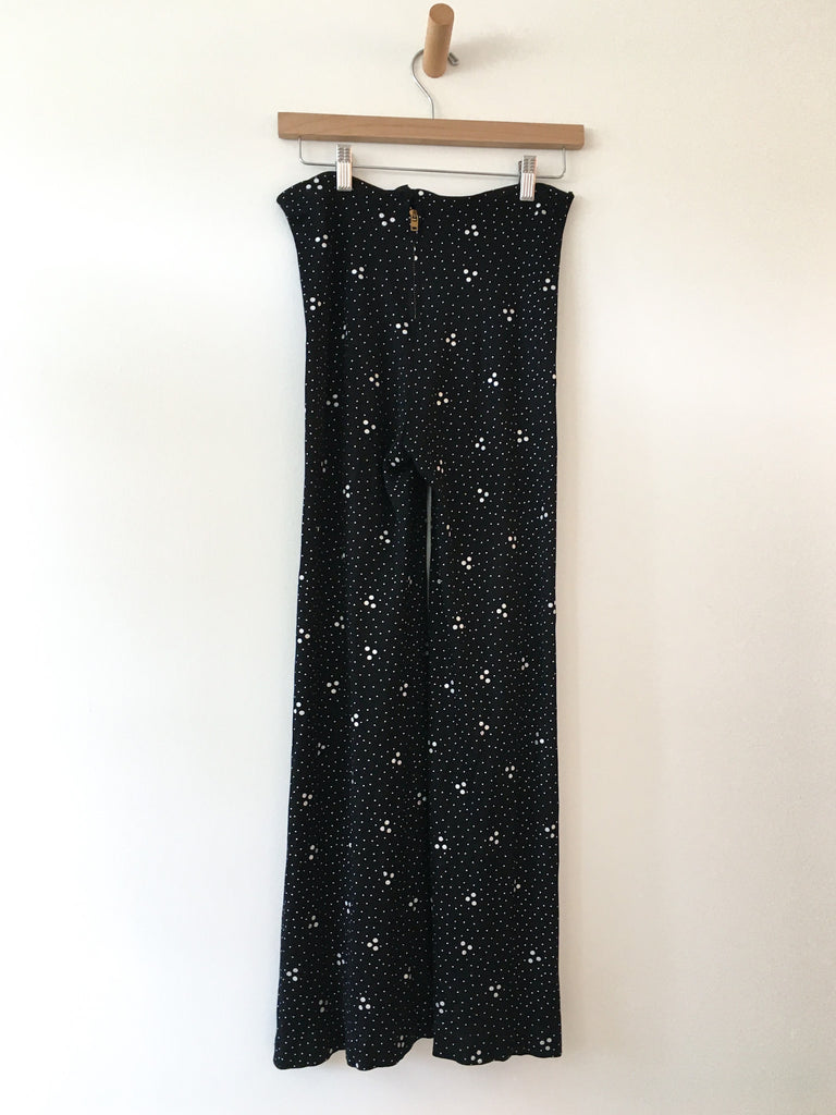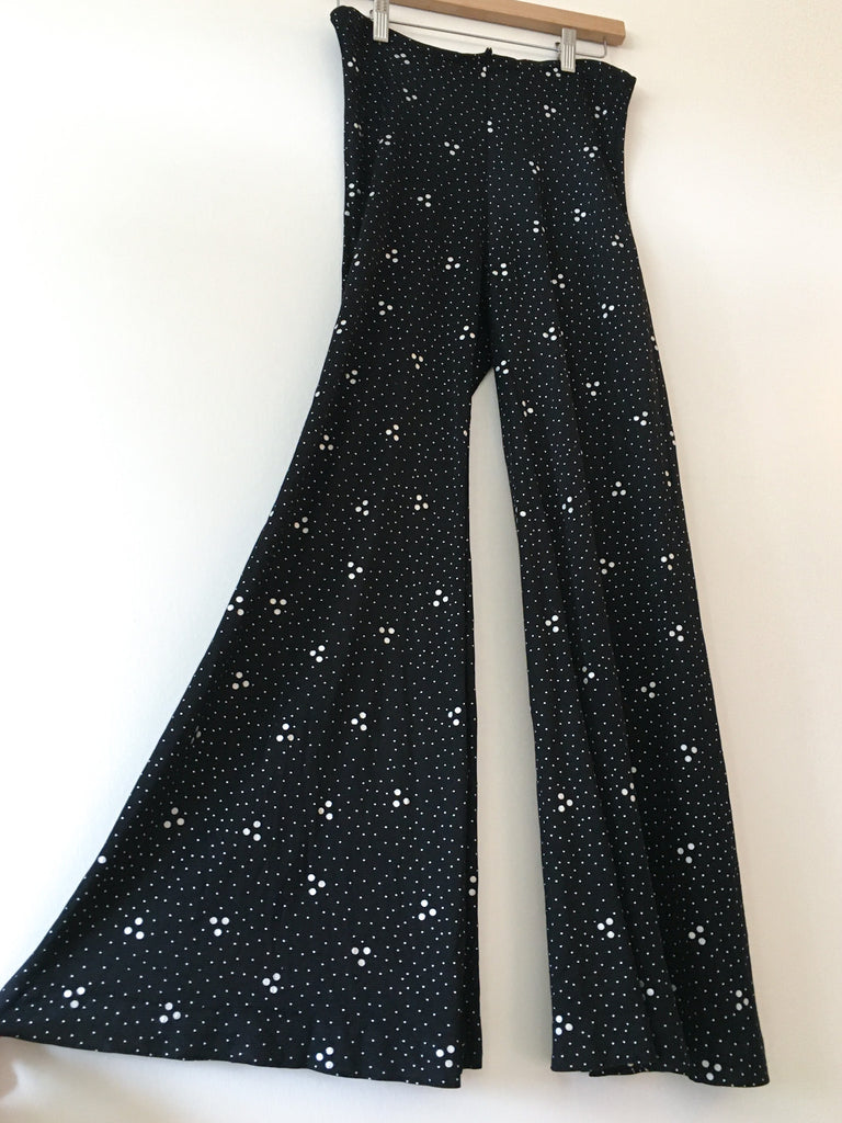 Wide leg at ankle fitted through the leg flattering silhouette stretch nylon jersey pants. Dot printed motif makes me think of galaxies. Groovy 1970’s vibes. Metal zip at back.