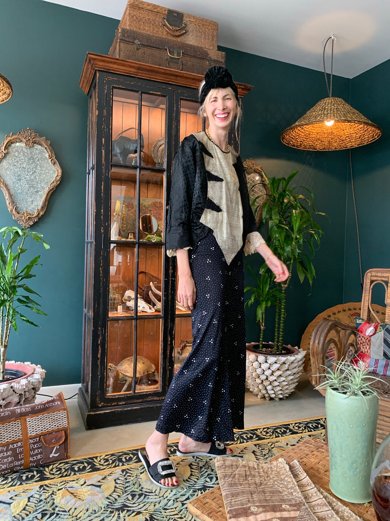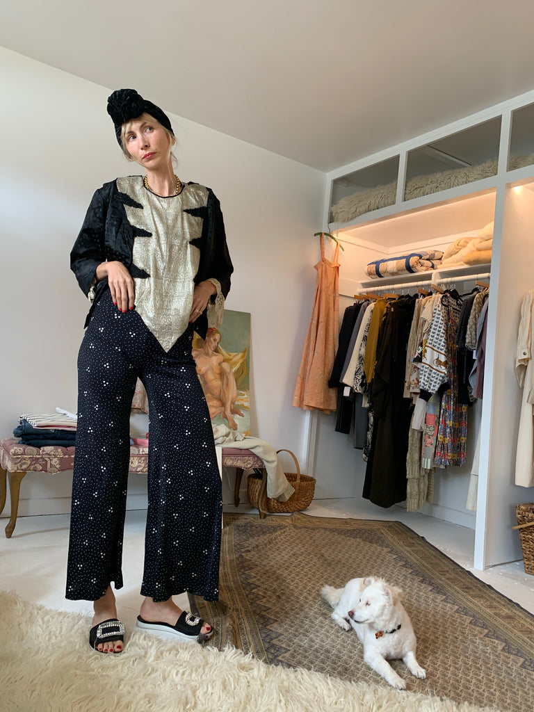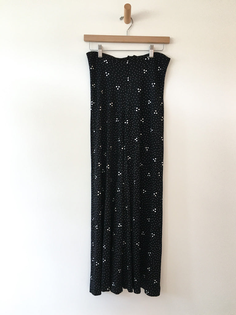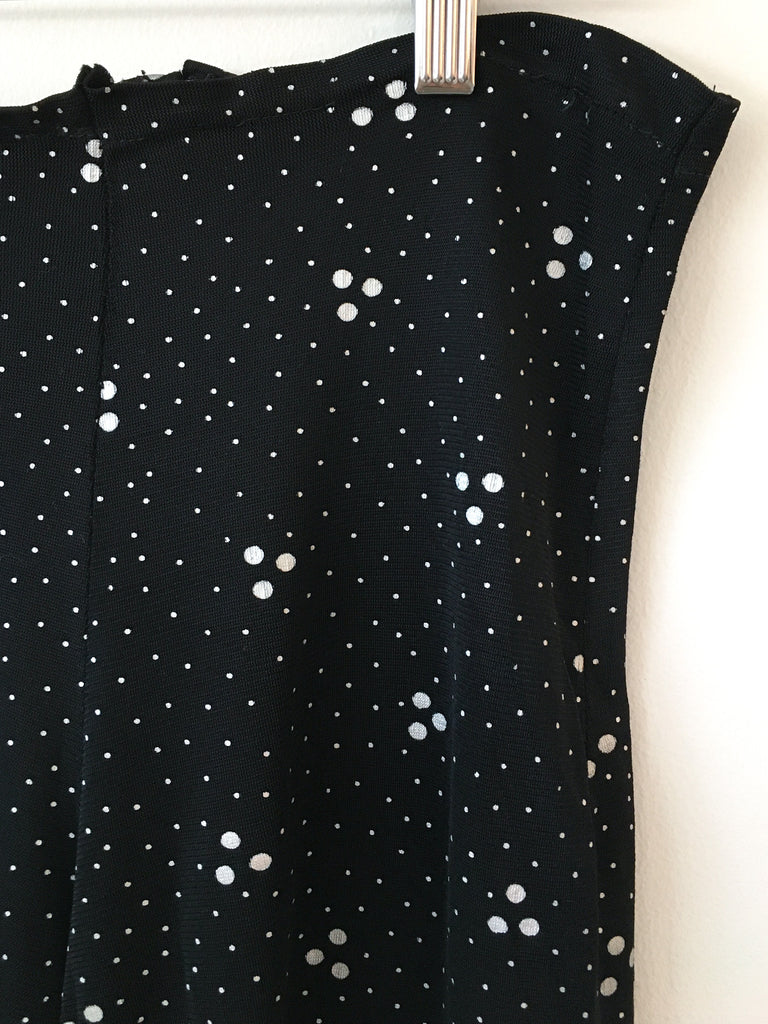 Wide leg at ankle fitted through the leg flattering silhouette stretch nylon jersey pants. Dot printed motif makes me think of galaxies. Groovy 1970’s vibes. Metal zip at back.