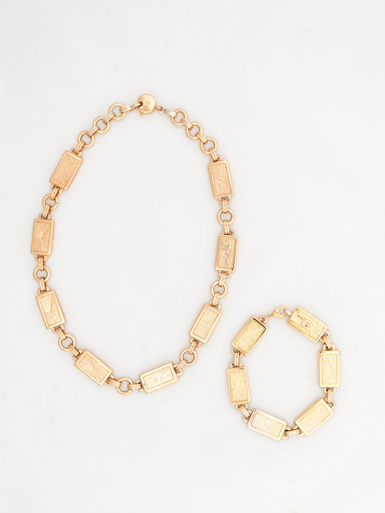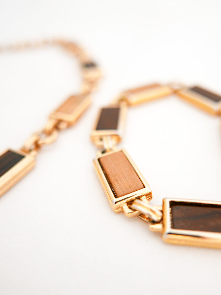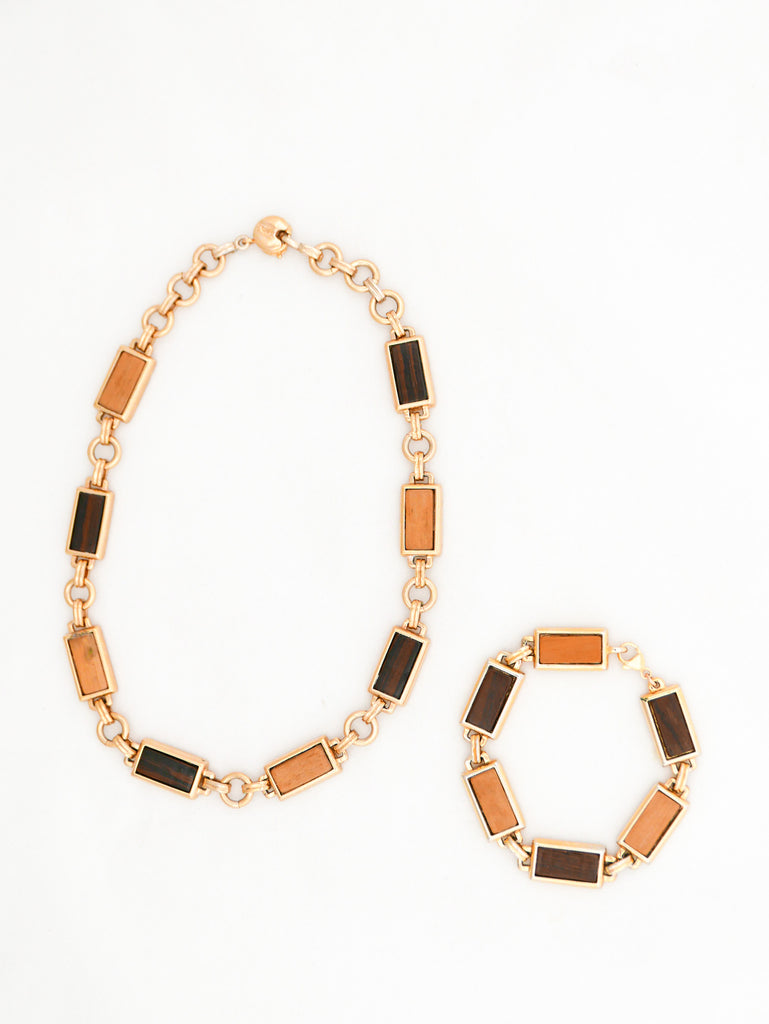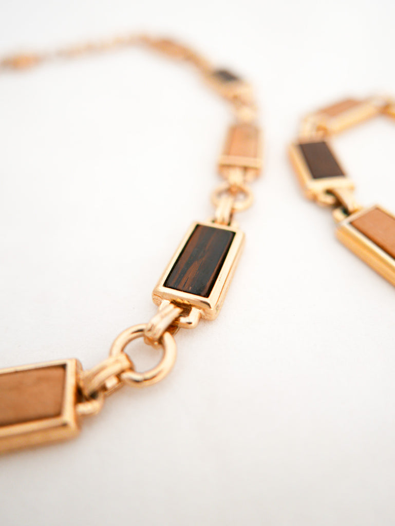 Unique wood and gold plate YSL link necklace and matching bracelet. Stamped and with.