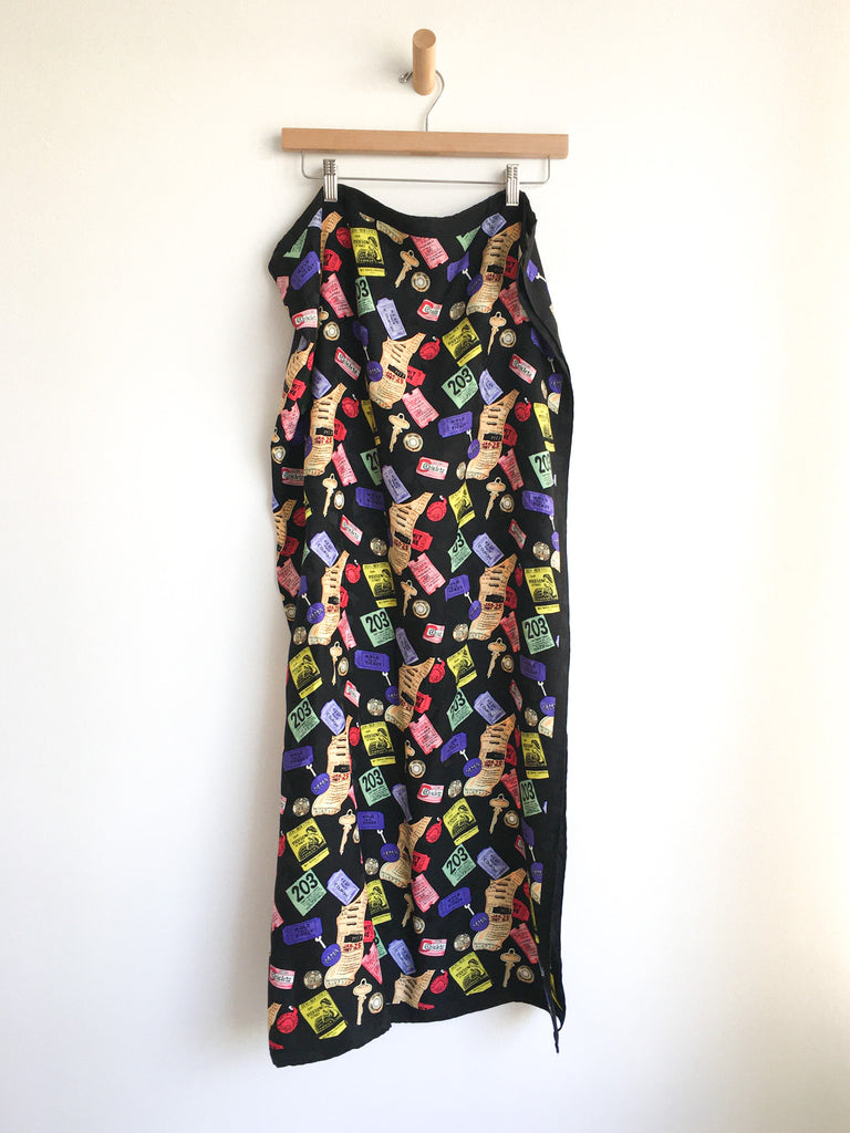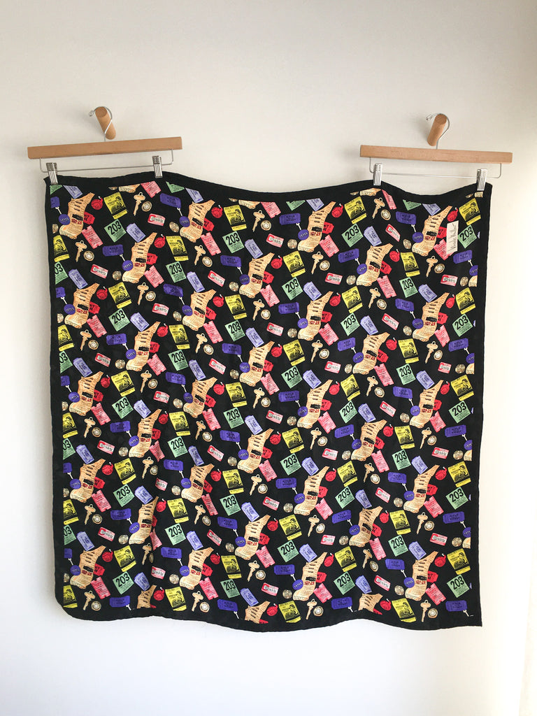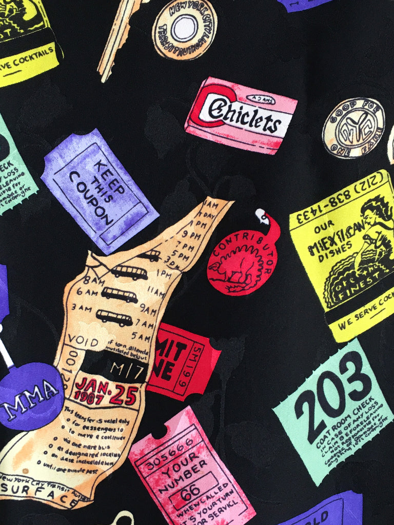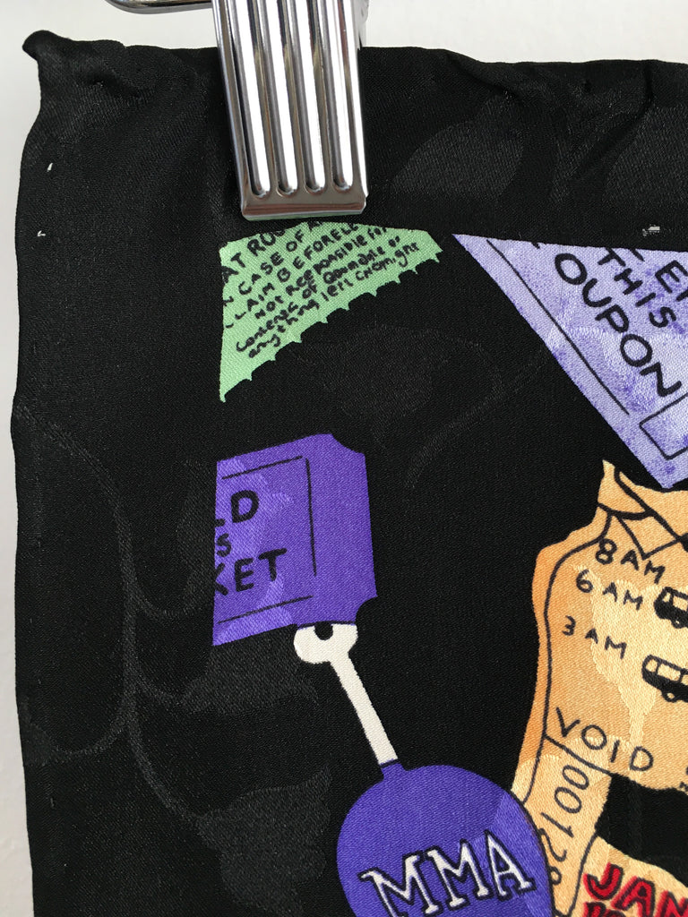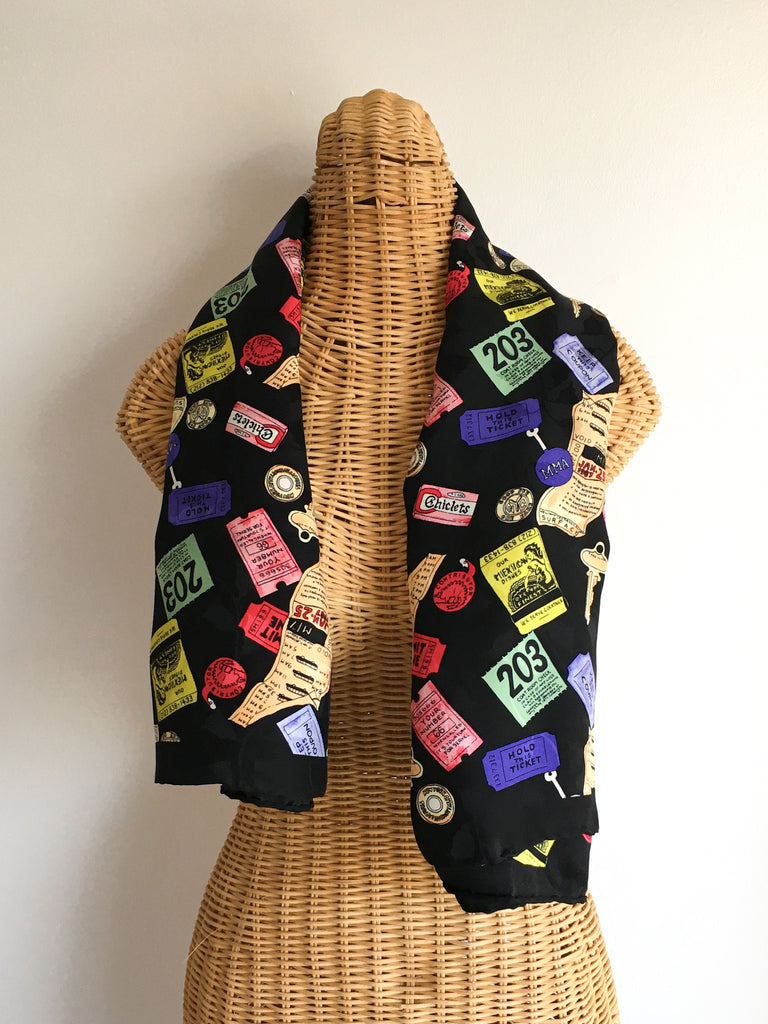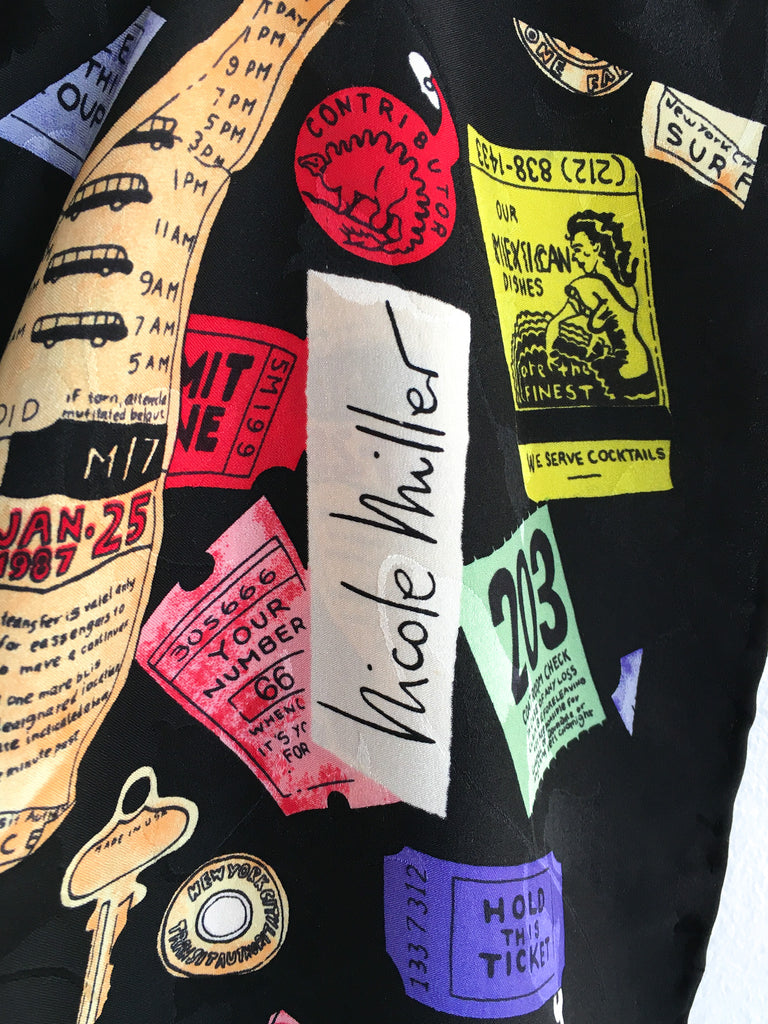 Collectible late 80’s/early 90’s extra large silk Nicole Miller scarf covered in “contents of a purse” from subway tokens to ticket stubs.
