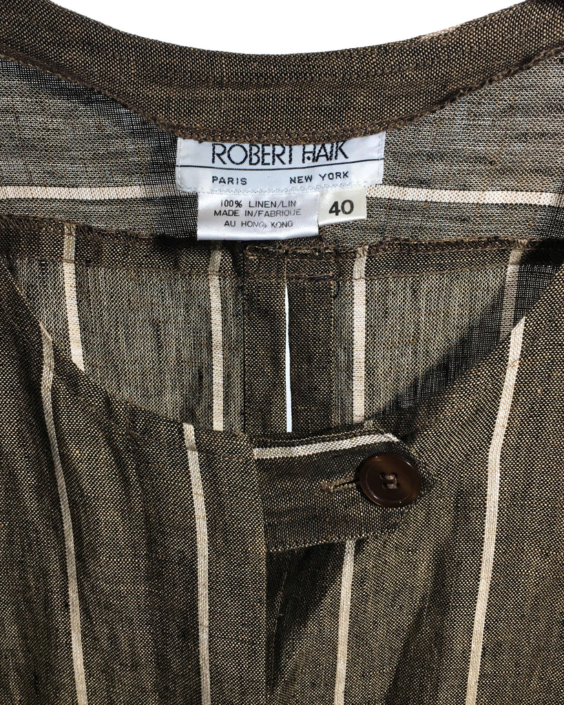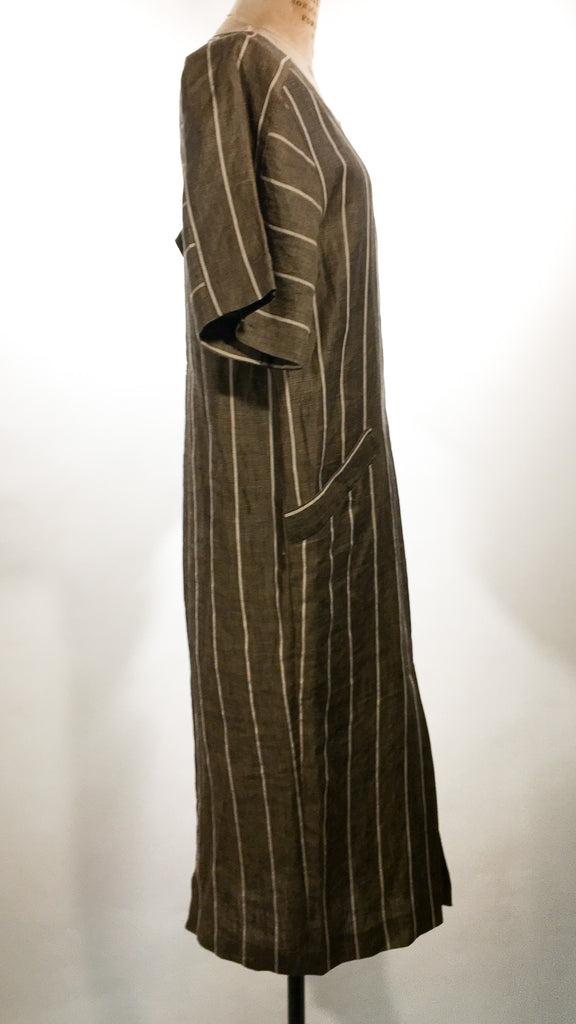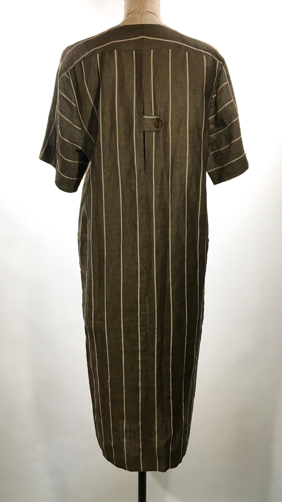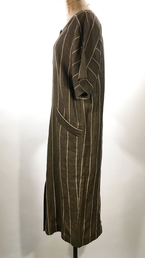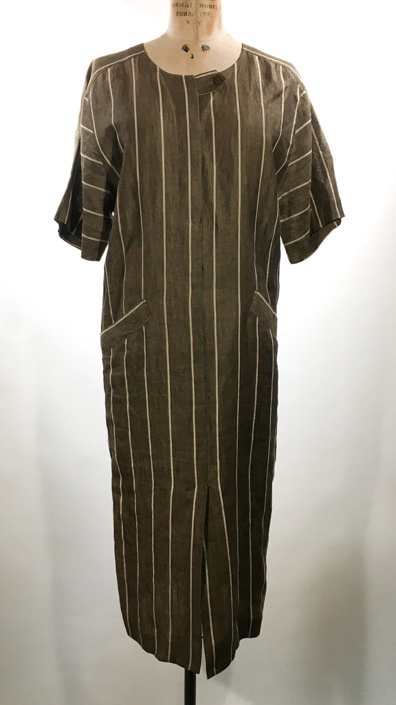 1980’s brown with taupe stripes linen dress. Buttons at front & back. Pockets and draped shoulder with dolman sleeve. Avant Garde shape.