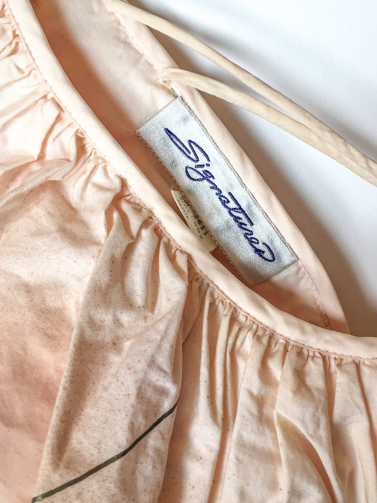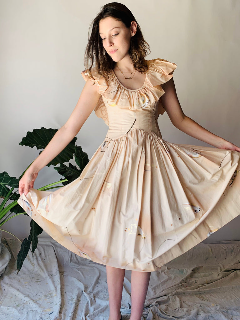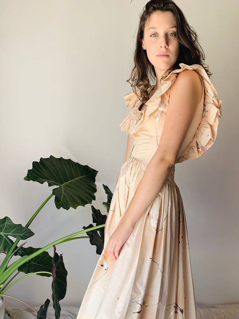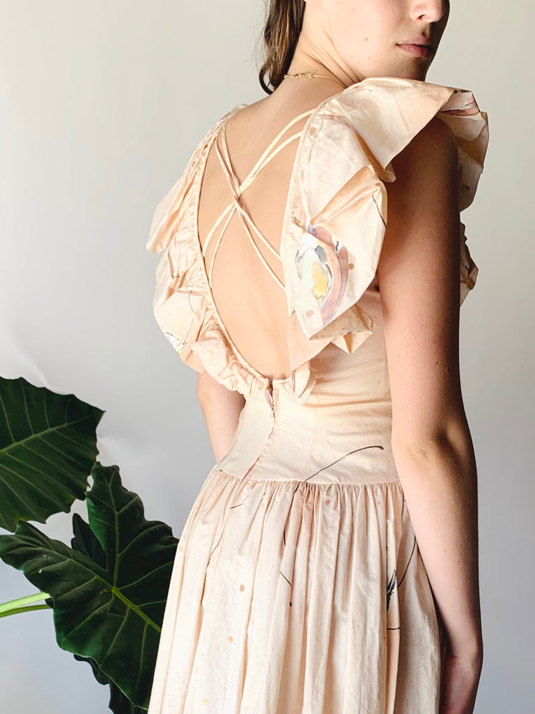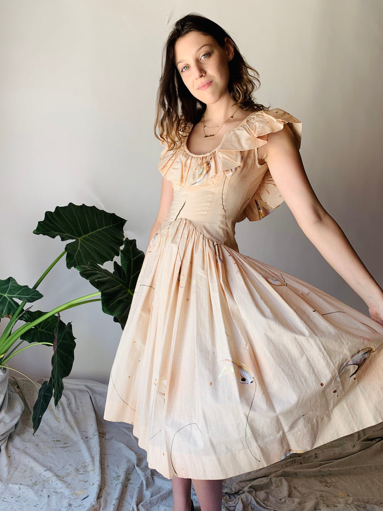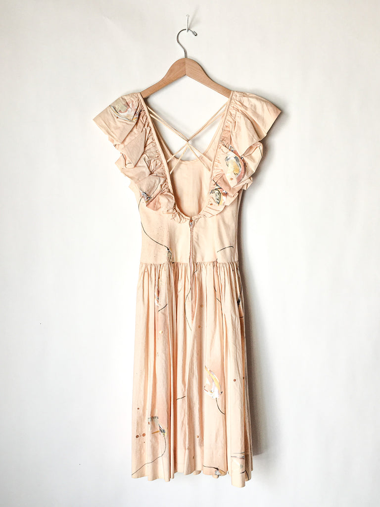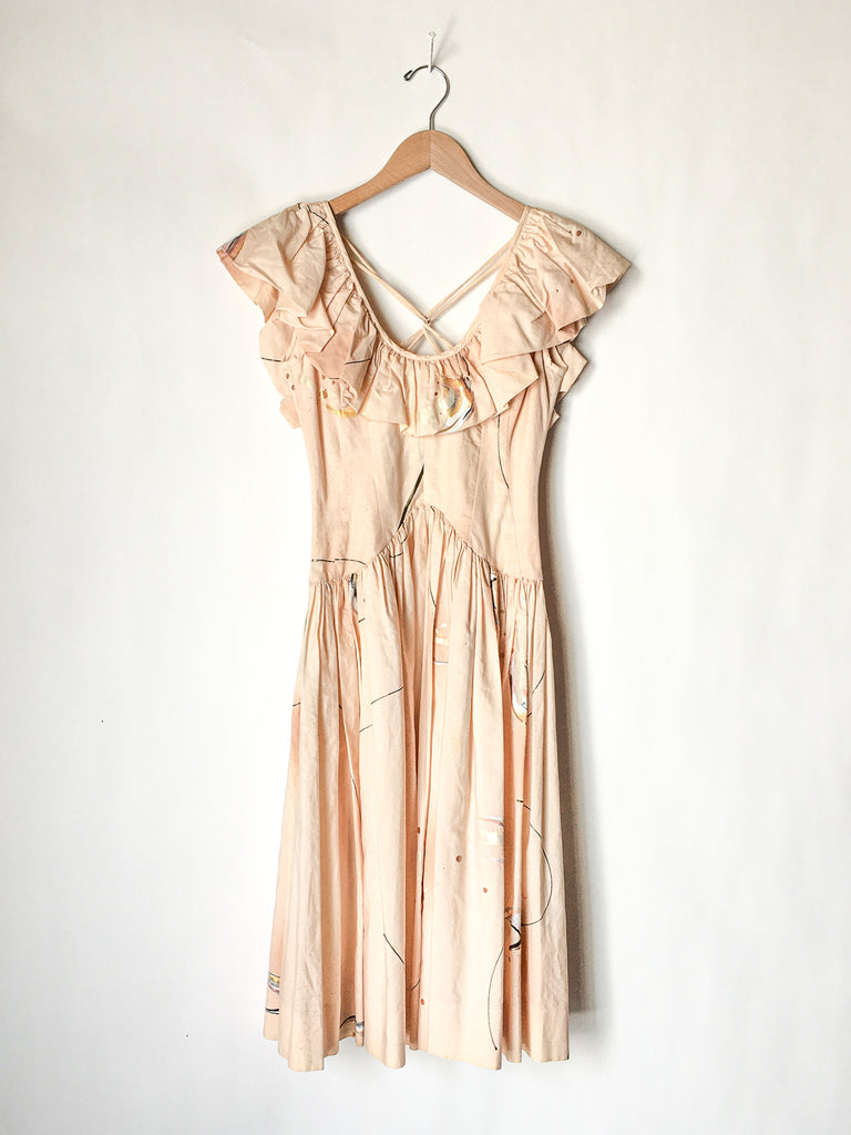 Sweet 1980’s pink cotton painted dress featuring ruffled collar, cross-cross back, fitted bodice and gathered, flared skirt. Painting is abstract and subtle. Zips up back.