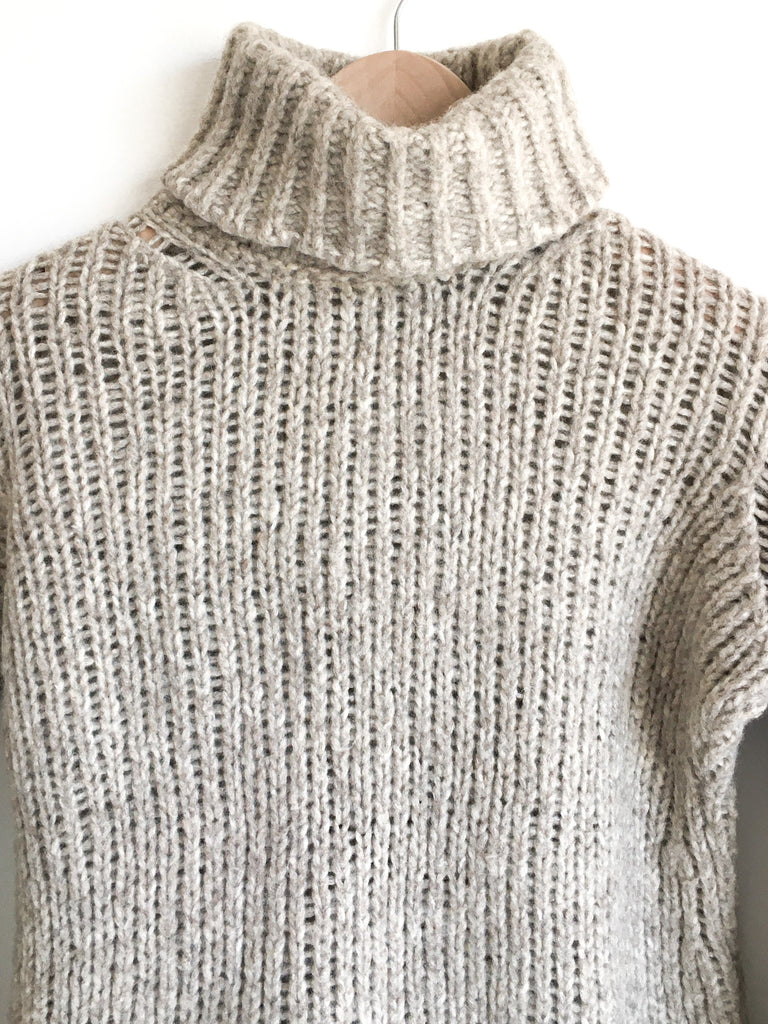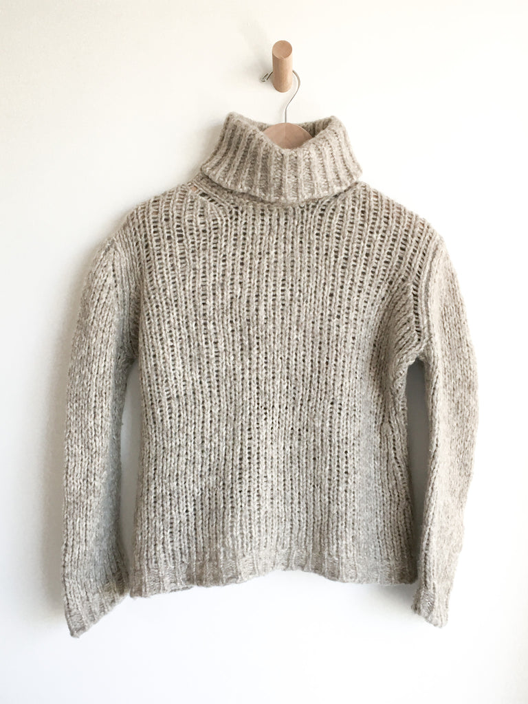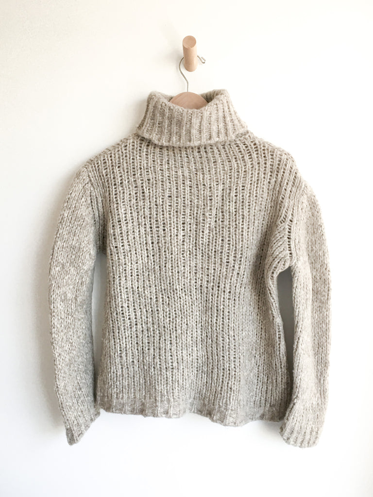 Perfect chunky wool turtleneck in neutral heathered oatmeal.