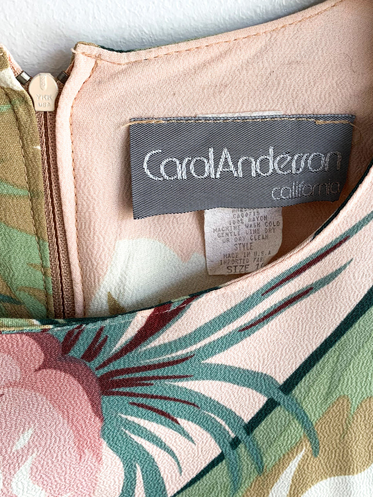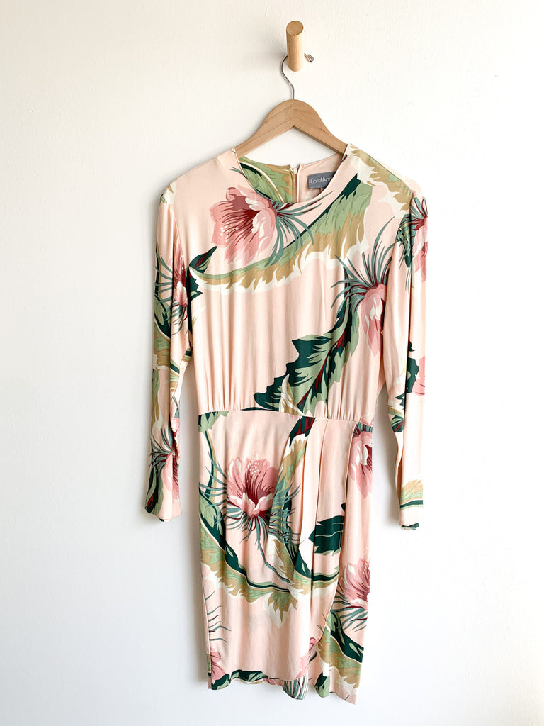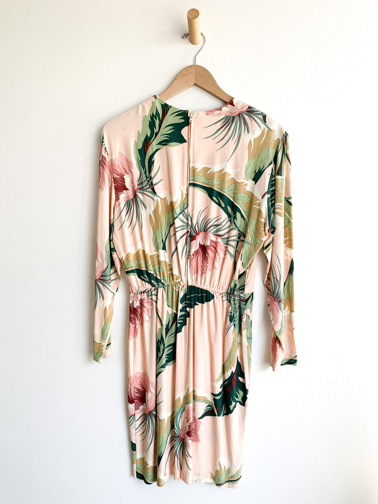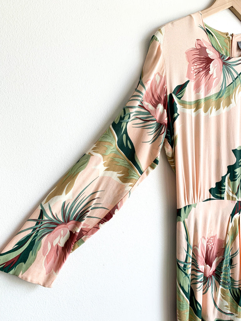 Fantastic larger than life tropical foliage on a soft pink background makes an otherwise simple silhouette come to life in this easy to wear sleeve dress. Back zip, long sleeves, scalloped edged split skirt. Throw on a belt and some slides. Voila!