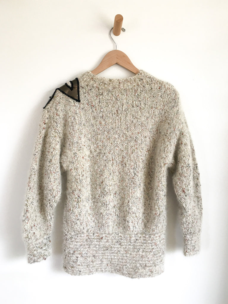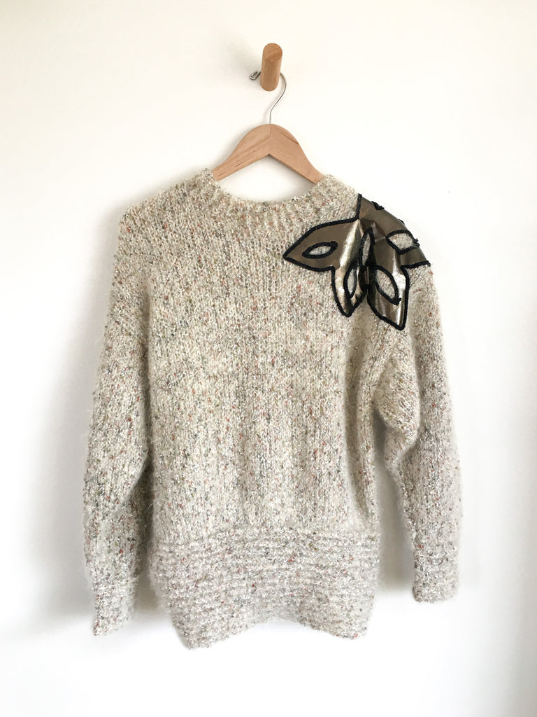 Wild and wonderful. Fuzzy mohair & rayon dolman sleeve sweater with floral appliqué. Ribbed at waist makes a flattering shape.
