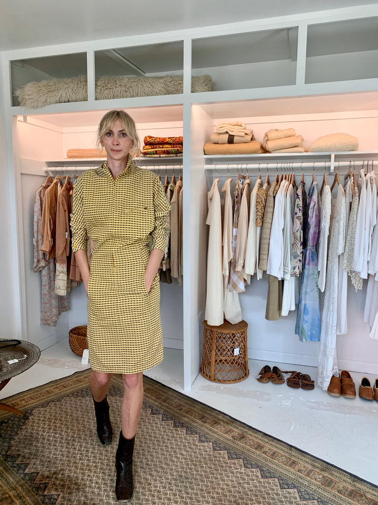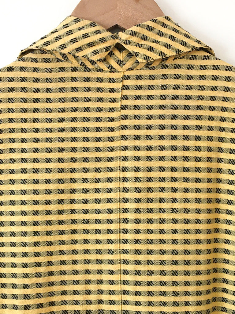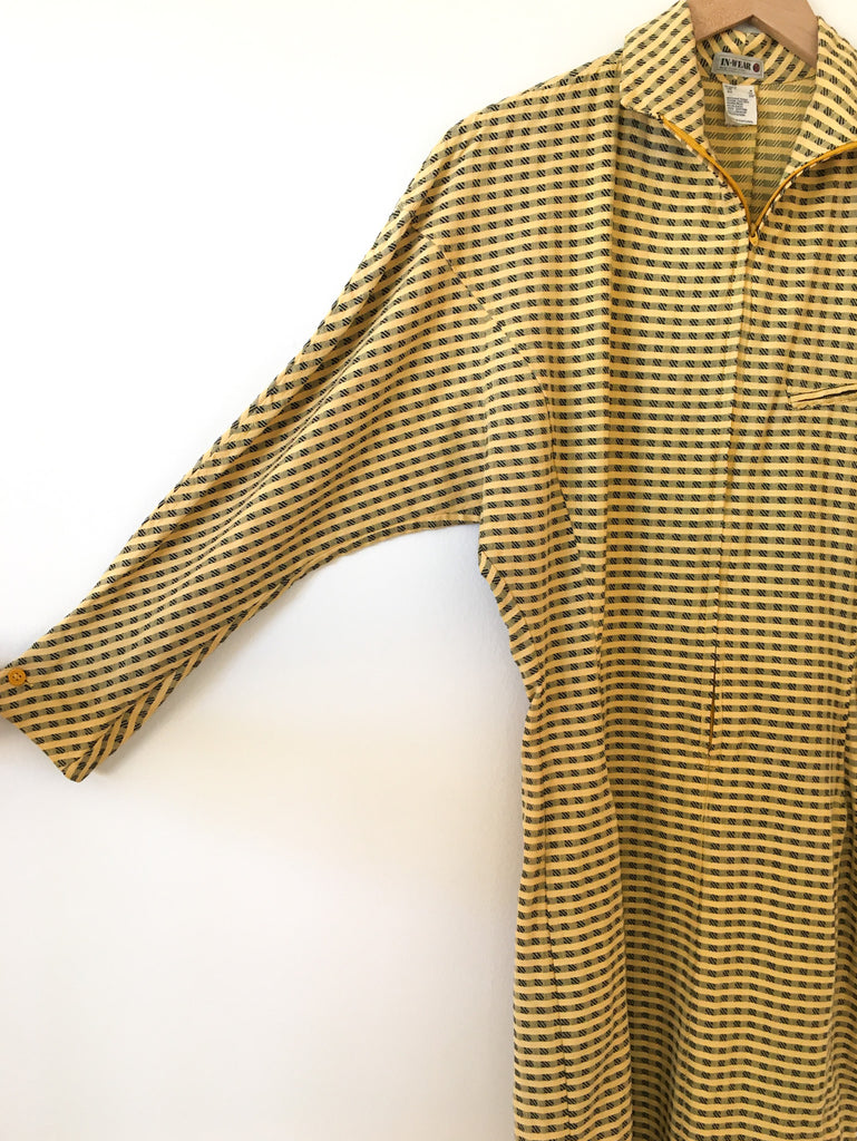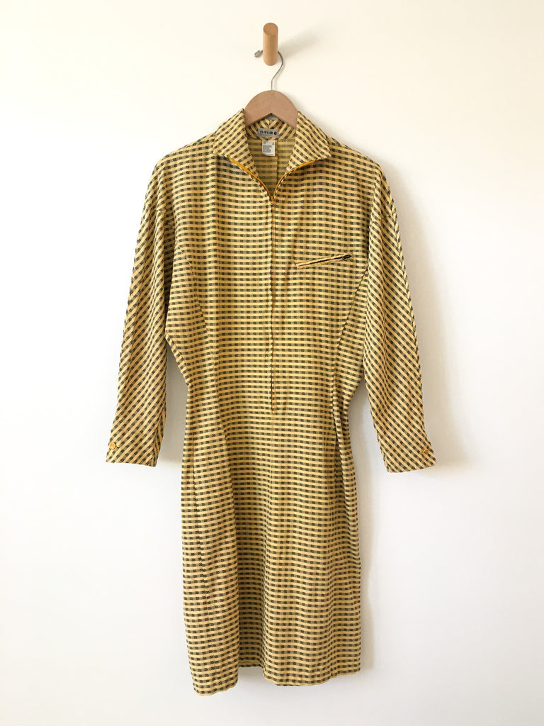 Zip front 1980’s Avant Garde checked yellow and black dress with dolman sleeves. Super fitted body-con cotton with perfectly placed front pockets. Please note this is very tiny in the hips and skirt, must be extra small to fit over the head. Made in Portugal.