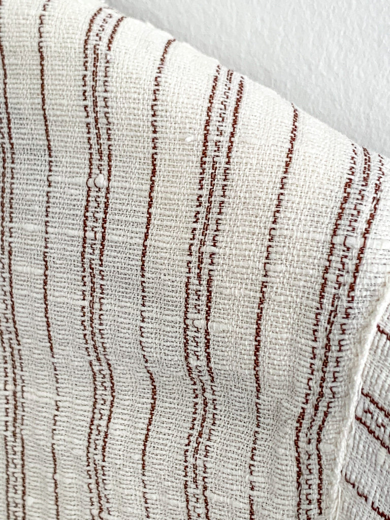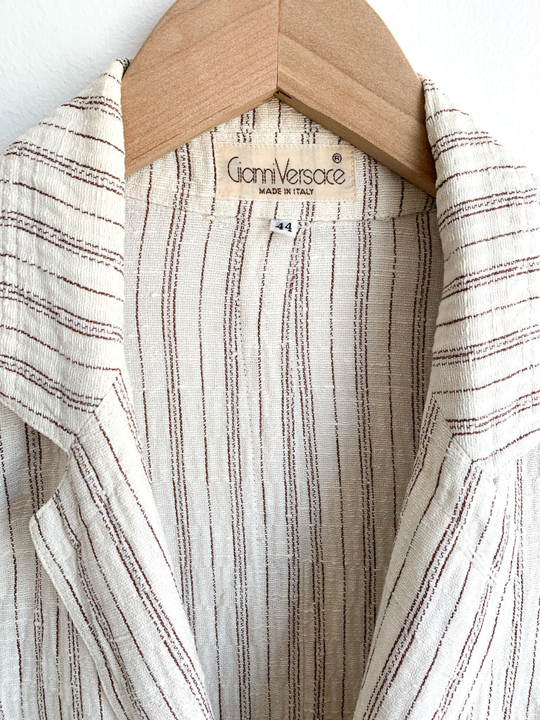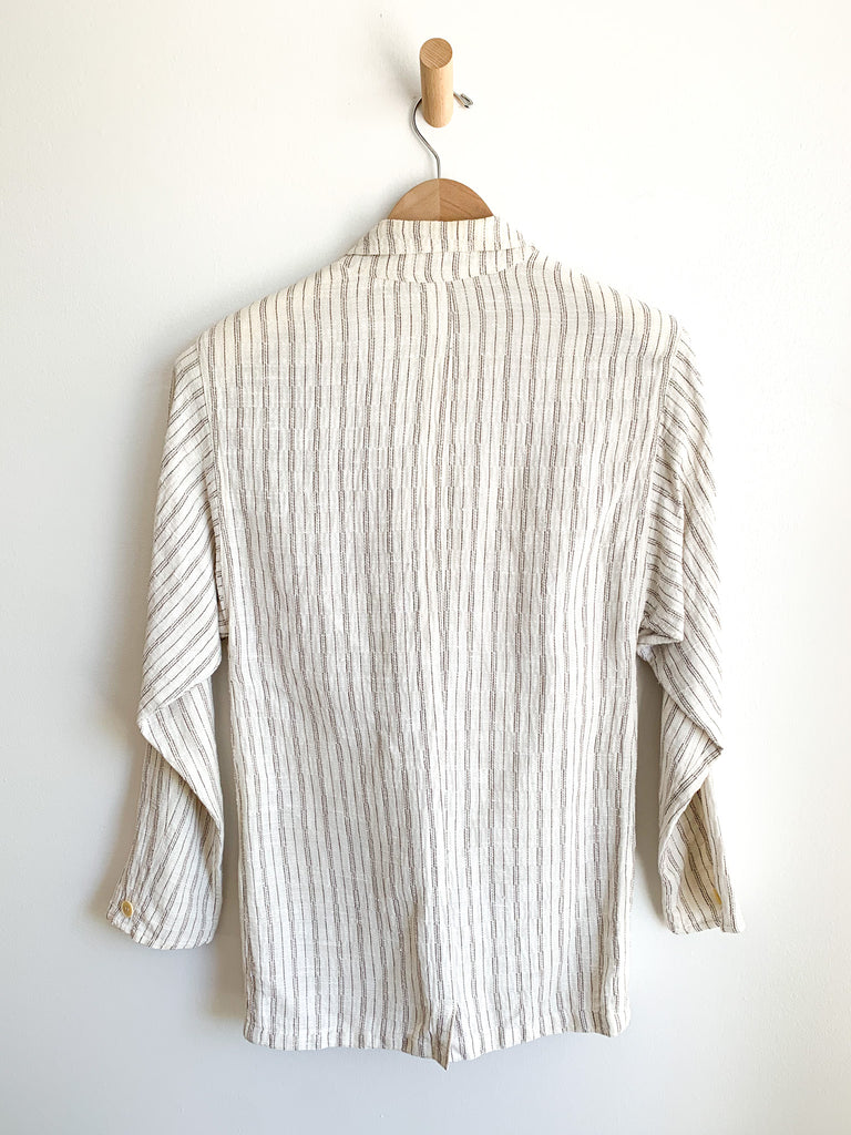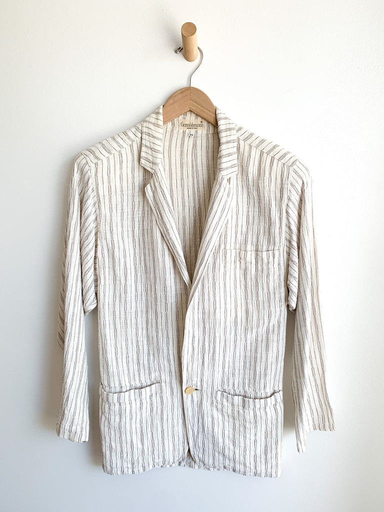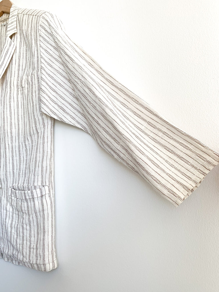 Subtle brown stripes on natural eggshell background linen blazer. Minimalist cut. Menswear look. Convenient pockets. Made and cut for a man.
