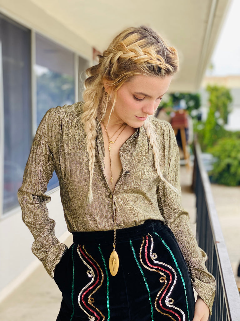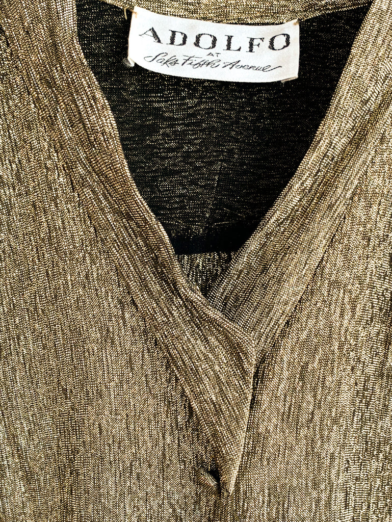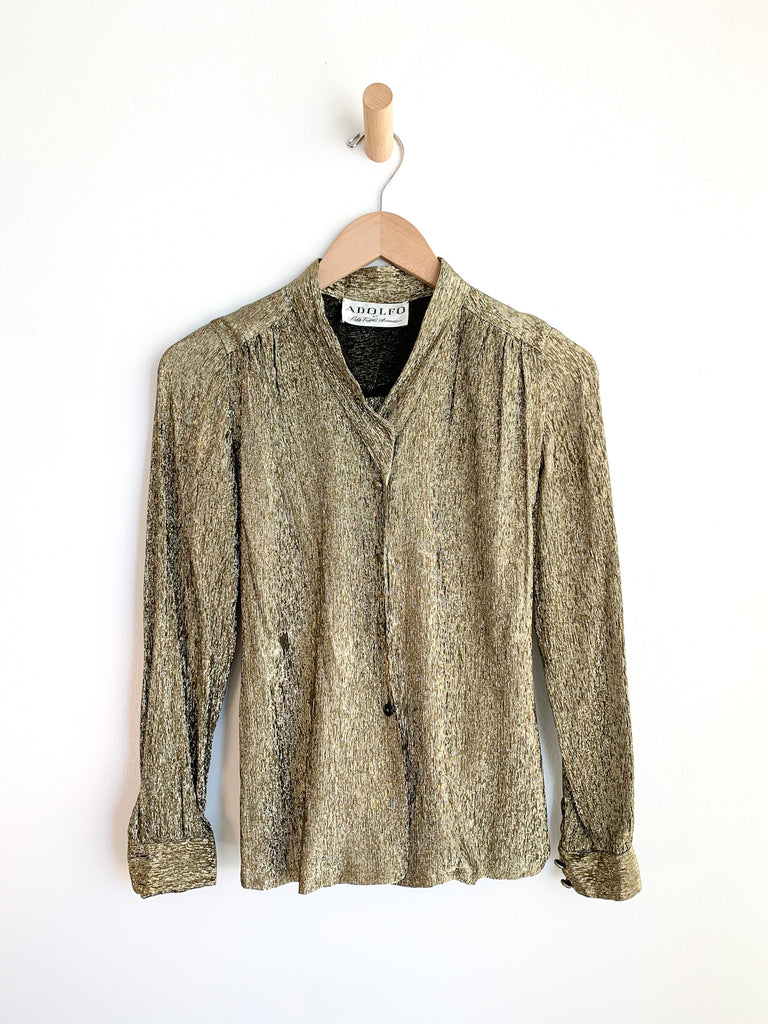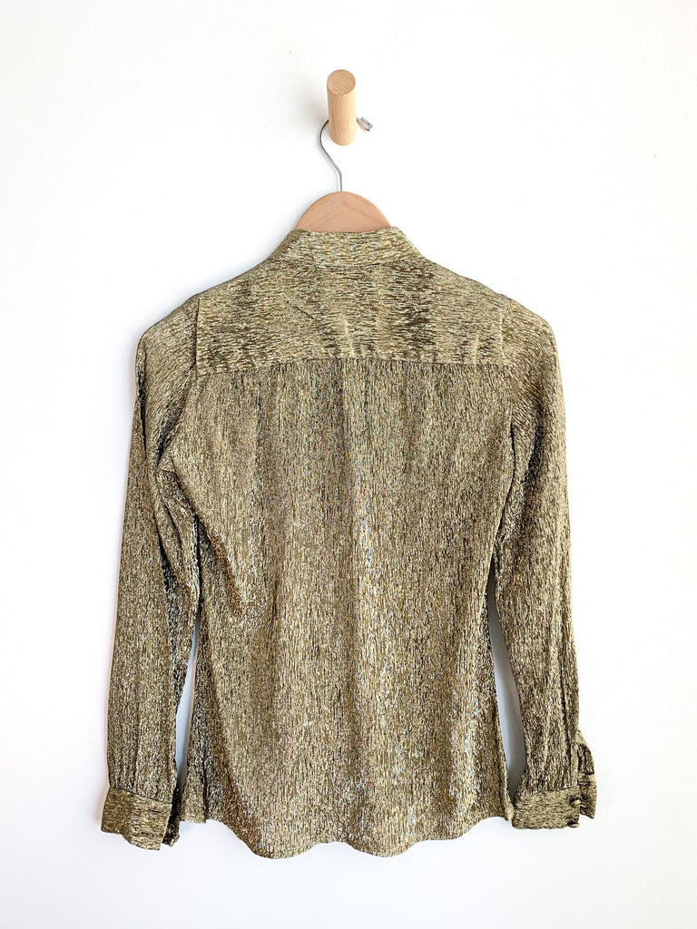 Slinky front button blouse with dainty shawl collar. Gold lamé sexiness looks amazing open low and tucked.