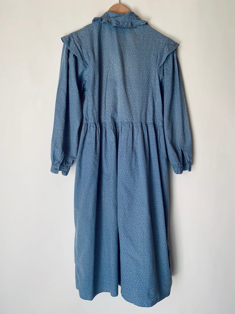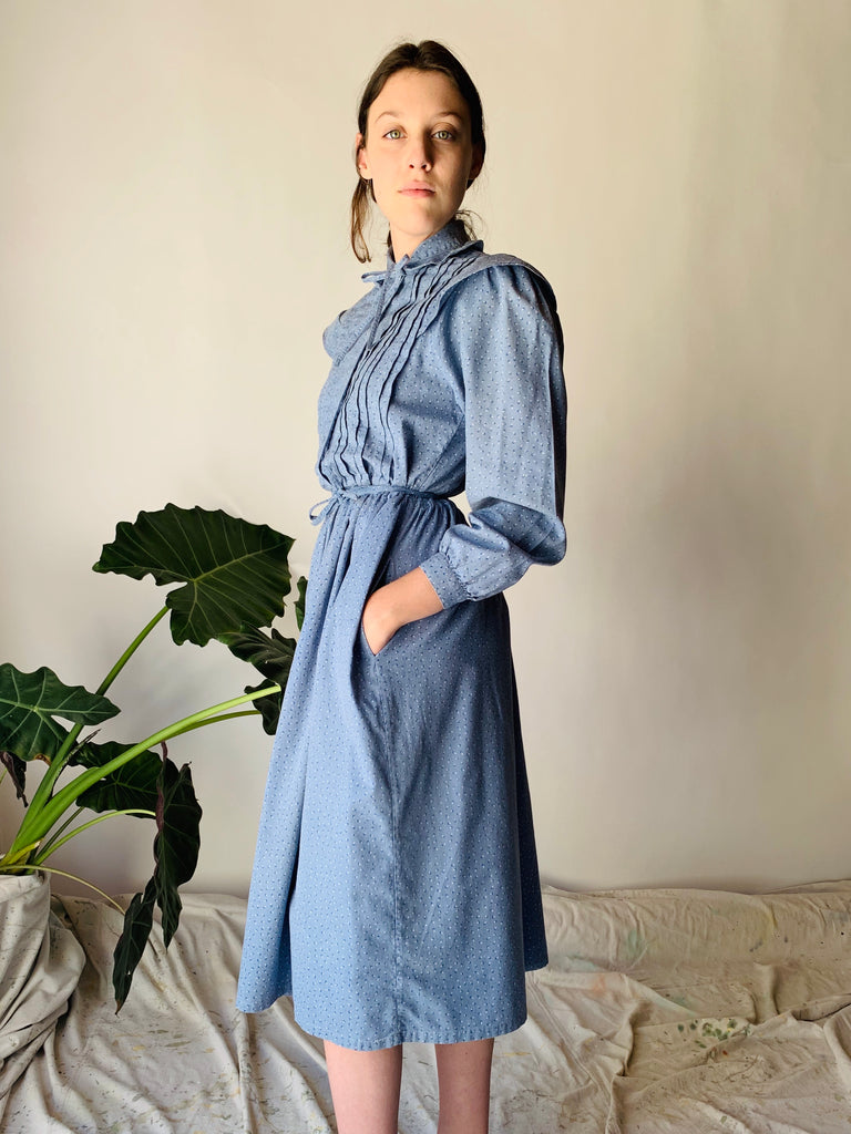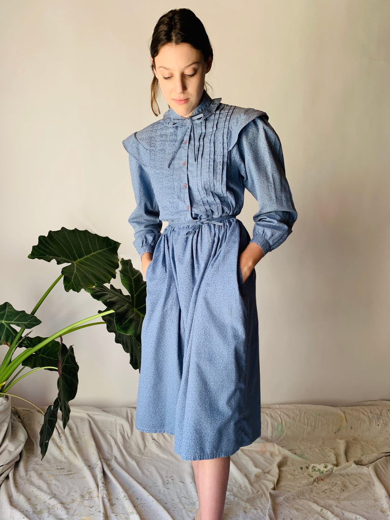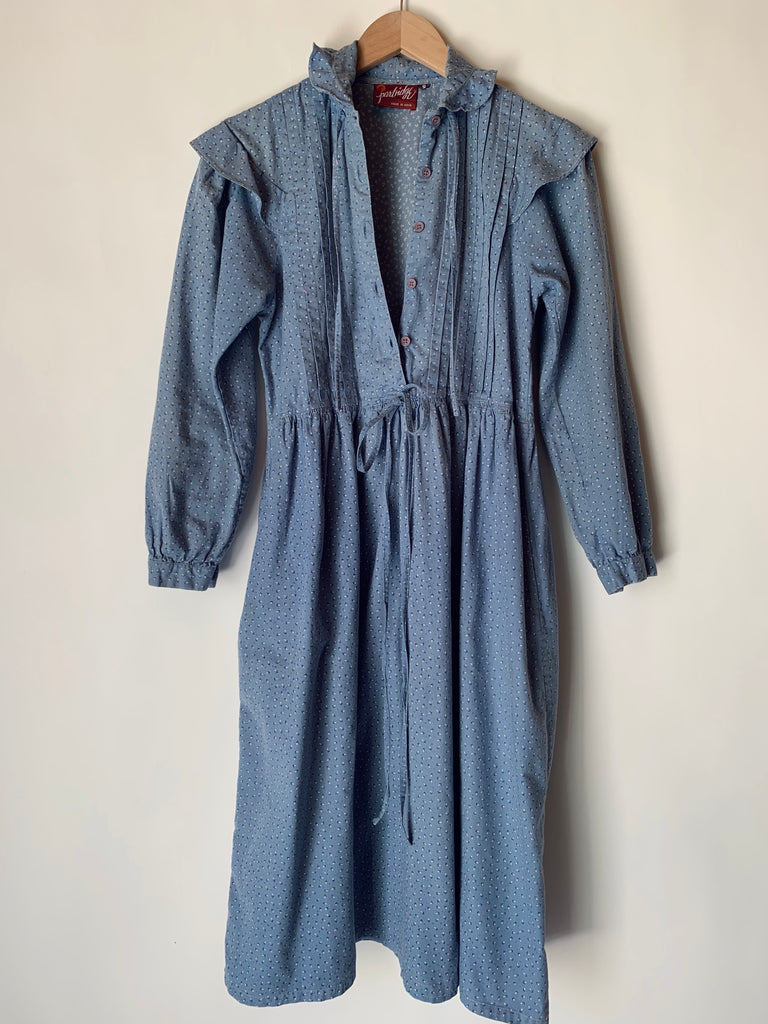 1970/80’s calico printed, brushed-cotton prairie midi-length dress. Distinctly feminine style with pleated chest, ruffles at neck, flared collar and shoulder detailing. Attached ties in same fabric at waist and neck. Wear ties or loose for a different overall vibe. Side pockets and buttons at front. Simple pullover style.