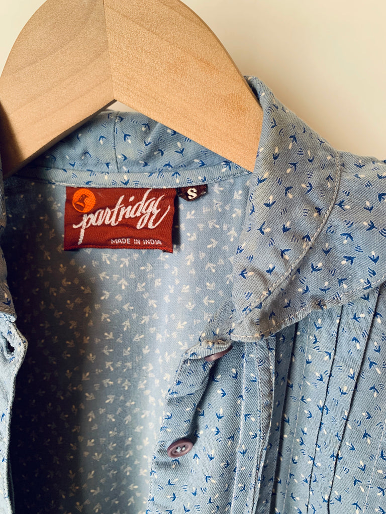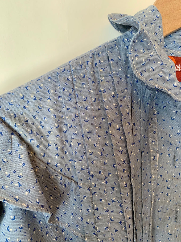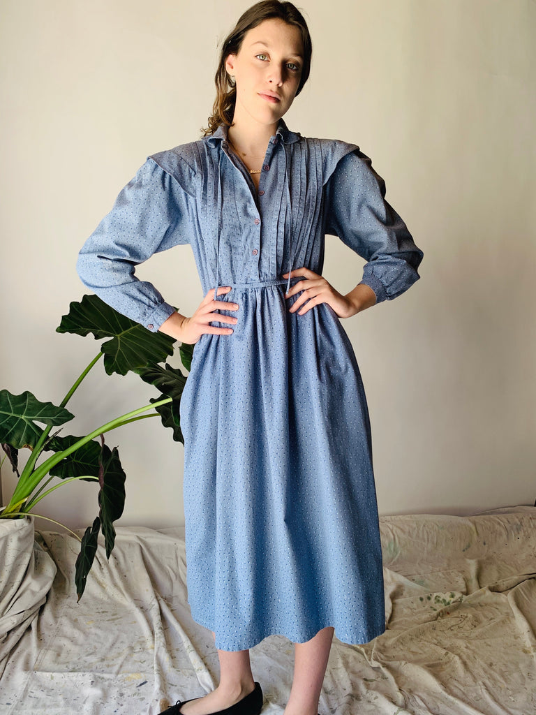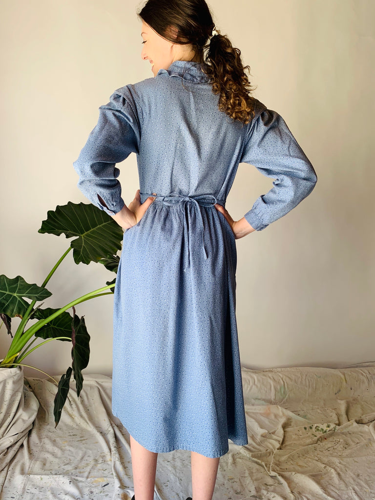 1970/80’s calico printed, brushed-cotton prairie midi-length dress. Distinctly feminine style with pleated chest, ruffles at neck, flared collar and shoulder detailing. Attached ties in same fabric at waist and neck. Wear ties or loose for a different overall vibe. Side pockets and buttons at front. Simple pullover style.