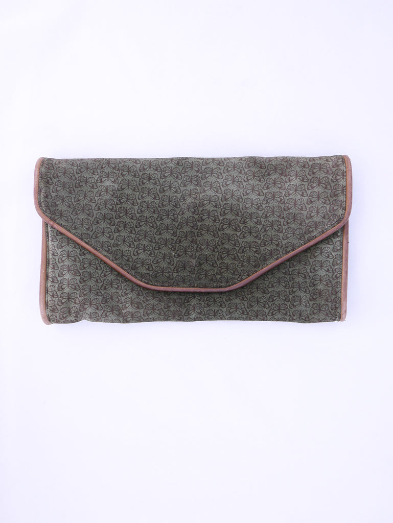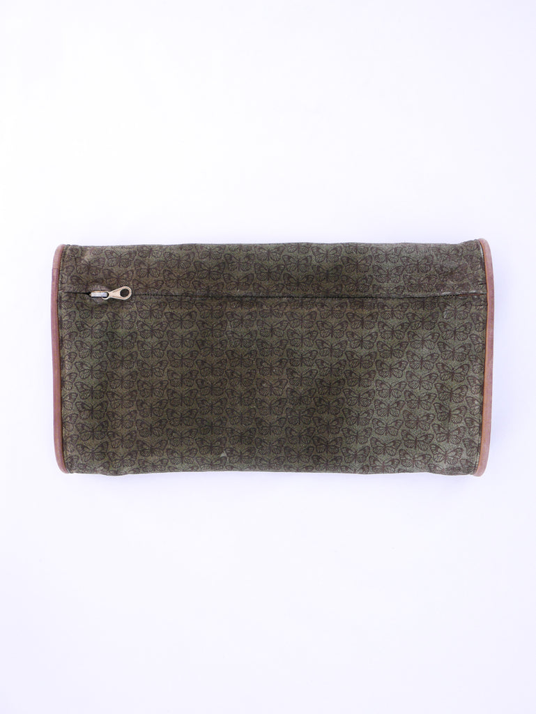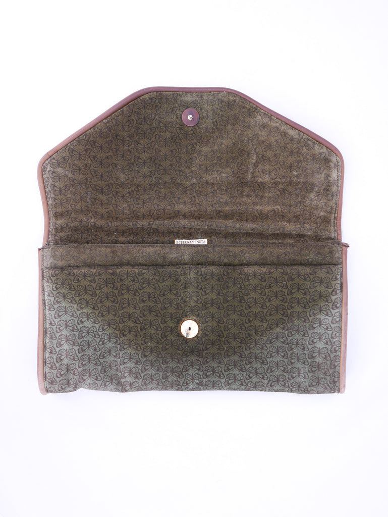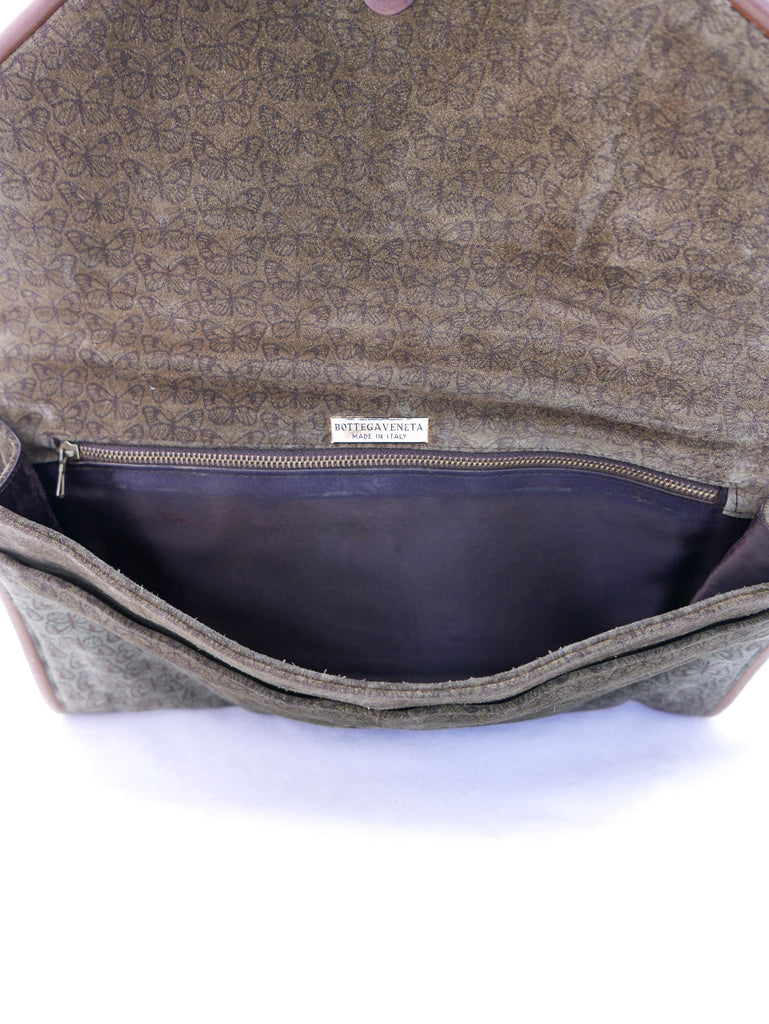 Butterfly printed suede envelope clutch purse by Bottega Veneta. Zipper compartments on inside and at back of bag. Leather piping trim accent.