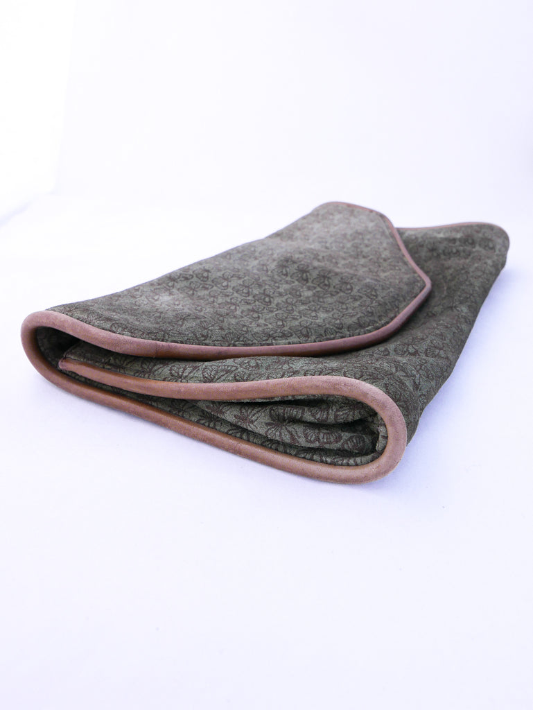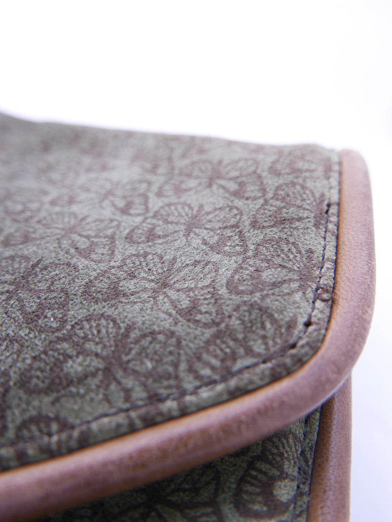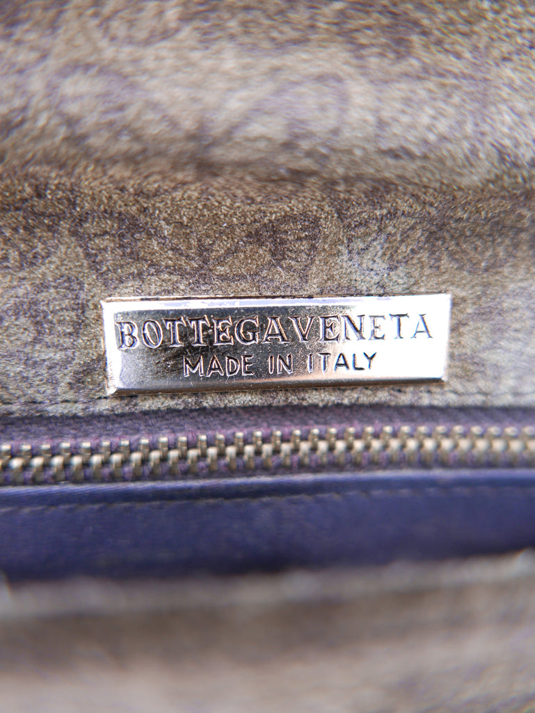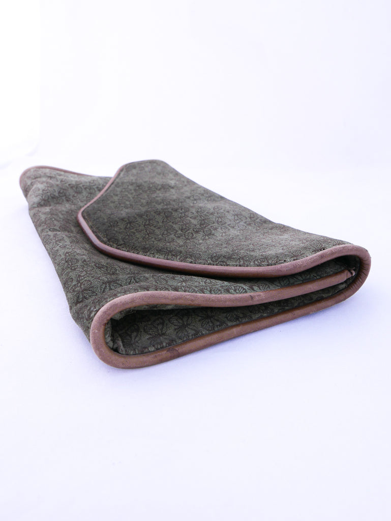 Butterfly printed suede envelope clutch purse by Bottega Veneta. Zipper compartments on inside and at back of bag. Leather piping trim accent.