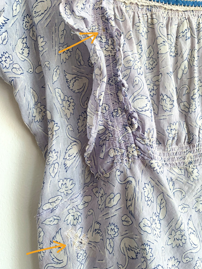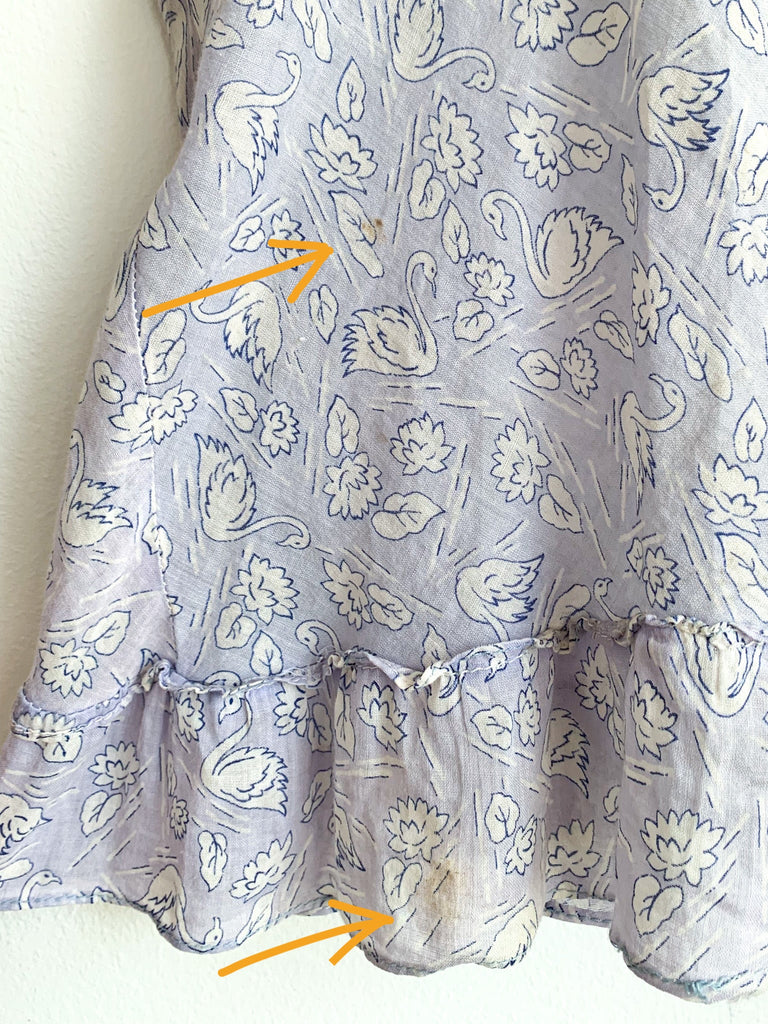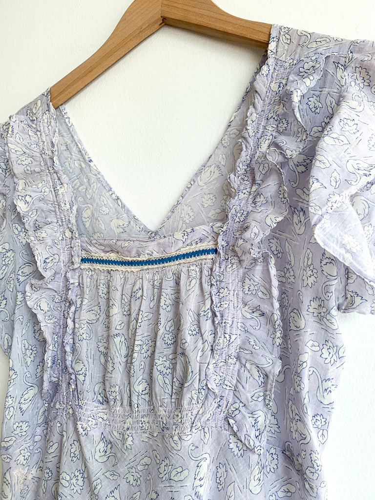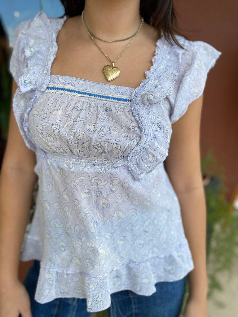 Sweetest ruffle and smocking details, swan printed fabric top.