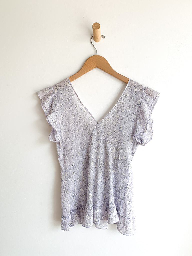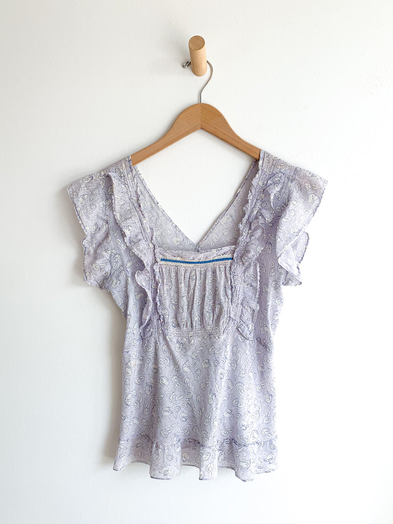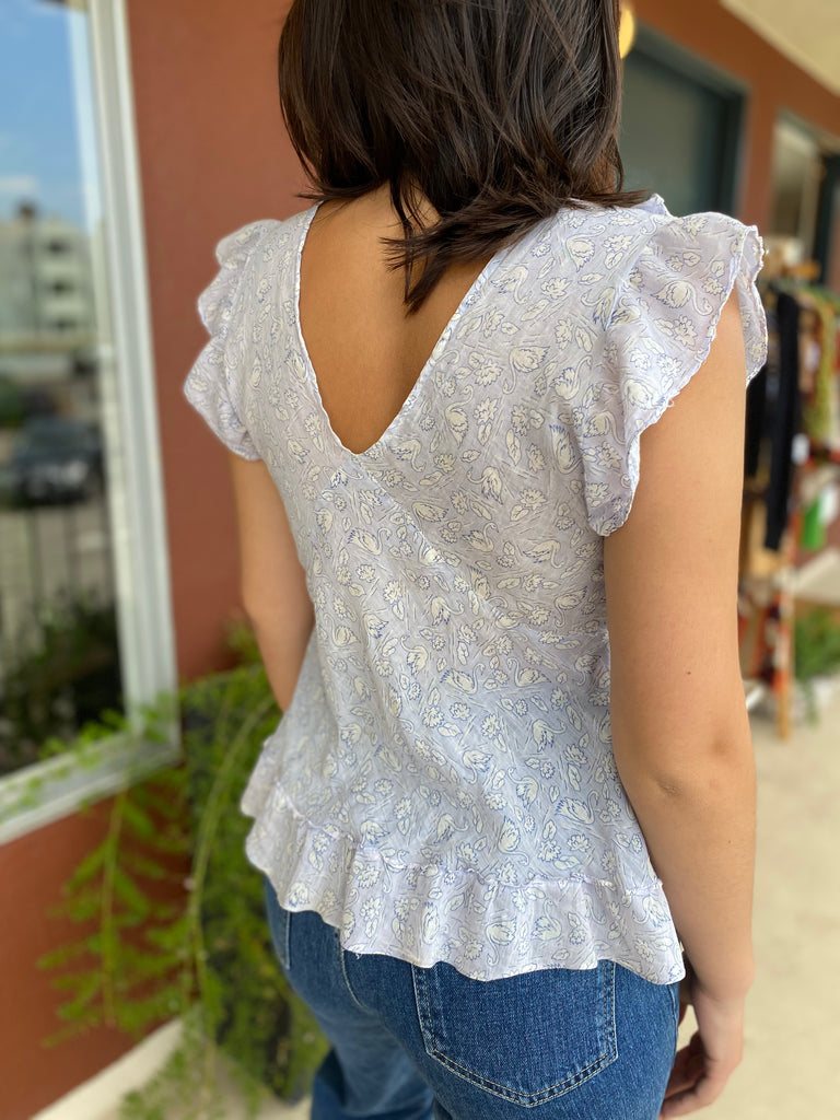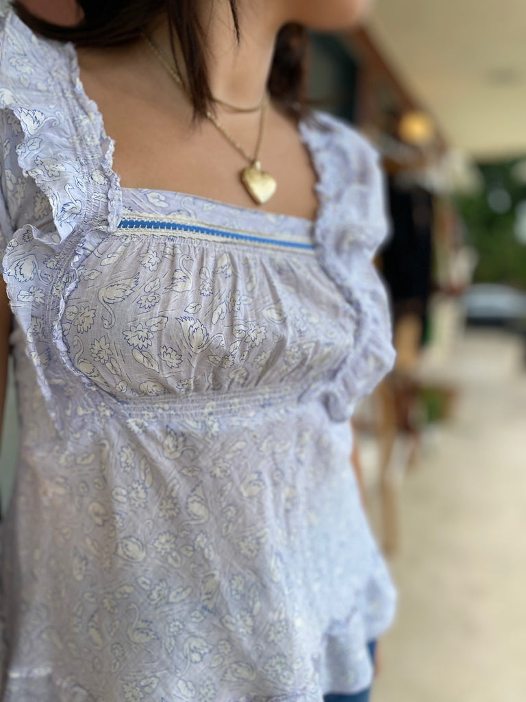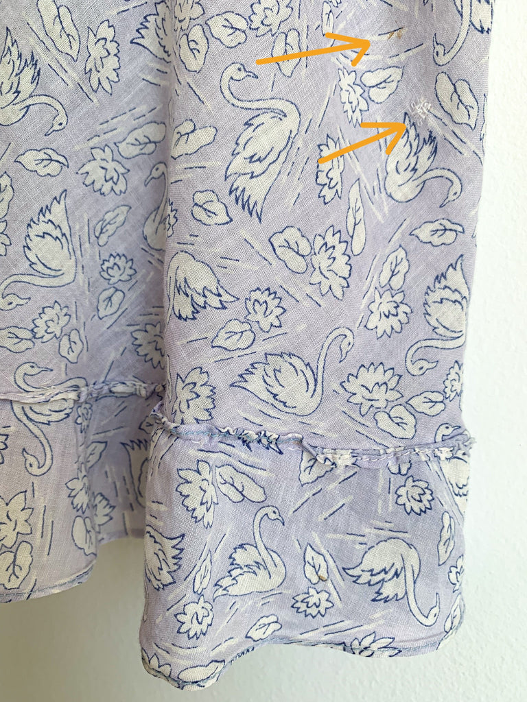Sweetest ruffle and smocking details, swan printed fabric top.