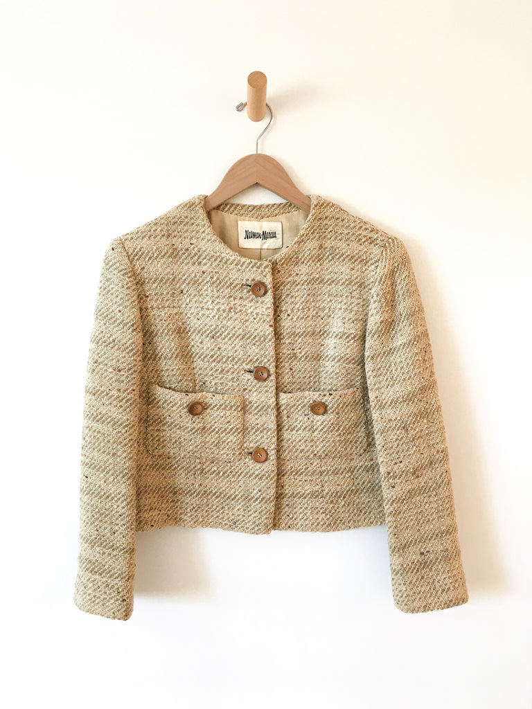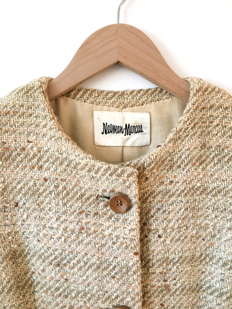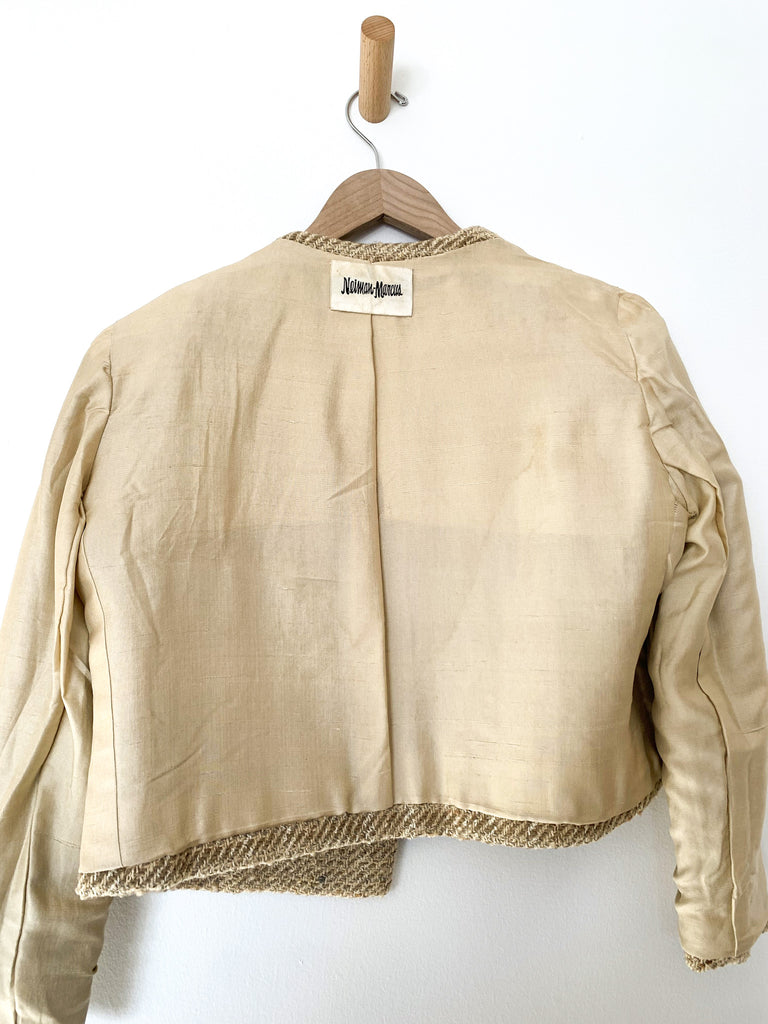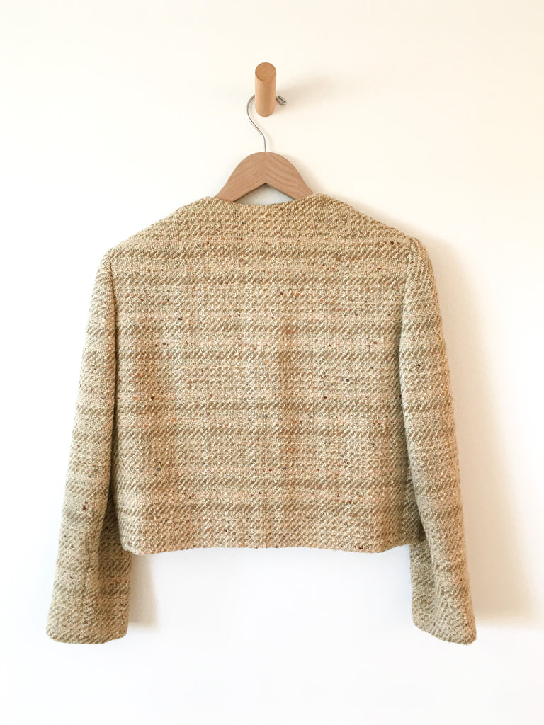 Classic woven wool, linen, silk blend cropped blazer jacket in neutral flax shades. Wood buttons up front and at open pockets. Fully lined in neutral ivory raw silk.