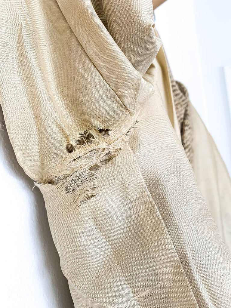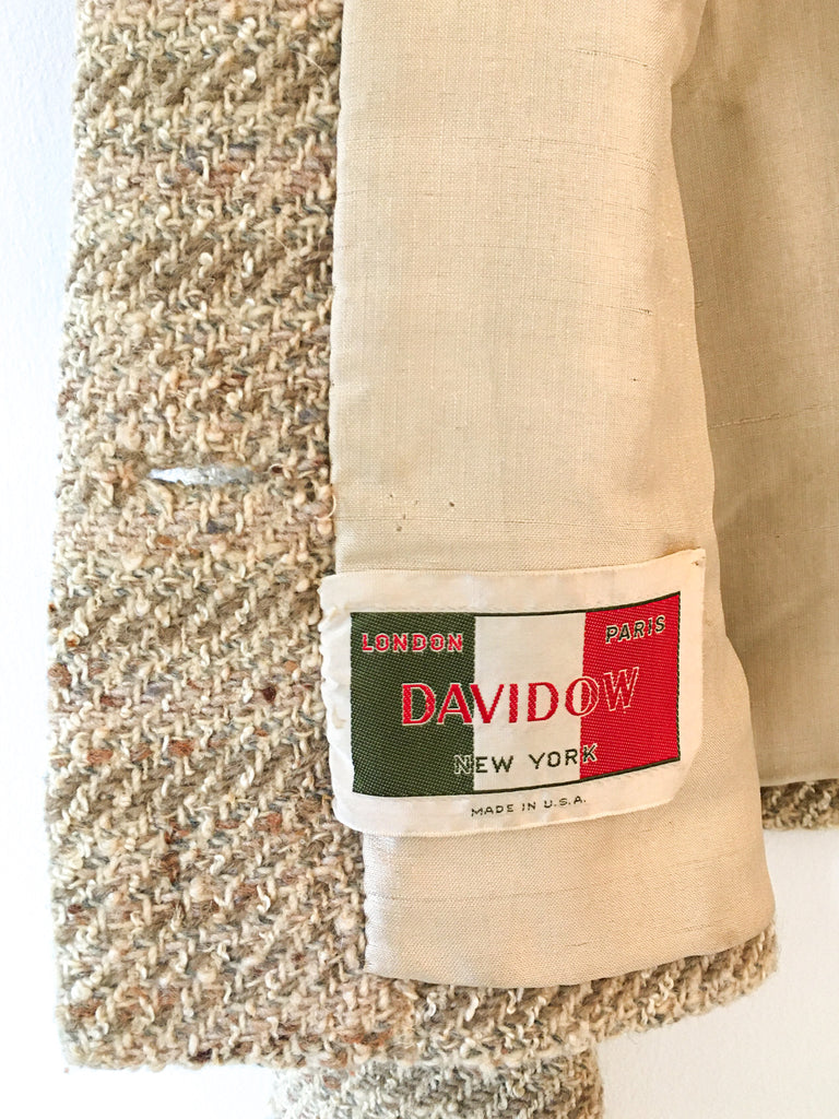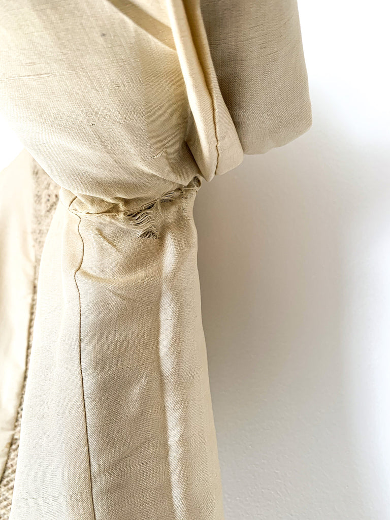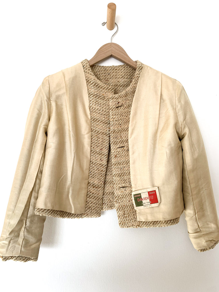 Classic woven wool, linen, silk blend cropped blazer jacket in neutral flax shades. Wood buttons up front and at open pockets. Fully lined in neutral ivory raw silk.