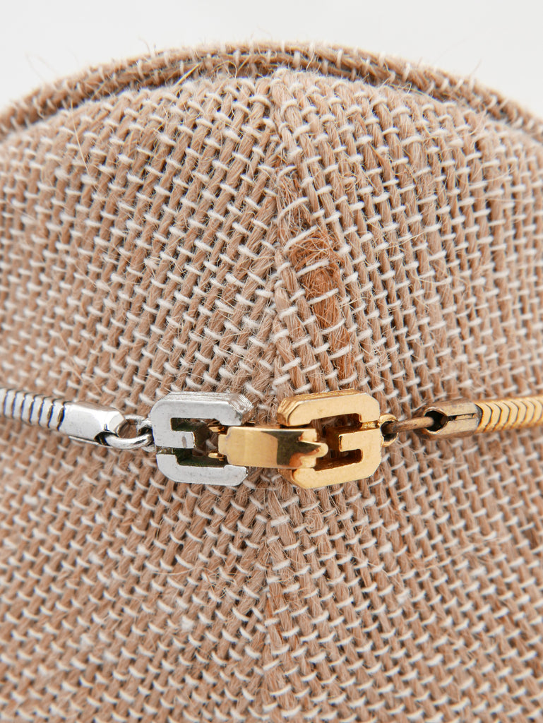 Any opportunity to mix gold and silver is a win in our book! Can’t decide? Wear both and this Givenchy necklace is the perfect statement piece giving a heavy nod to the late 1970’s modern disco influences. GG logo clasp.