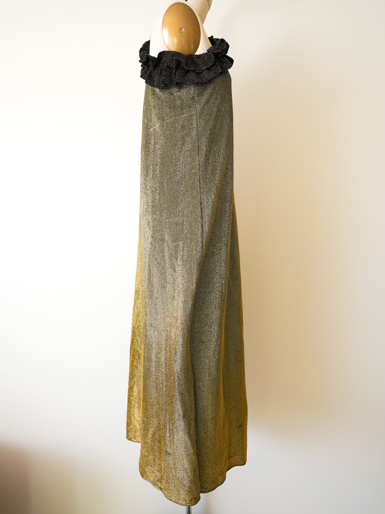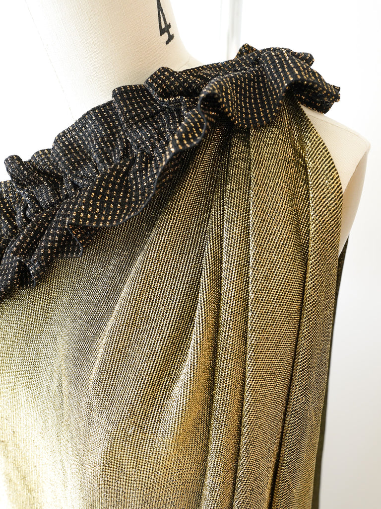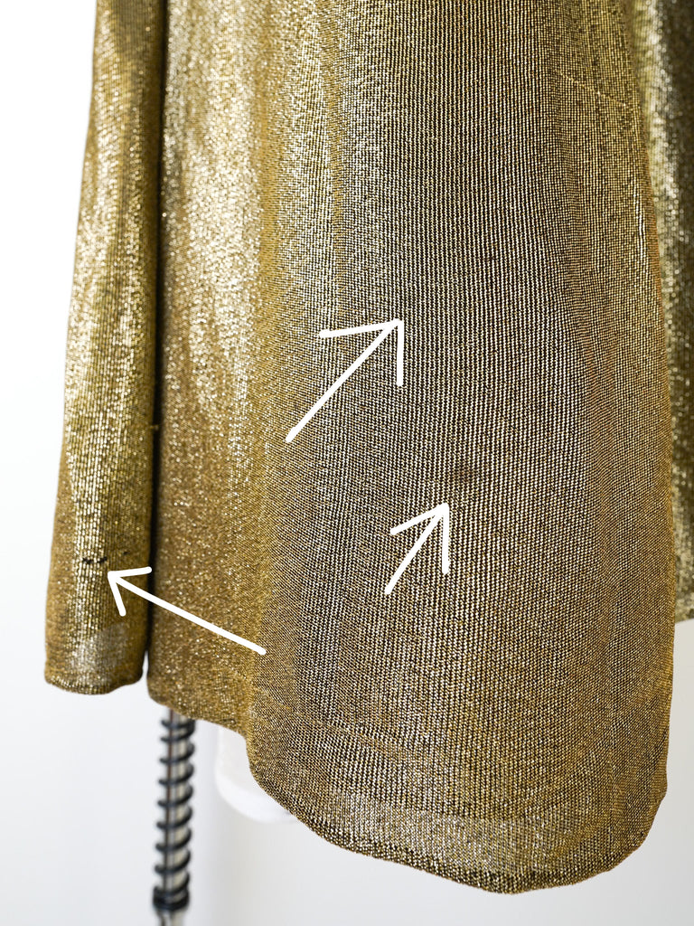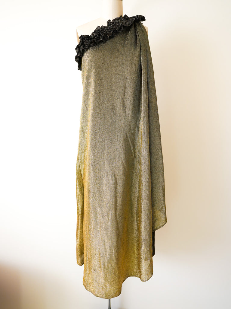 Iconic one shoulder gold lamé dress. We think this one had a life of partying at Studio 54. She’s definitely not perfect, but she kinda is.